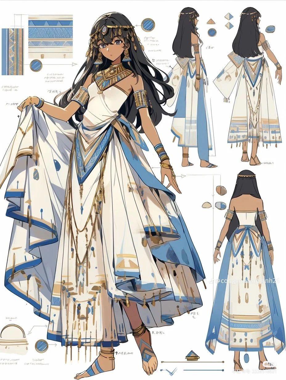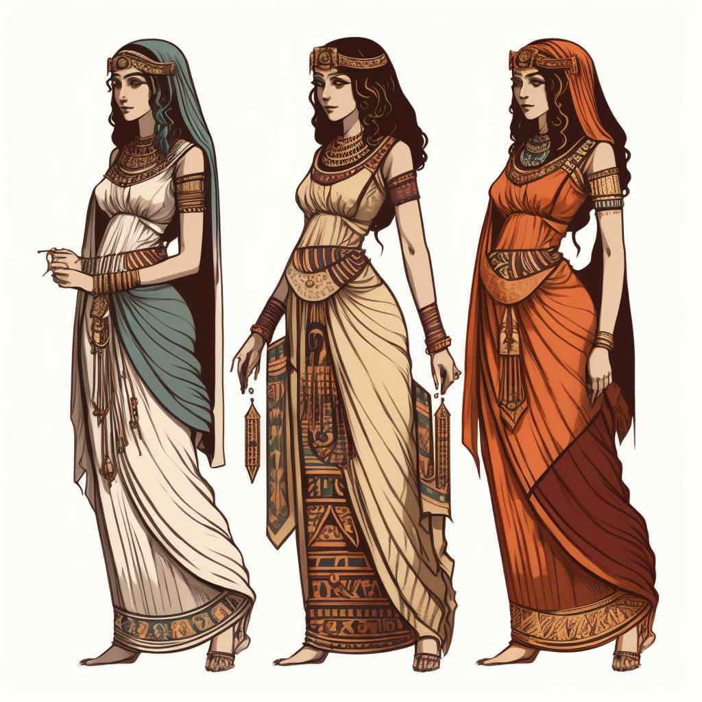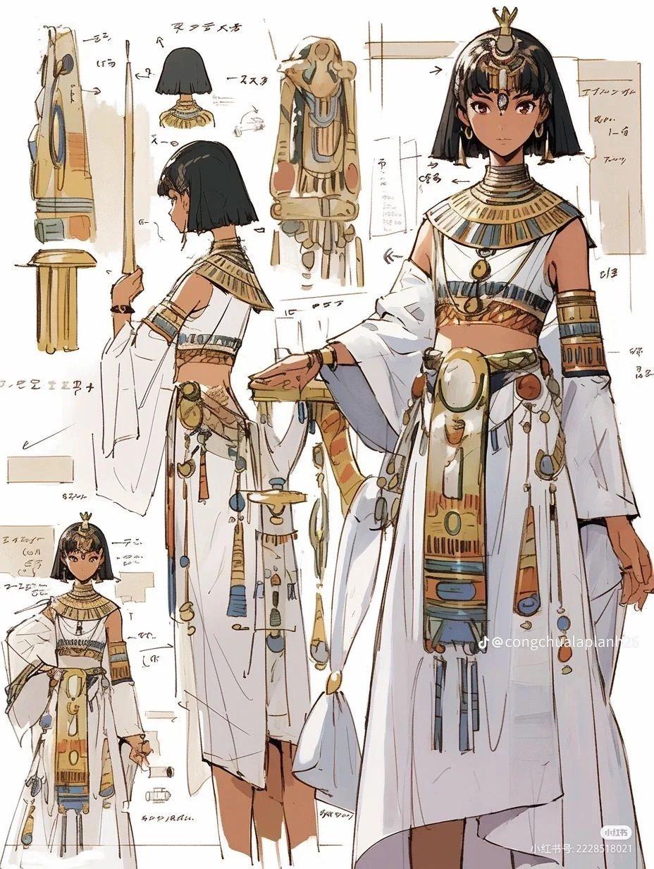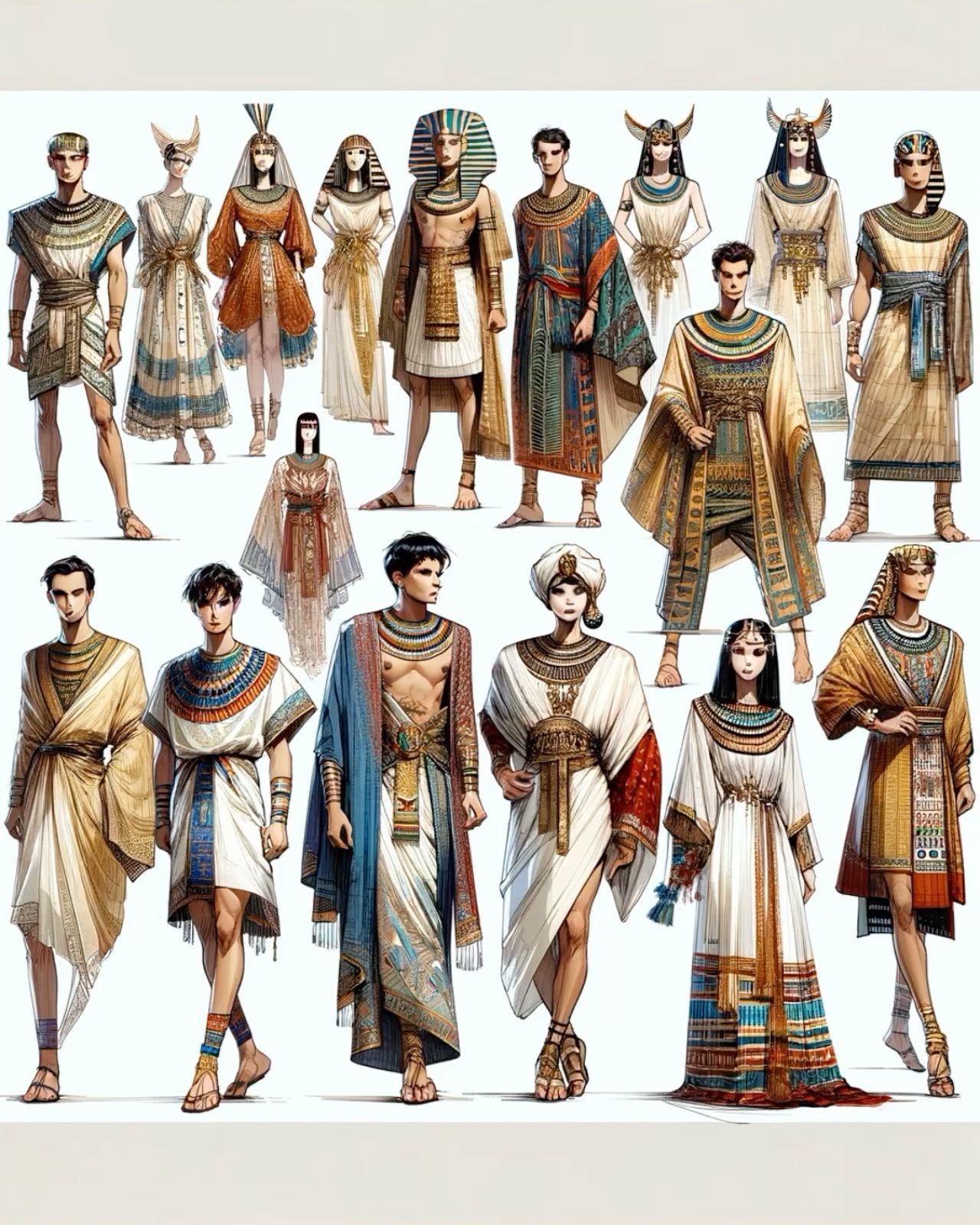 Египетская одежда как отражение социальной иерархии и культурных традиций представляет собой богатую тему для художественного исследования. В иллюстрациях предстает разнообразие нарядов - от простых льняных одежд простолюдинов до роскошных золототканых одеяний фараонов. Художники мастерски передают текстуру материалов: тонкий лен, тяжелый золотой парч, драгоценные камни в украшениях. Разнообразие стилей включает академические рисунки с анатомической точностью, декоративные композиции в духе древних фресок, современные интерпретации с элементами моды. Особое внимание уделяется символизму - цвета как отражение статуса, украшения как знаки власти, головные уборы как религиозные символы. Коллекция охватывает различные эпохи древнеегипетской истории, показывая эволюцию моды от Древнего царства до эпохи Птолемеев.