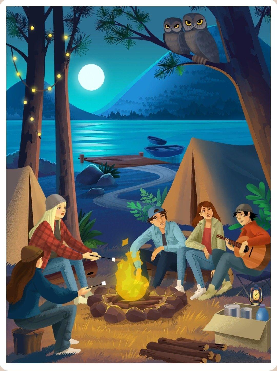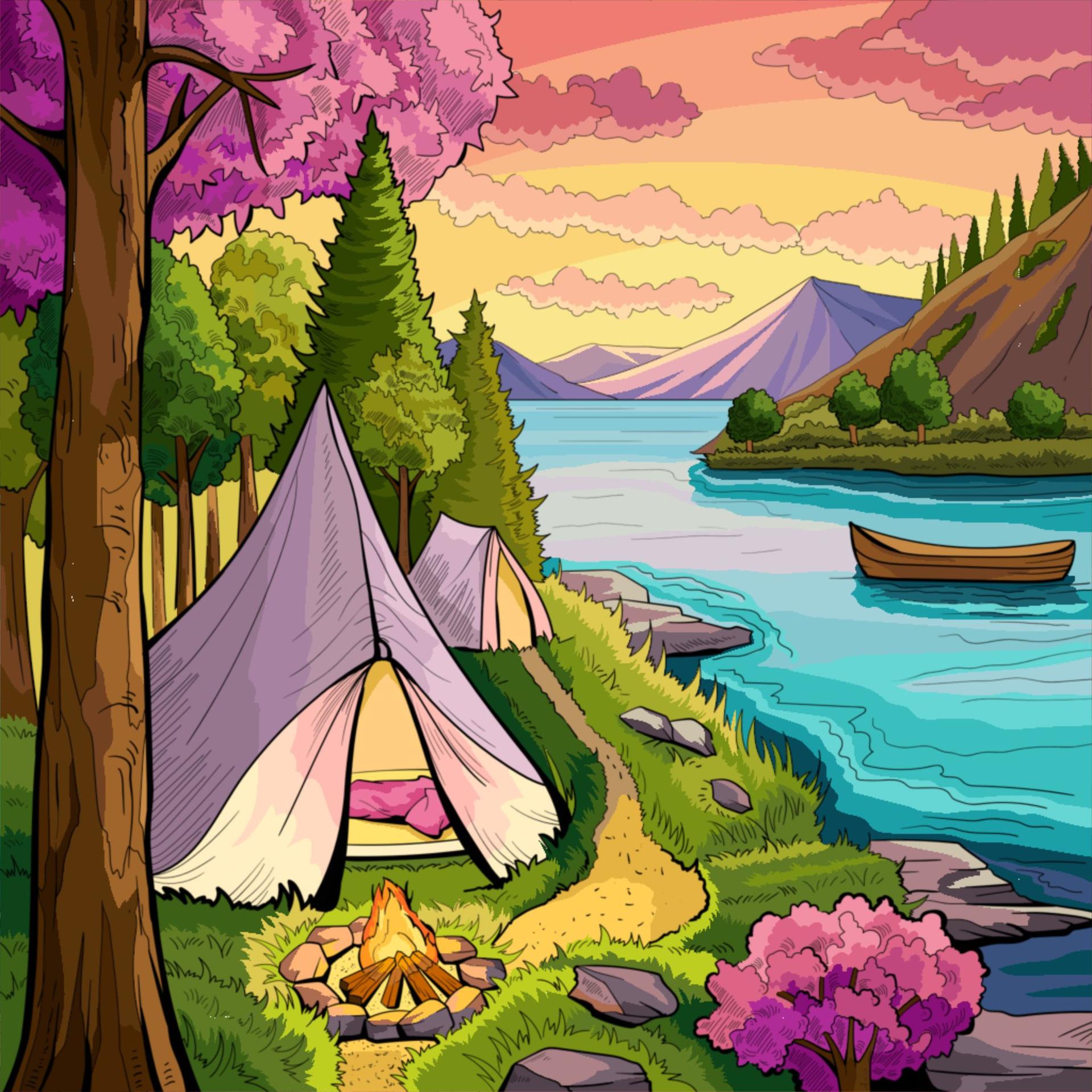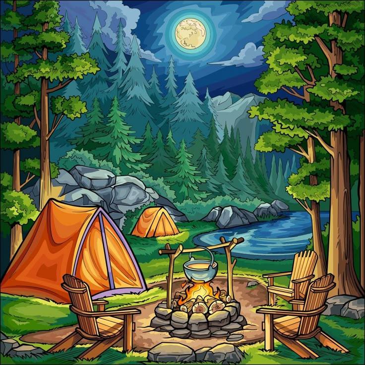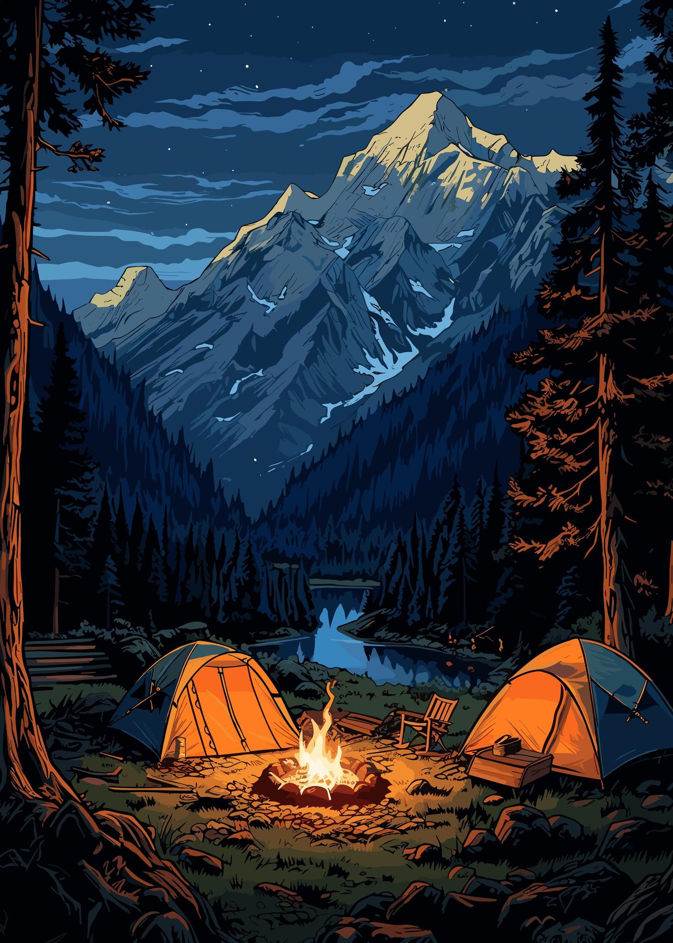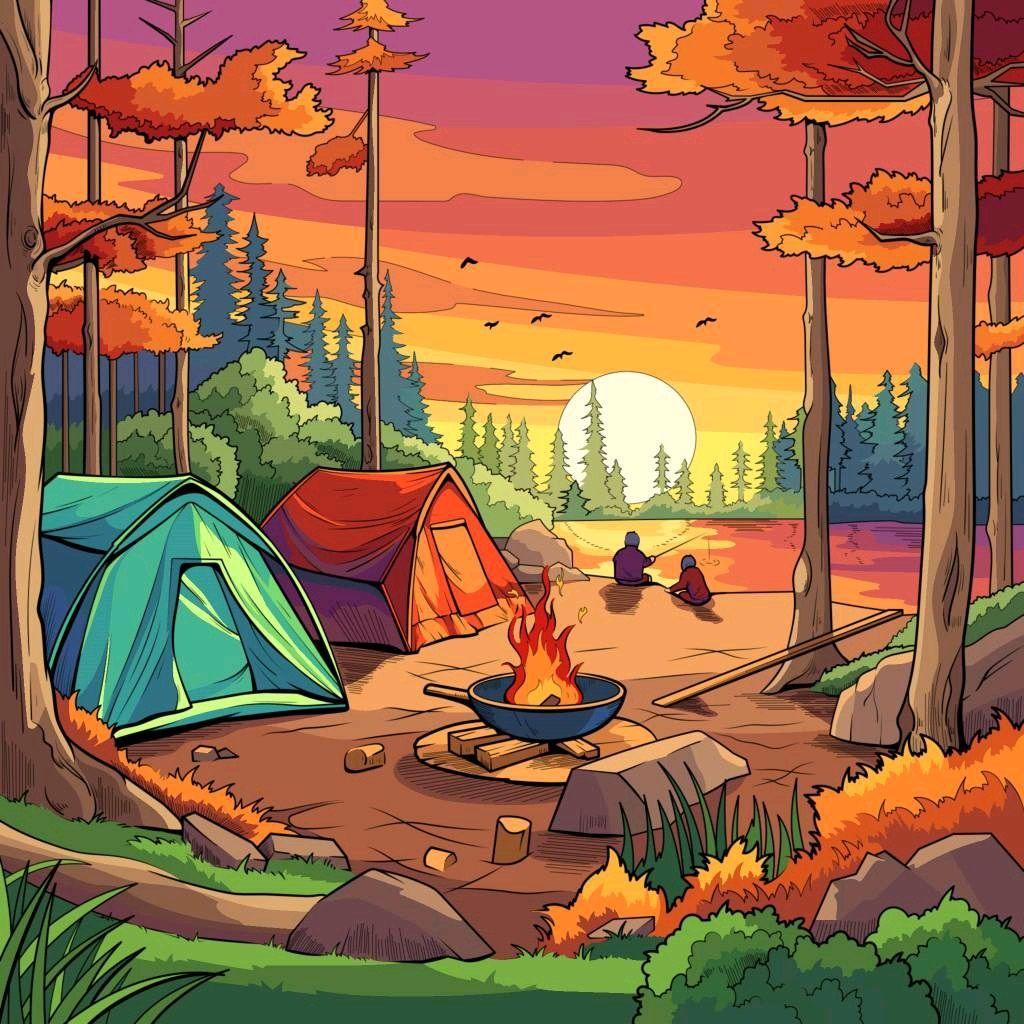 Кемпинг - это возвращение к истокам, где палатка и костер заменяют комфорт цивилизации. Эти иллюстрации показывают атмосферу приключений: установку лагеря, приготовление пищи на огне, ночные посиделки. Художники передают романтику дикой природы и camaraderie. Композиции включают лесные пейзажи, туристическое снаряжение, звездное небо. Тематические элементы охватывают outdoor-культуру, выживание в природе, медитацию. Каждая работа рассказывает о поиске внутреннего покоя через общение с природой.