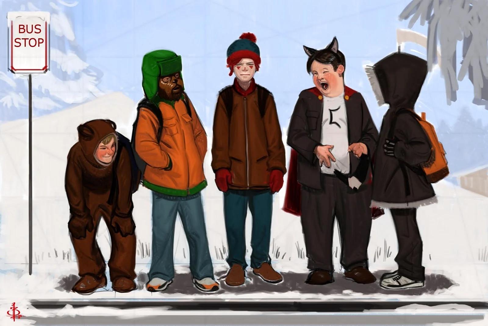 Школьная жизнь в маленьком городке Саус Парк предстает в этих остроумных иллюстрациях, где детская непосредственность сталкивается с абсурдностью взрослого мира. Художники мастерски передают атмосферу хаотичного обучения, где уроки истории перемежаются космическими вторжениями, а школьные обеды становятся полем битвы. Арты раскрывают характеры персонажей через их реакции на повседневные ситуации: от скучающих учеников на уроках до эпичных сражений на школьном дворе. Тематические элементы включают классные доски, парты, школьные автобусы и неожиданных гостей из параллельных миров. Эти изображения идеально отражают дух сатиры, высмеивая недостатки системы образования.