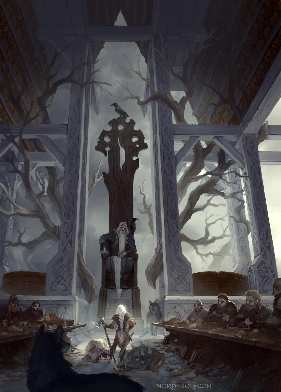 Совнгард предстает как вершина воинской славы - зал в Асгарде, где павшие герои пируют в ожидании Рагнарёка. Эти иллюстрации воссоздают атмосферу скандинавской Валгаллы: длинные столы с яствами, воины в доспехах, Один с вороном на плече. Художники подчеркивают героический дух - шрамы от битв, кубки с медом, оружие у стен. Композиции передают атмосферу вечного праздника: песни скальдов, состязания в силе, истории о подвигах. Некоторые работы показывают прибытие новых героев - эйнхерии, приветствующие павших братьев. Эти изображения отражают ценности викингов: честь, храбрость, верность, где смерть в бою - высшая награда, ведущая в чертоги бессмертных.
