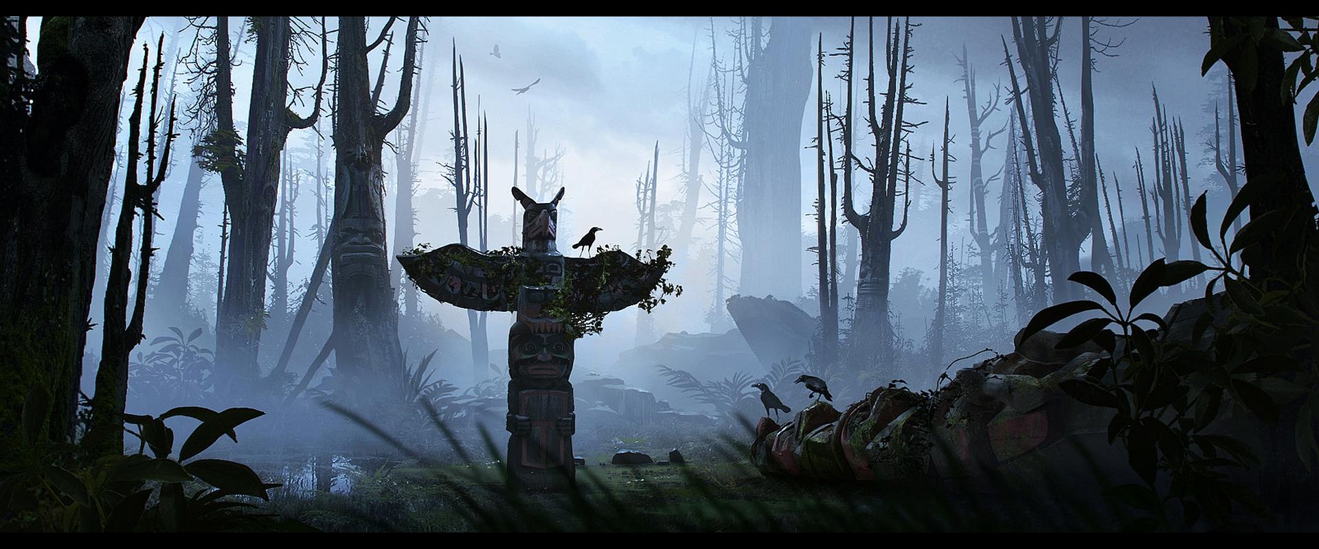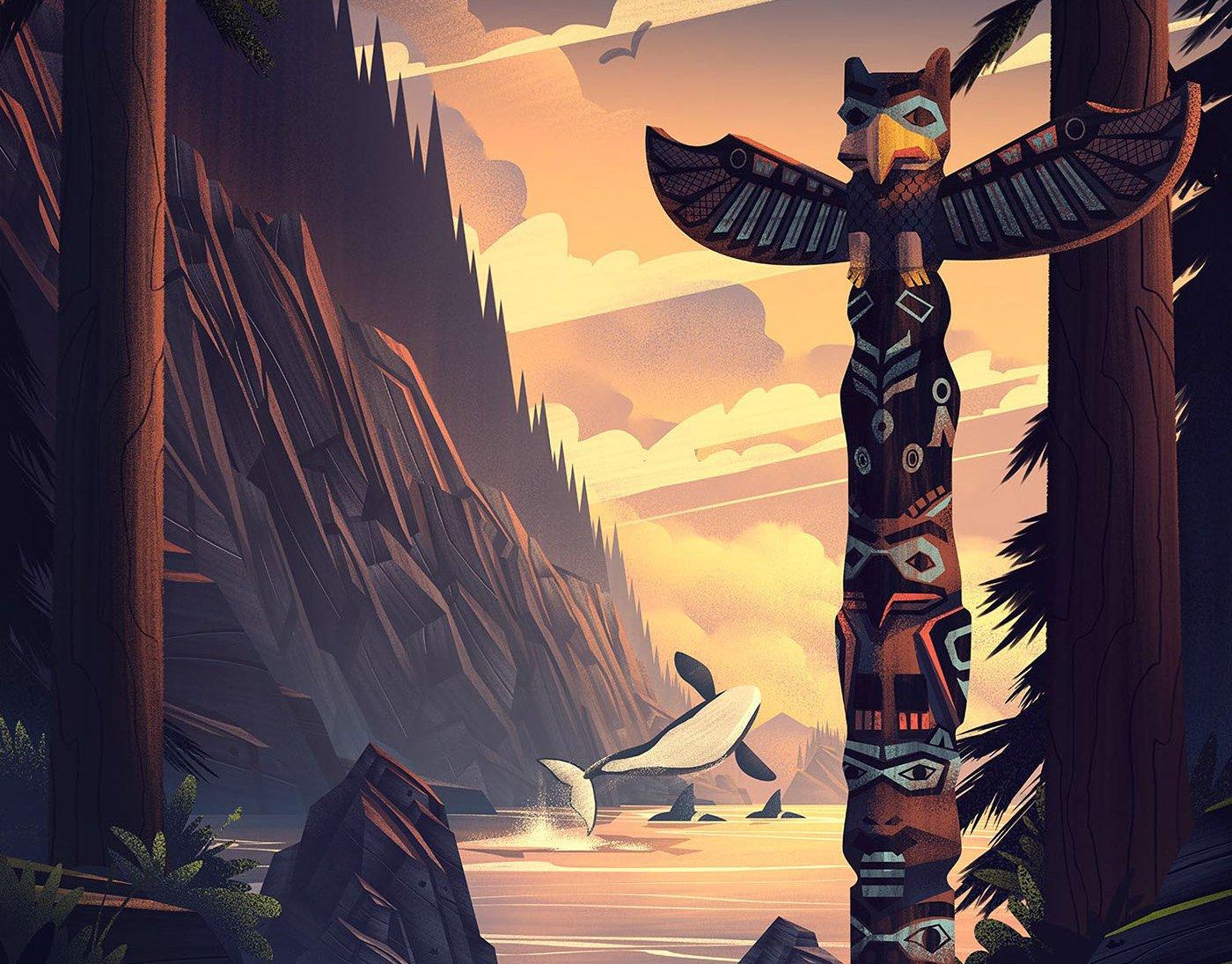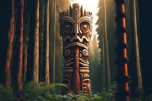 Духовный мир оживает в образах тотемов с их резными фигурами и символами. Древние традиции воплощаются в деревянных скульптурах, хранящих истории племен. Художник использует натуральные текстуры, подчеркивающие ремесло. Фигуры животных и духов символизируют связь с природой. Фон композиции представляет густой лес с туманом. Цветовая палитра состоит из землистых тонов. Этот арт воплощает темы духовности, традиций и уважения к предкам. Детали резьбы тщательно проработаны, отражая культурную аутентичность. Композиция создает атмосферу мистики и почтения.