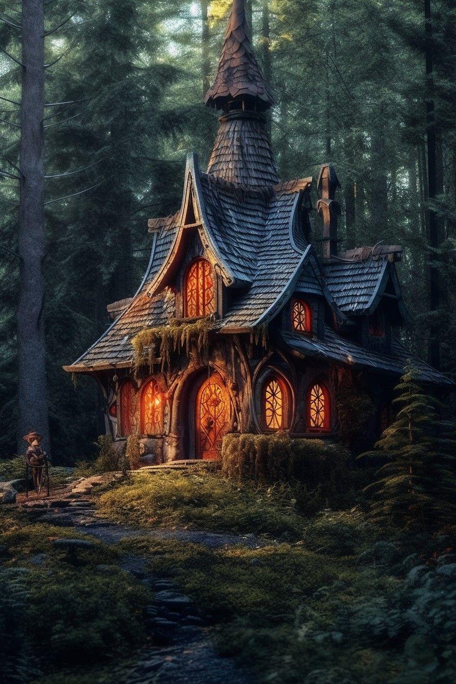 В сердце дремучего леса стоит ведьмин дом - воплощение древней магии и таинственных ритуалов. Покосившиеся стены из потемневшего дерева хранят секреты поколений колдуний. Крыша поросла мхом и лишайниками, сливаясь с окружающей природой. Художник мастерски передает атмосферу загадочности через тщательно проработанные детали. Дым из трубы вьется причудливыми узорами, а окна светятся таинственным светом. Фон композиции представляет густой лес с древними деревьями и туманом. Этот арт сочетает элементы ужаса и очарования, раскрывая двойственную природу магии. Каждая деталь несет в себе символизм и историю. Композиция приглашает зрителя в мир волшебных тайн и древних знаний.