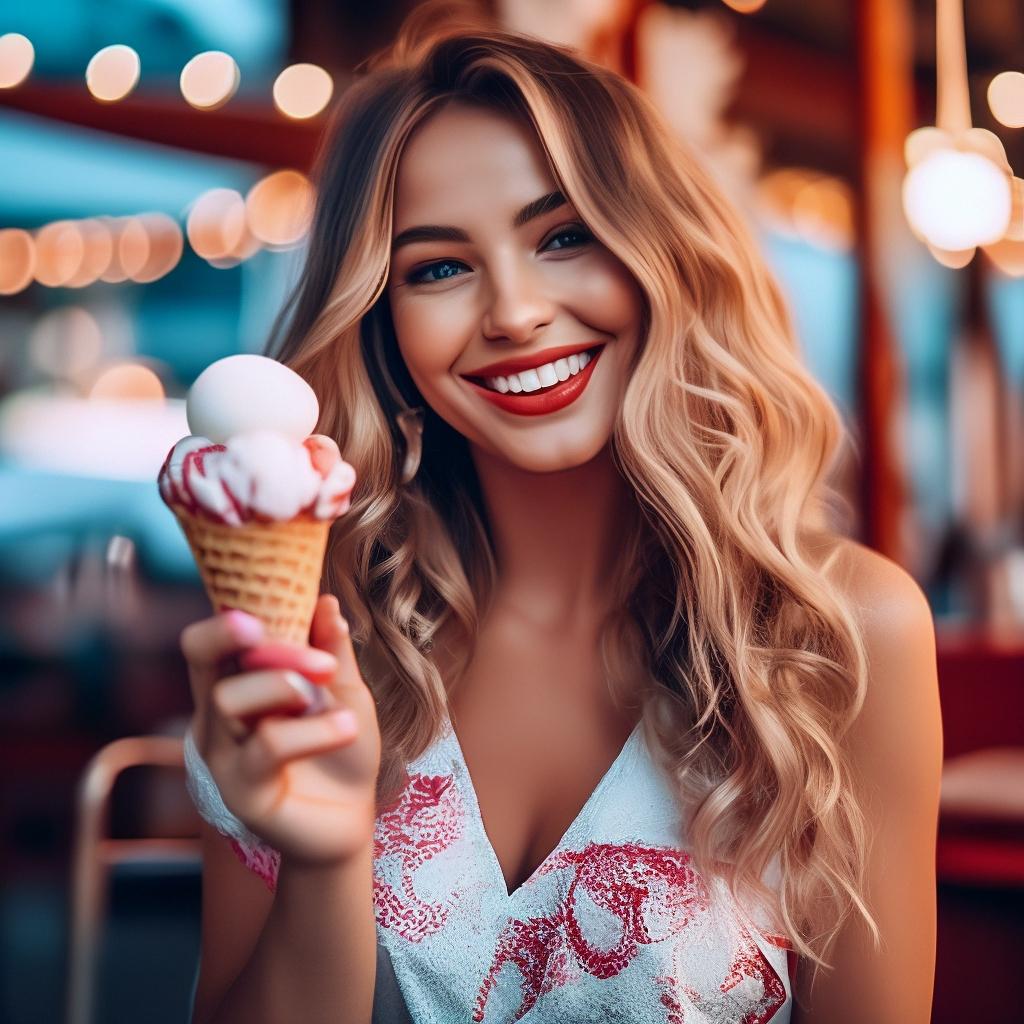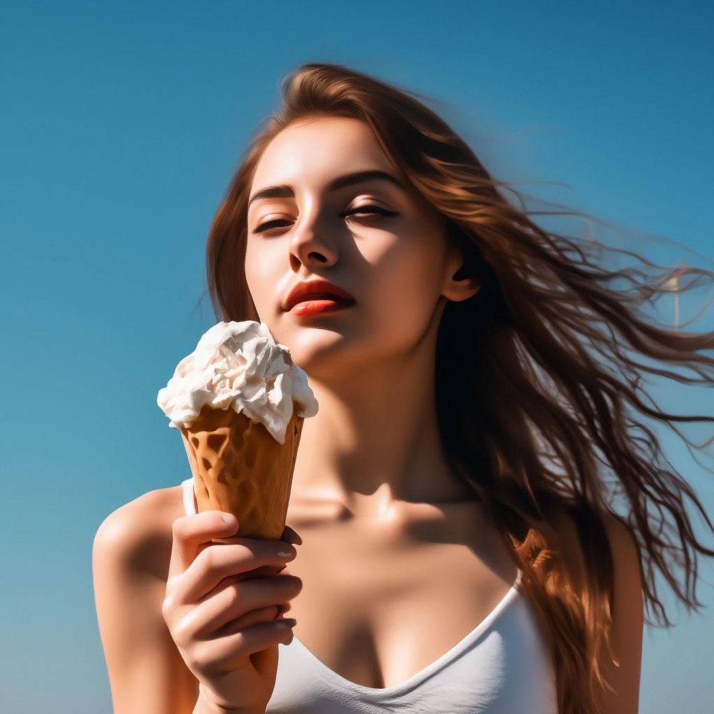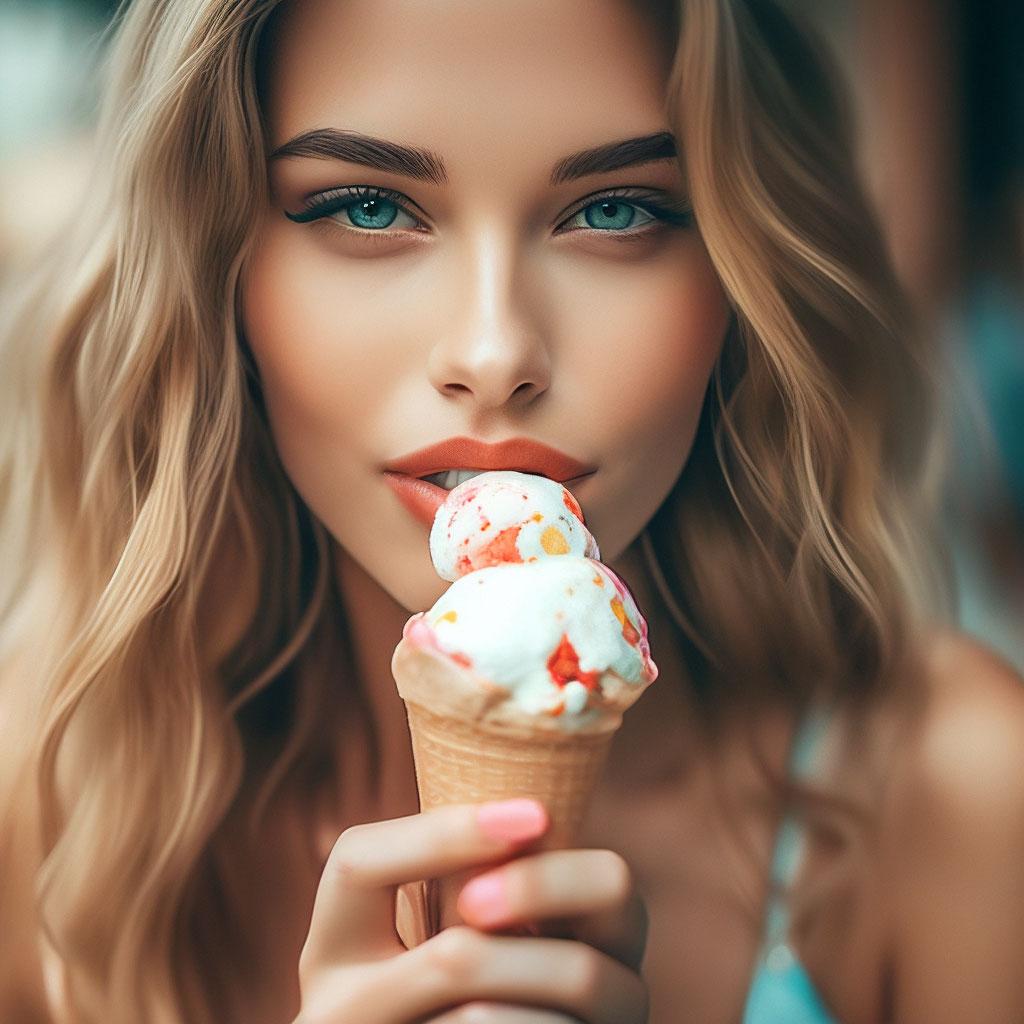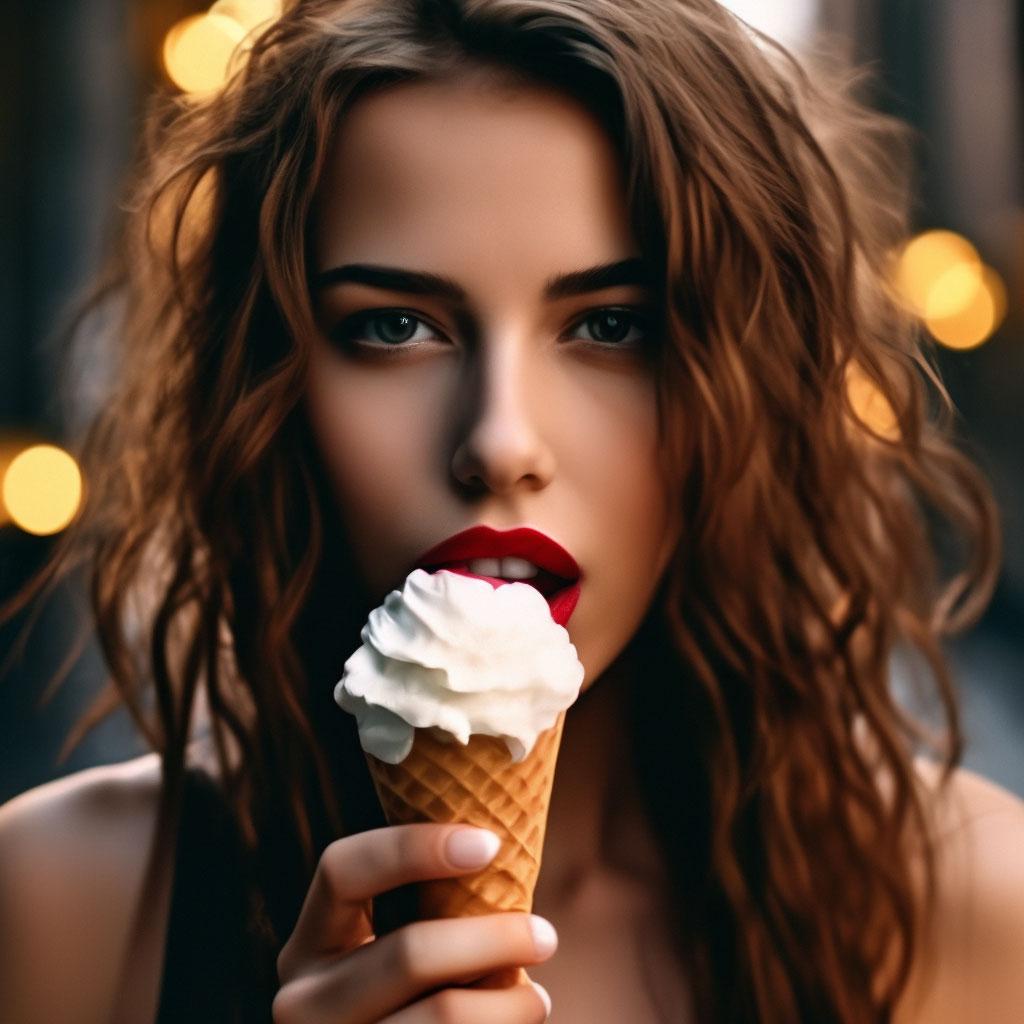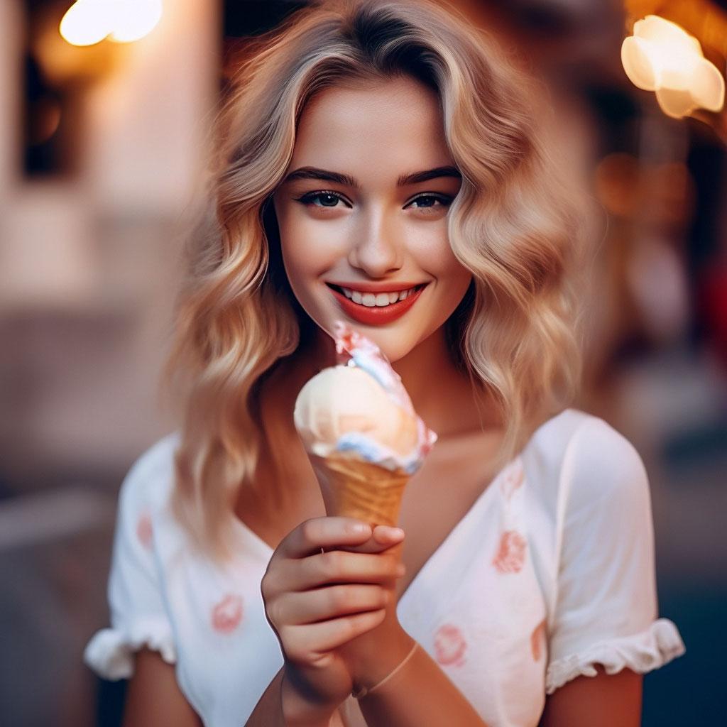 Мороженое становится звездой в этих вкусных фотографиях девушки, чье лицо выражает наслаждение и удовольствие. Она держит вафельный стаканчик, ее губы касаются холодного лакомства. Каждый кадр передает атмосферу лета и детской радости. Девушка то слизывает мороженое, то улыбается счастливо. Фотографии рассказывают о простых радостях жизни. Ее глаза блестят, щеки розовеют. Эти иллюстрации вдохновляют на наслаждение моментами. Каждая картинка - это момент счастья. Девушка воплощает образ гурмана, полного вкусовых ощущений.