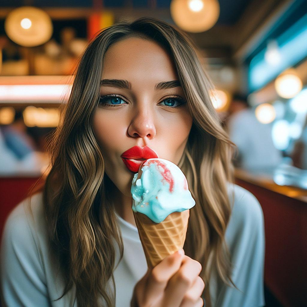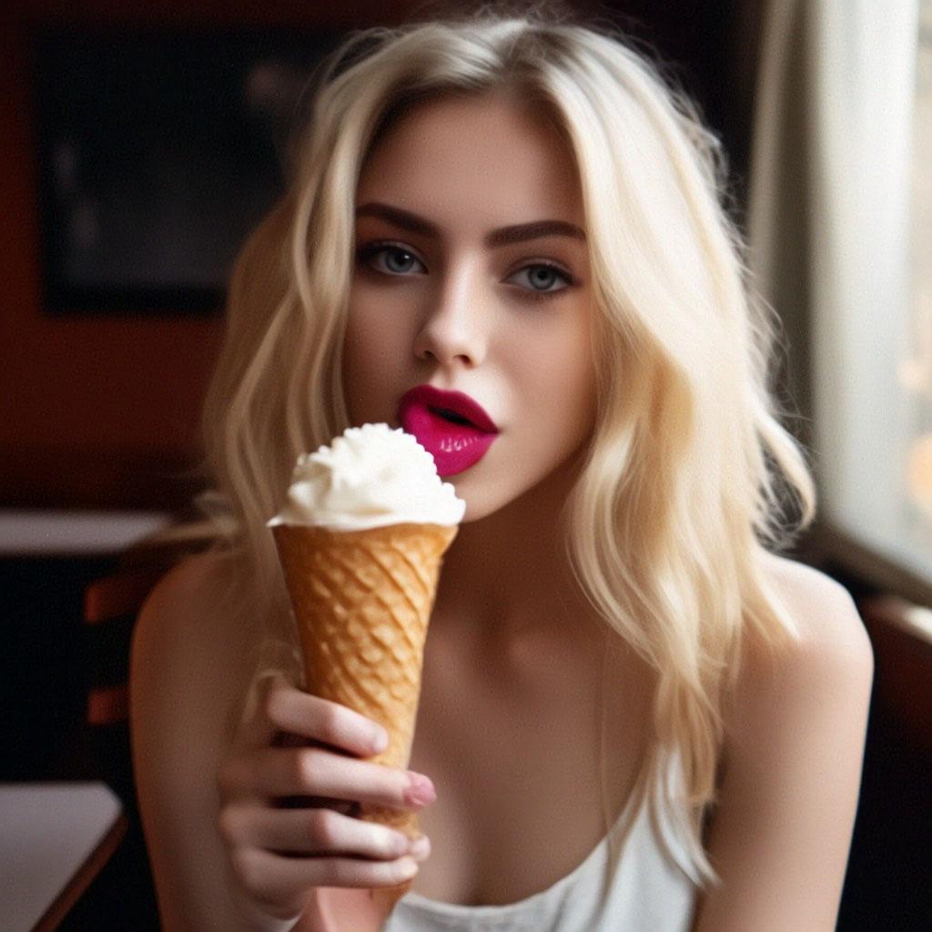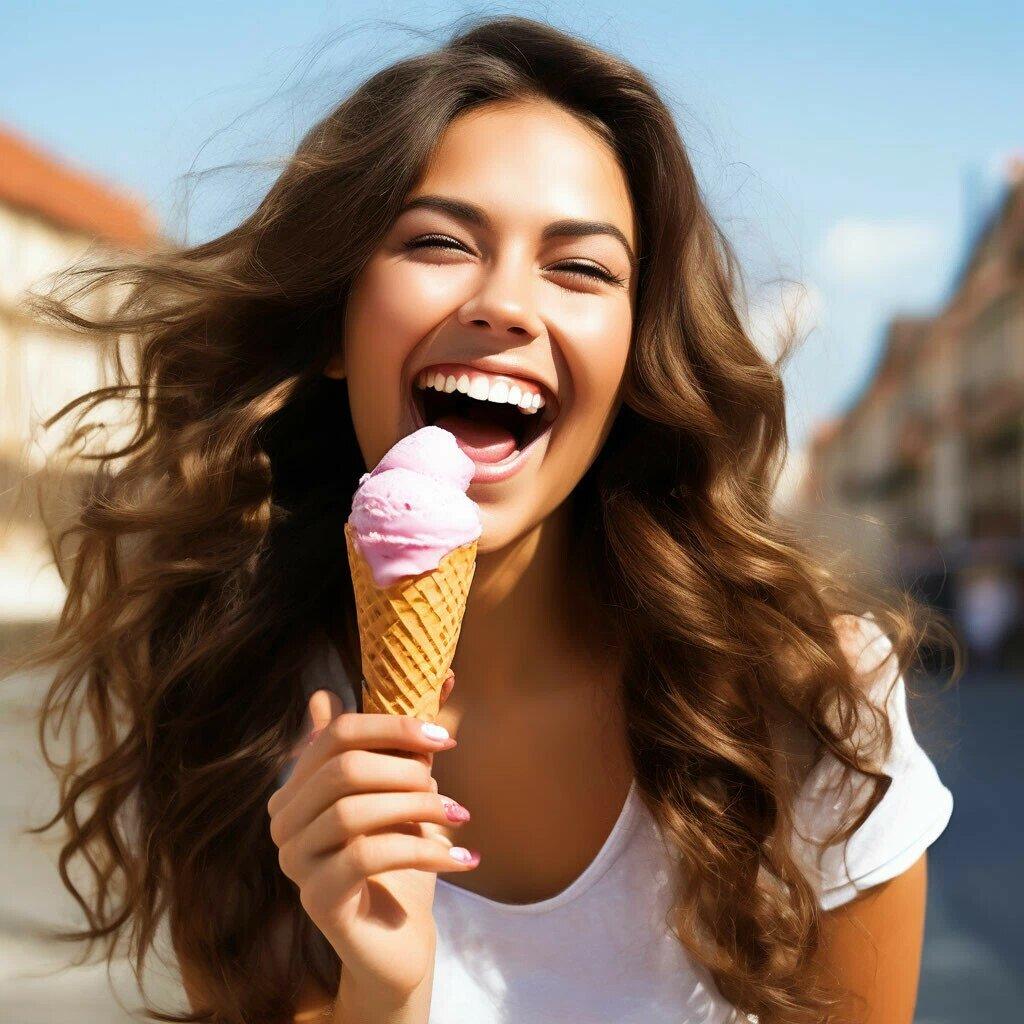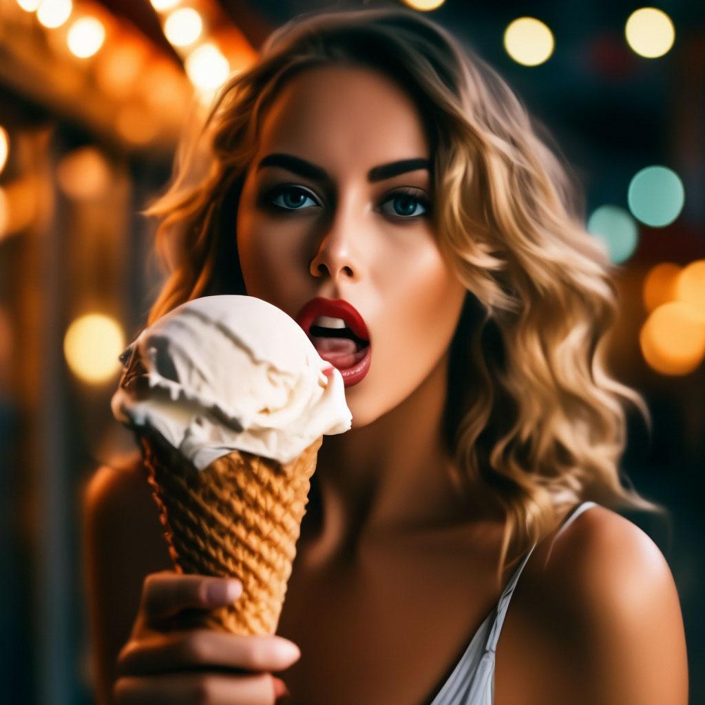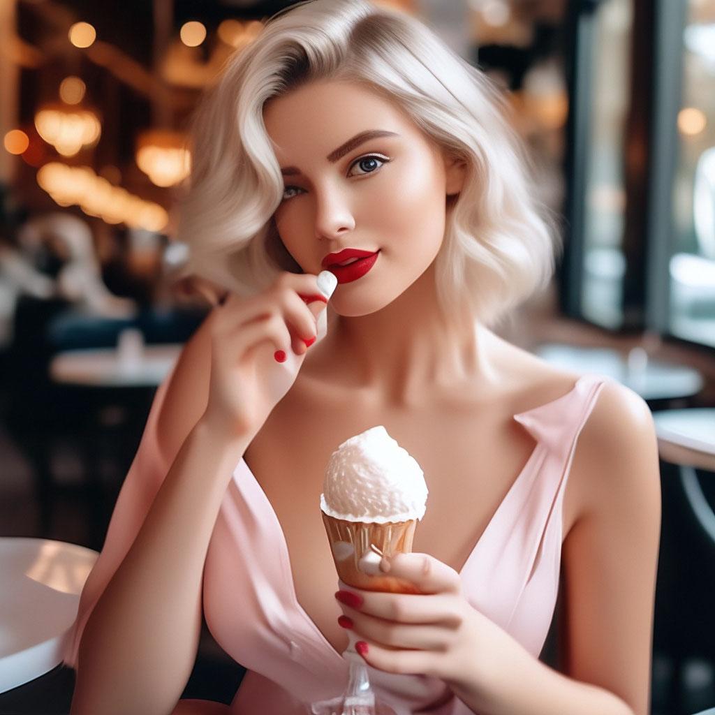 Мороженое становится звездой в этих вкусных фотографиях девушки, чье лицо выражает наслаждение и удовольствие. Она держит вафельный стаканчик, ее губы касаются холодного лакомства. Каждый кадр передает атмосферу лета и детской радости. Девушка то слизывает мороженое, то улыбается счастливо. Фотографии рассказывают о простых радостях жизни. Ее глаза блестят, щеки розовеют. Эти иллюстрации вдохновляют на наслаждение моментами. Каждая картинка - это момент счастья. Девушка воплощает образ гурмана, полного вкусовых ощущений.