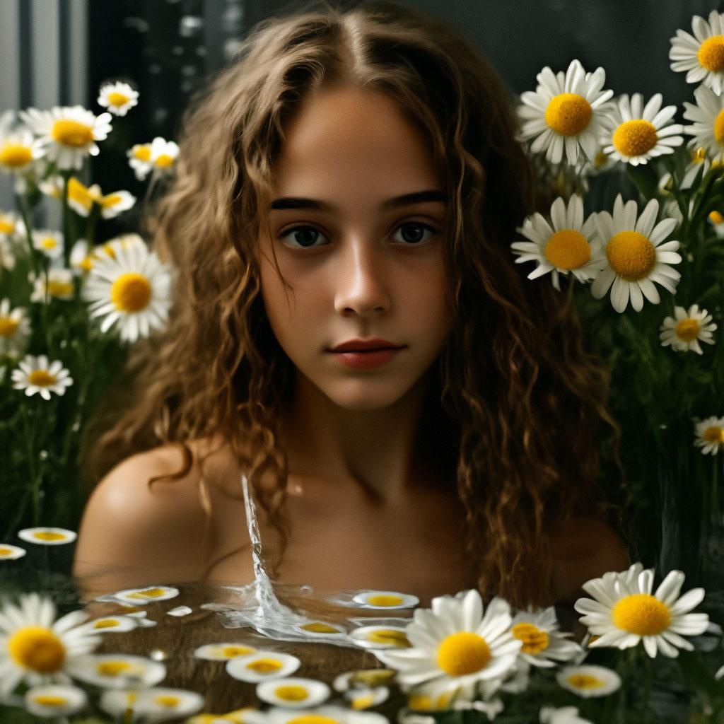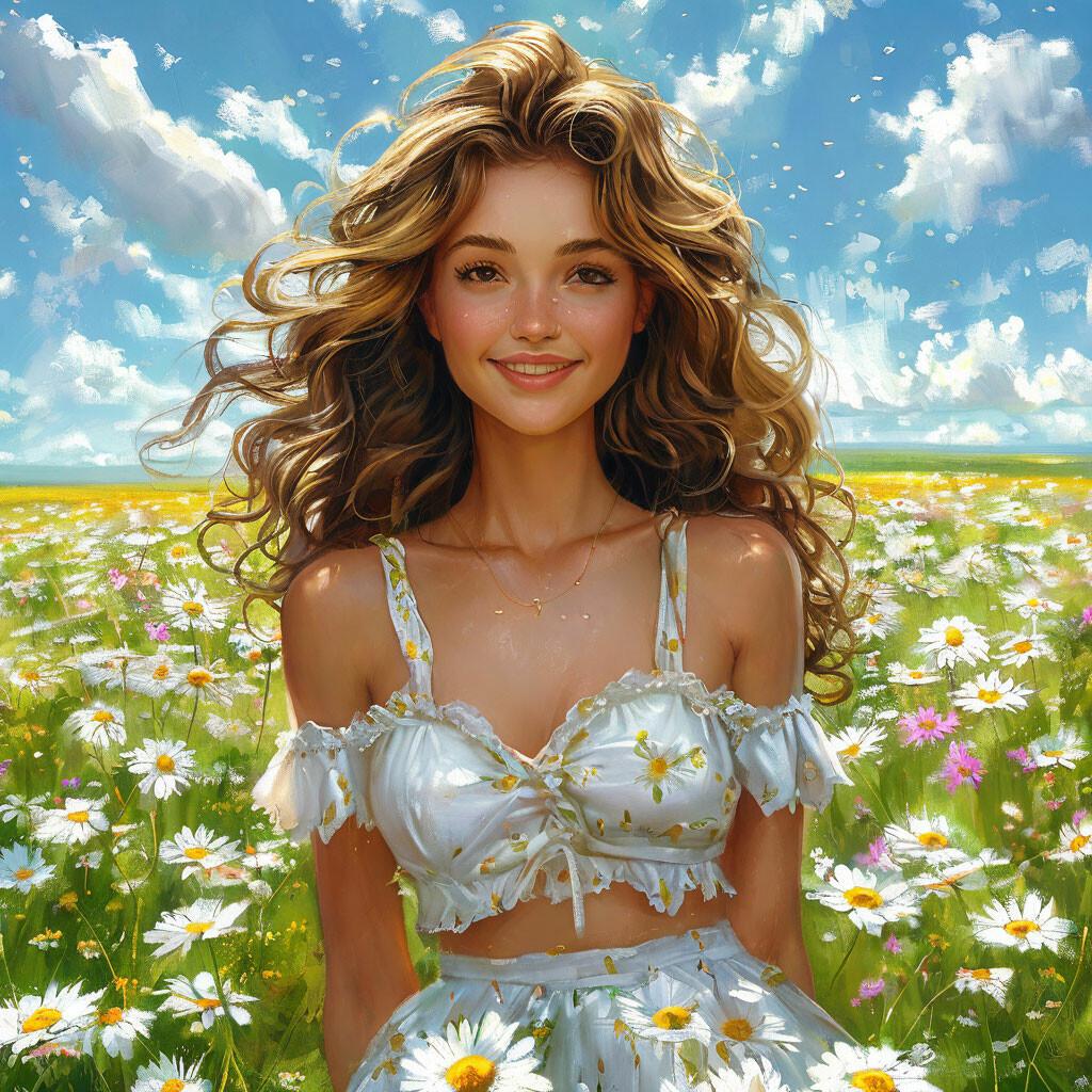 Ромашковое поле становится волшебной декорацией для портретов девушки, чья естественная красота гармонично сливается с природным окружением. Белые цветы контрастируют с ее темными волосами и ярким платьем, создавая живописную композицию. Она сидит на траве, обрывая лепестки и загадывая желания, или стоит в полный рост, раскинув руки навстречу солнцу. Каждый кадр дышит свежестью летнего утра и беззаботностью юности. Ее кожа покрыта легким загаром, а в глазах отражается чистота и искренность. Фотографии передают атмосферу детской непосредственности и взросления. Девушка то улыбается застенчиво, то смотрит мечтательно вдаль. Ромашки вплетаются в ее волосы, создавая естественный венок. Эти снимки напоминают о простых радостях жизни и красоте окружающего мира. Иллюстрации вдохновляют на прогулки на природе и размышления о быстротечности времени. Каждая картинка - это момент гармонии между человеком и природой, запечатленный для вечности.