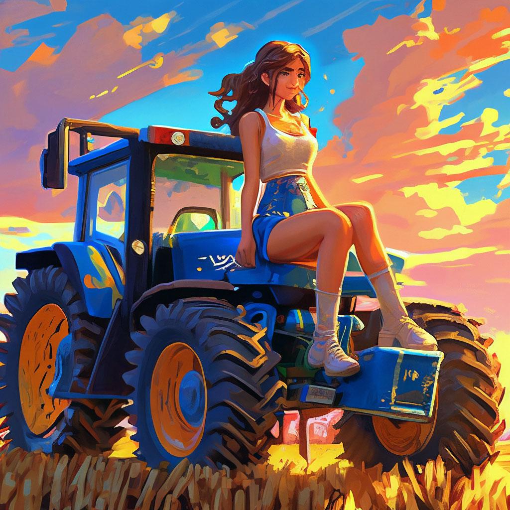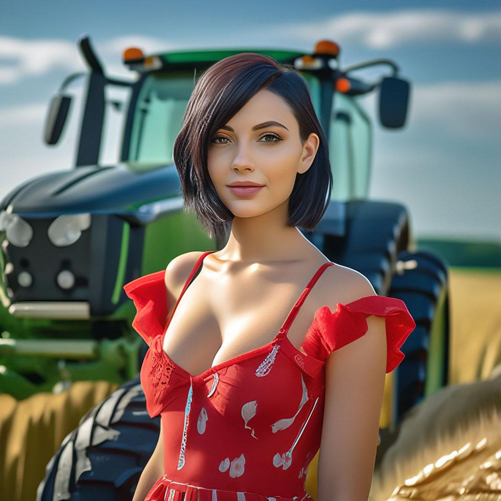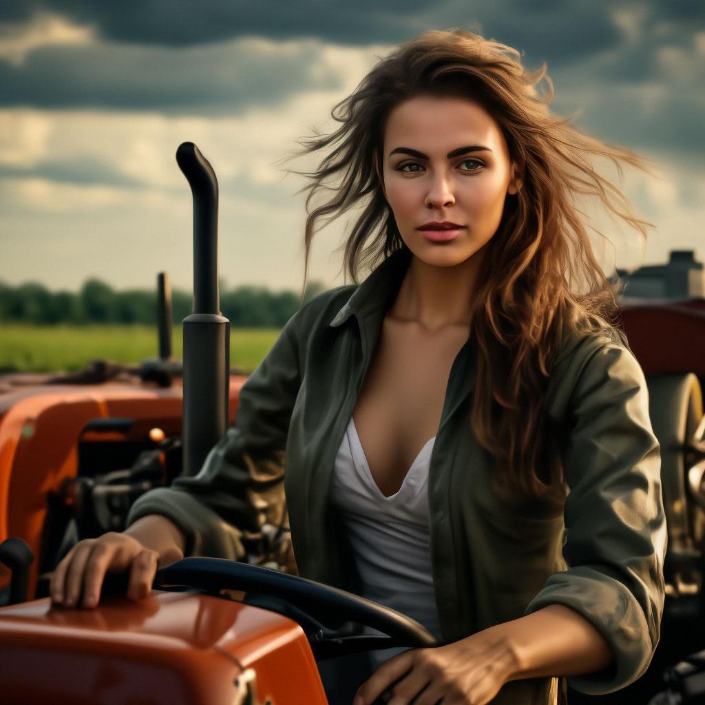 Необычное сочетание нежной женственности и мощной сельскохозяйственной техники создает запоминающиеся композиции в этих фотографиях. Девушка уверенно сидит за рулем трактора, ее руки крепко держат рычаги управления, а взгляд выражает сосредоточенность и решимость. Просторные поля или фермерский двор становятся фоном для этих необычных портретов. Ее рабочая одежда - клетчатая рубашка и джинсы - идеально дополняет образ современной фермерши. Волосы собраны в практичную прическу или развиваются на ветру из открытого окна кабины. Каждый снимок рассказывает историю о силе характера и умении справляться с любыми вызовами. Девушка то улыбается, демонстрируя белоснежные зубы, то серьезно смотрит вдаль, планируя следующий маневр. Фотографии показывают контраст между хрупкой фигурой и массивной машиной, подчеркивая внутреннюю силу героини. Эти иллюстрации вдохновляют на преодоление стереотипов и уважение к женскому труду в любой сфере деятельности.