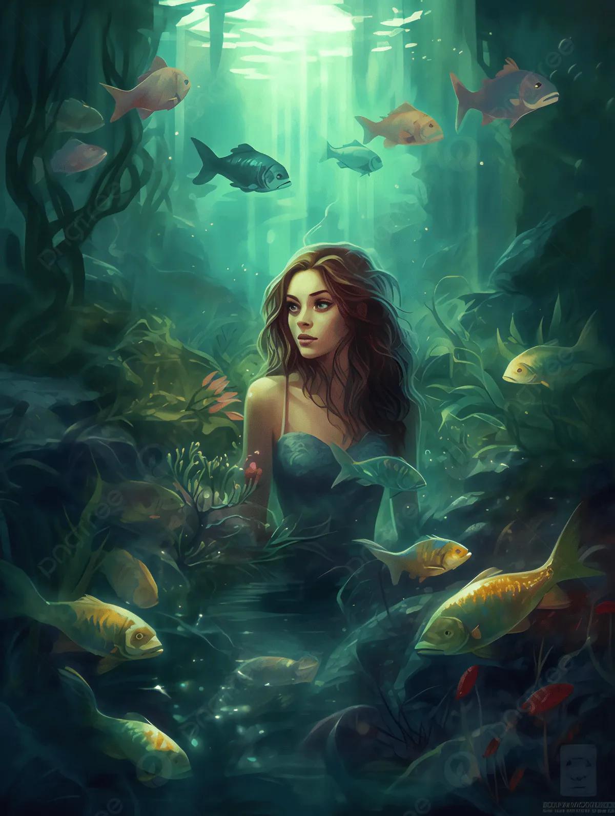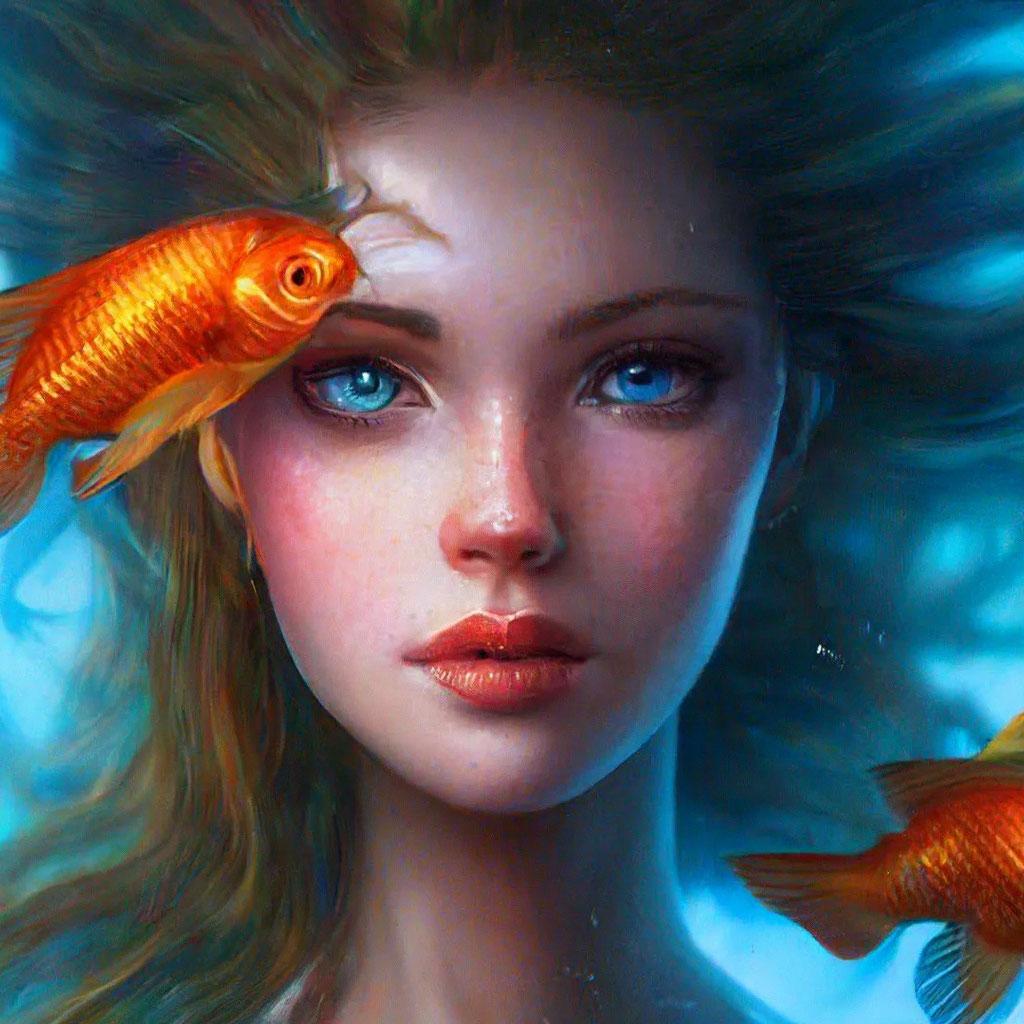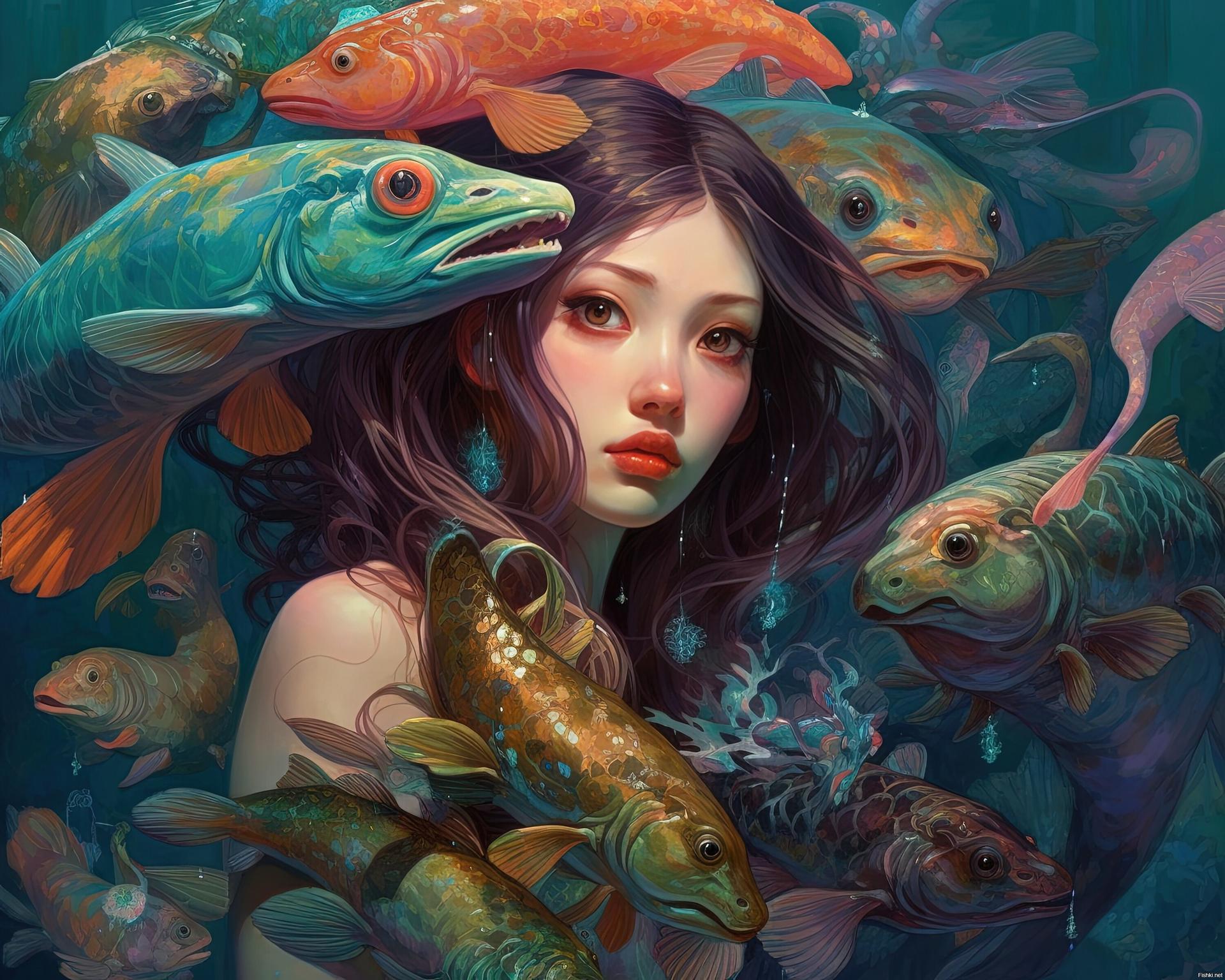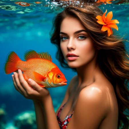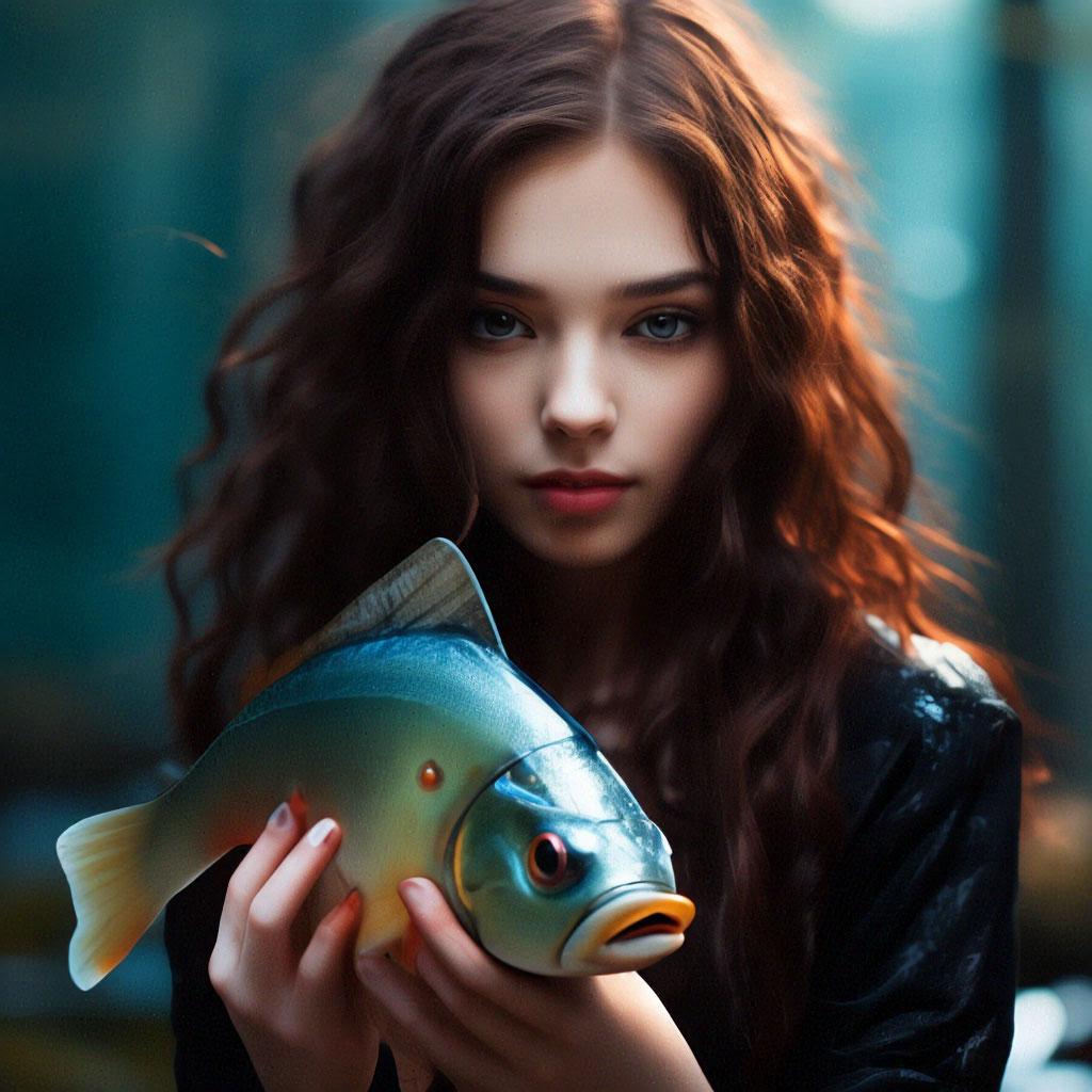 Девушка-рыба - это фантастическое существо, соединяющее в себе человеческую красоту и морскую грацию. Она плавает в глубинах океана, её тело переливается всеми оттенками синего и зелёного. Чешуя на её коже блестит, словно драгоценные камни, а волосы развеваются в воде, как морские водоросли. Её глаза большие и выразительные, они словно хранят тайны морских глубин. Плавники на её теле позволяют ей легко скользить в воде, а хвост помогает ей развивать невероятную скорость. Эта девушка-рыба олицетворяет свободу и независимость, она не связана никакими условностями суши. В её движениях чувствуется природная грация и естественность, присущая всем обитателям моря. Она словно родилась в воде и никогда не знала других стихий.