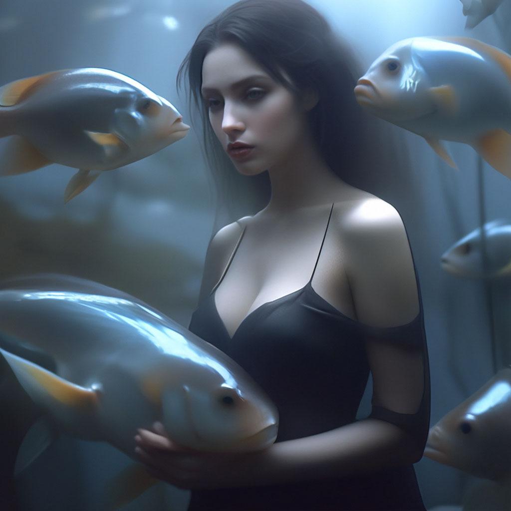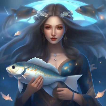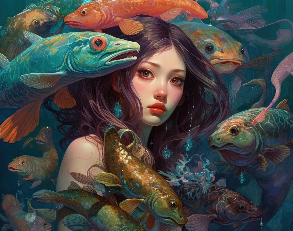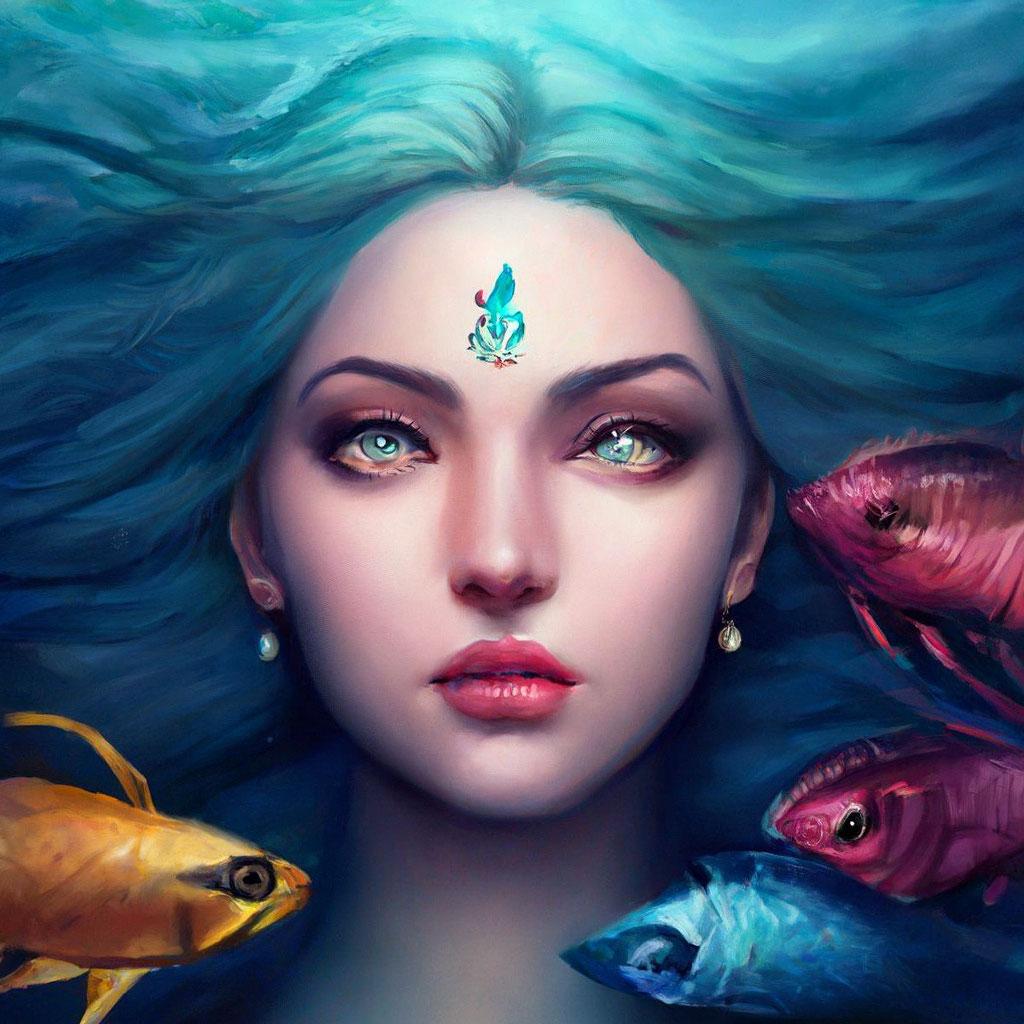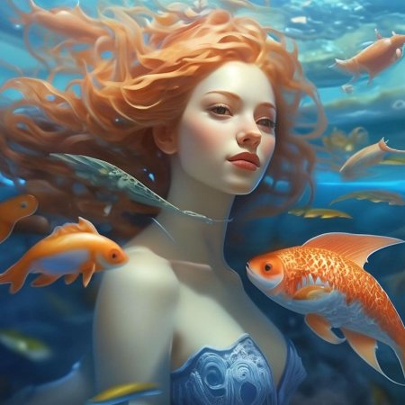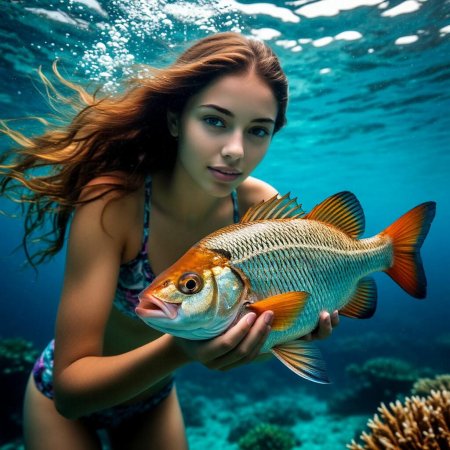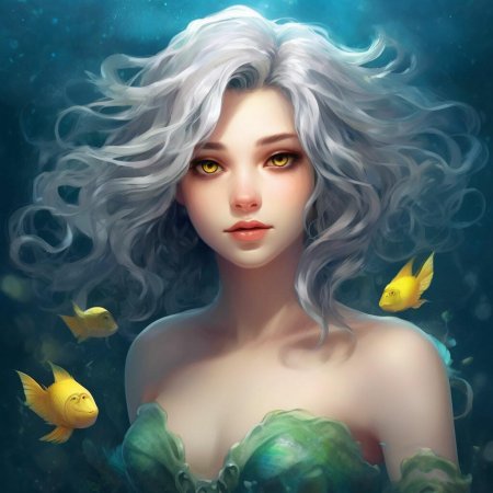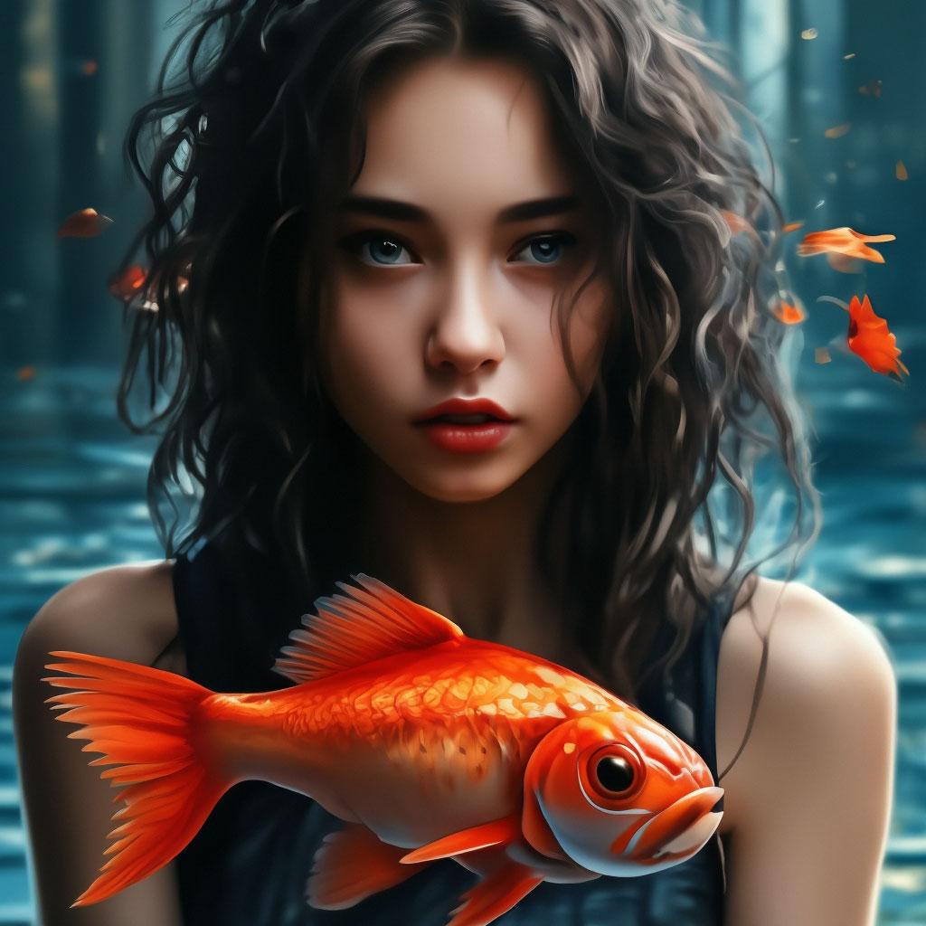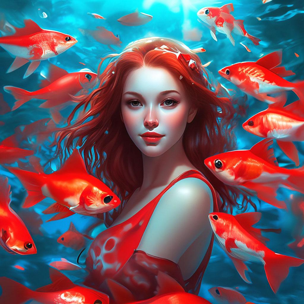 Девушка-рыба - это фантастическое существо, соединяющее в себе человеческую красоту и морскую грацию. Она плавает в глубинах океана, её тело переливается всеми оттенками синего и зелёного. Чешуя на её коже блестит, словно драгоценные камни, а волосы развеваются в воде, как морские водоросли. Её глаза большие и выразительные, они словно хранят тайны морских глубин. Плавники на её теле позволяют ей легко скользить в воде, а хвост помогает ей развивать невероятную скорость. Эта девушка-рыба олицетворяет свободу и независимость, она не связана никакими условностями суши. В её движениях чувствуется природная грация и естественность, присущая всем обитателям моря. Она словно родилась в воде и никогда не знала других стихий.
