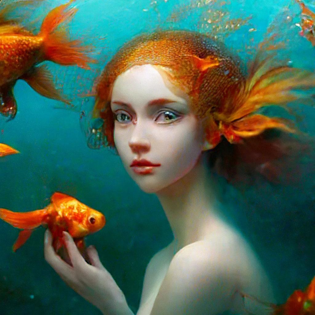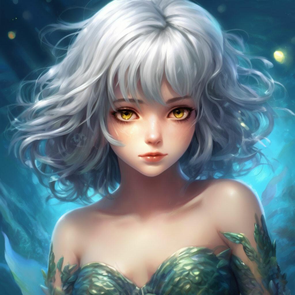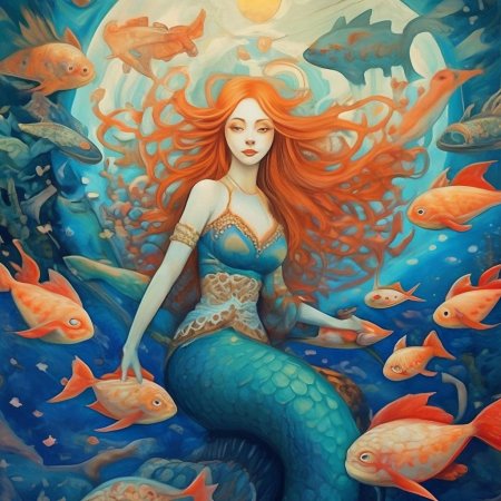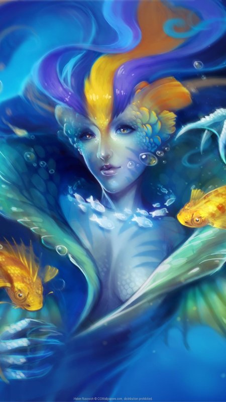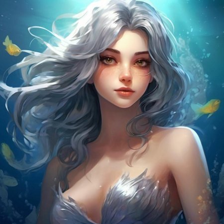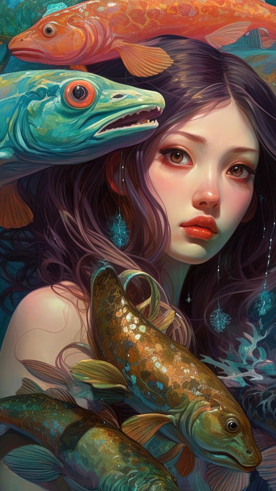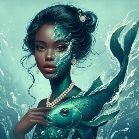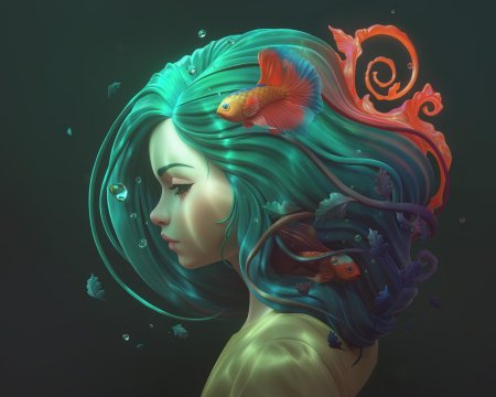 Девушка-рыба - это фантастическое существо, соединяющее в себе человеческую красоту и морскую грацию. Она плавает в глубинах океана, её тело переливается всеми оттенками синего и зелёного. Чешуя на её коже блестит, словно драгоценные камни, а волосы развеваются в воде, как морские водоросли. Её глаза большие и выразительные, они словно хранят тайны морских глубин. Плавники на её теле позволяют ей легко скользить в воде, а хвост помогает ей развивать невероятную скорость. Эта девушка-рыба олицетворяет свободу и независимость, она не связана никакими условностями суши. В её движениях чувствуется природная грация и естественность, присущая всем обитателям моря. Она словно родилась в воде и никогда не знала других стихий.