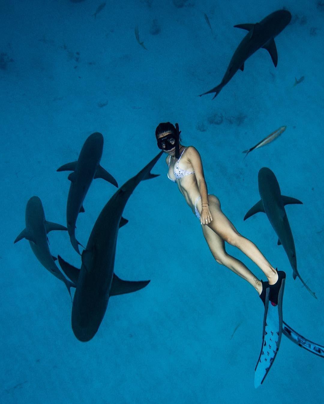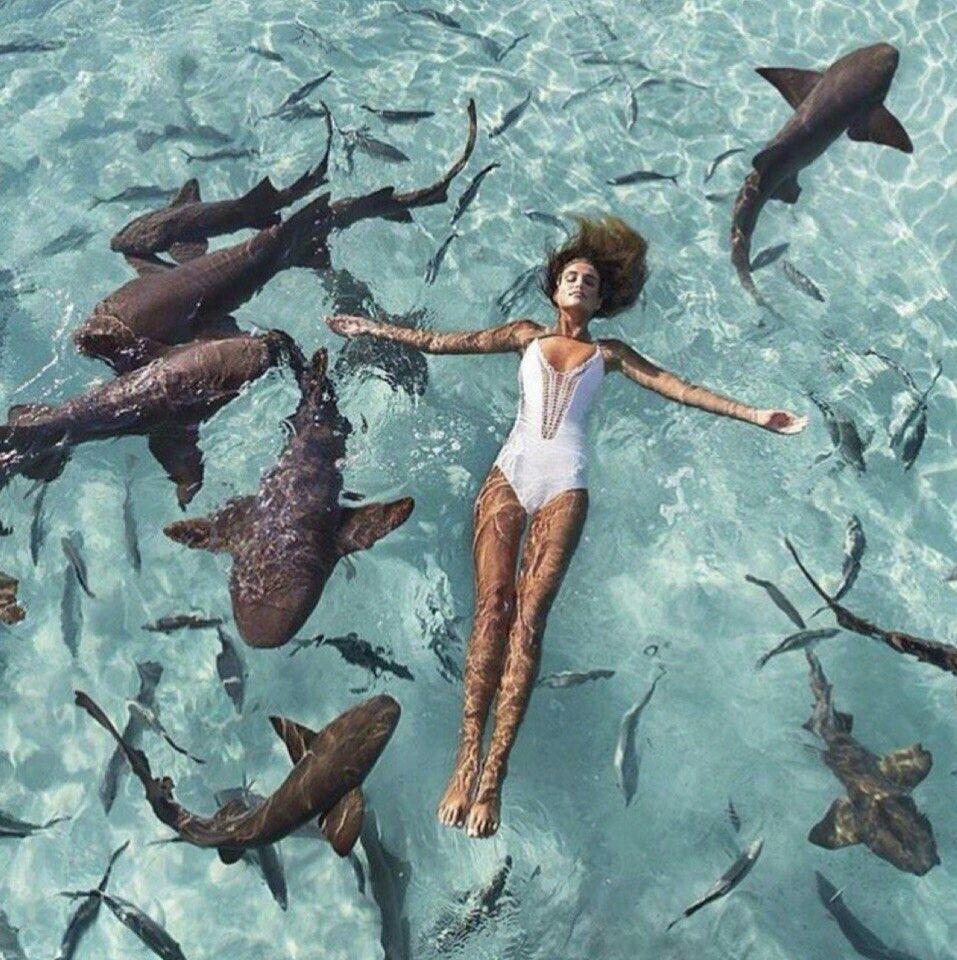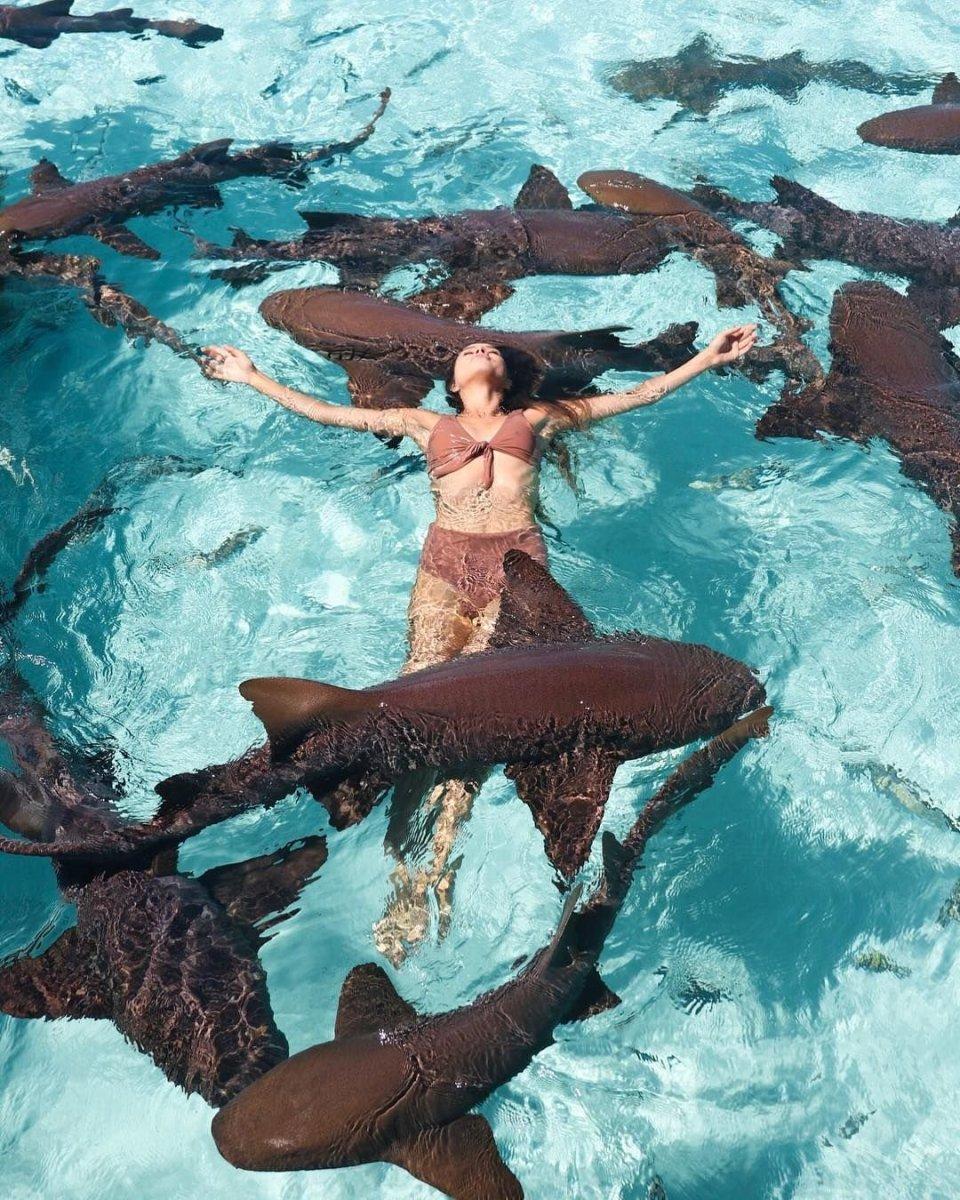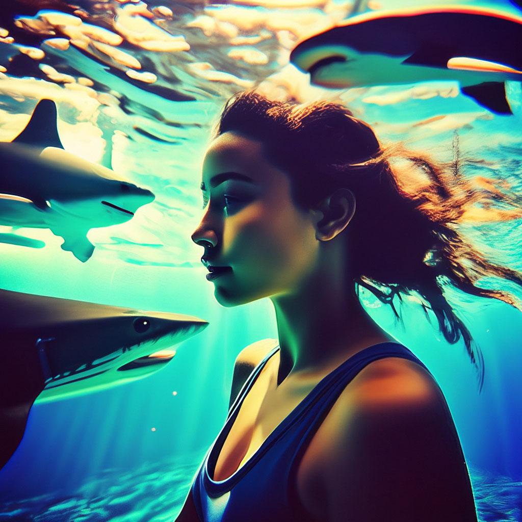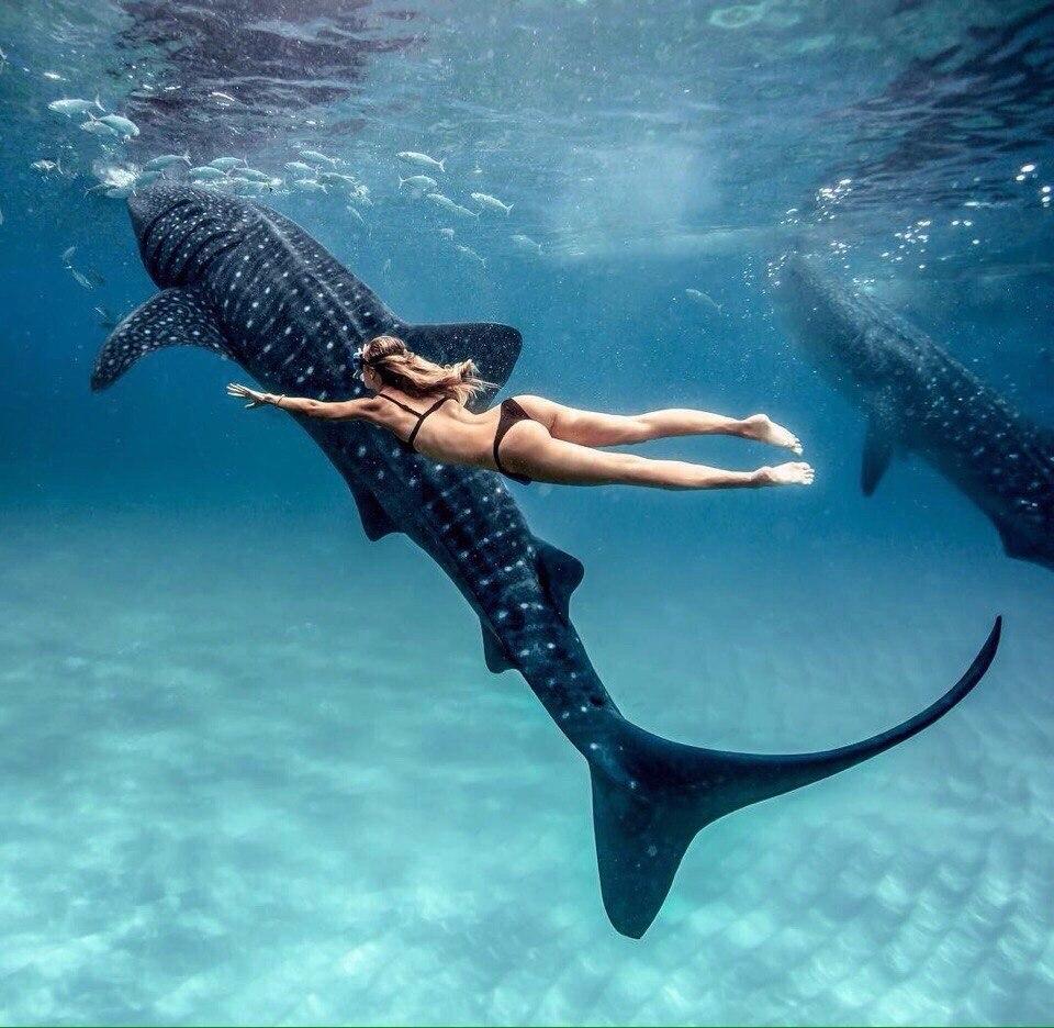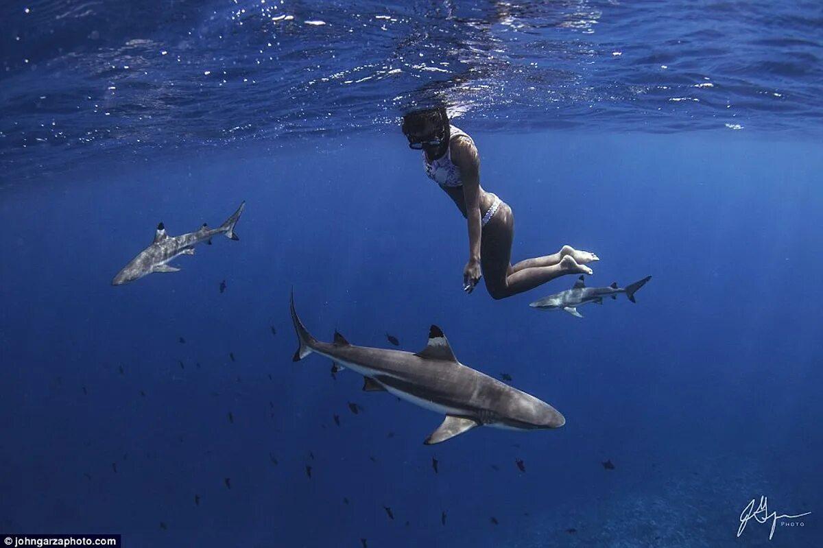 Девушка плавает с акулами
