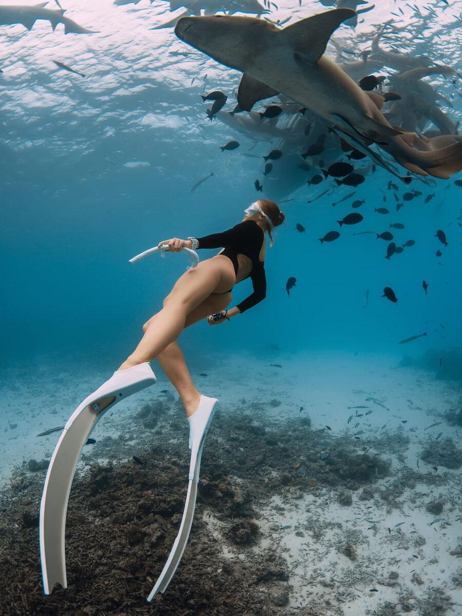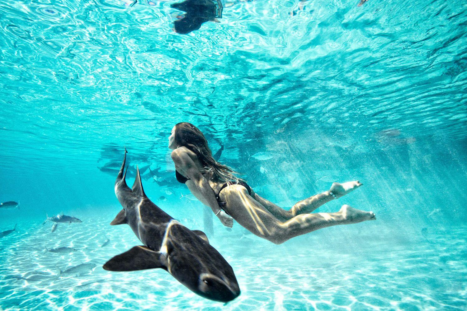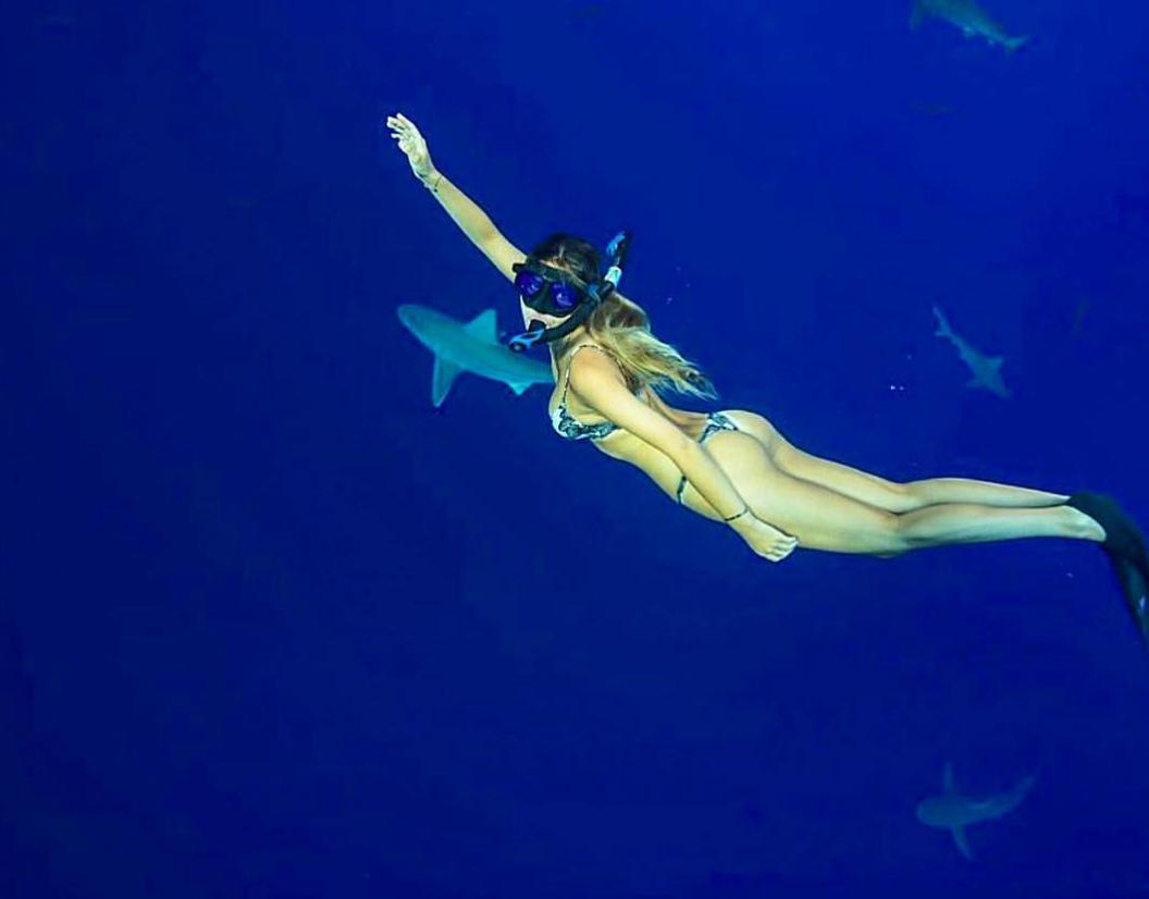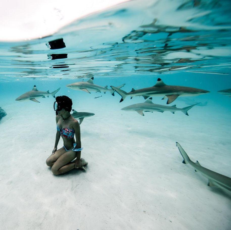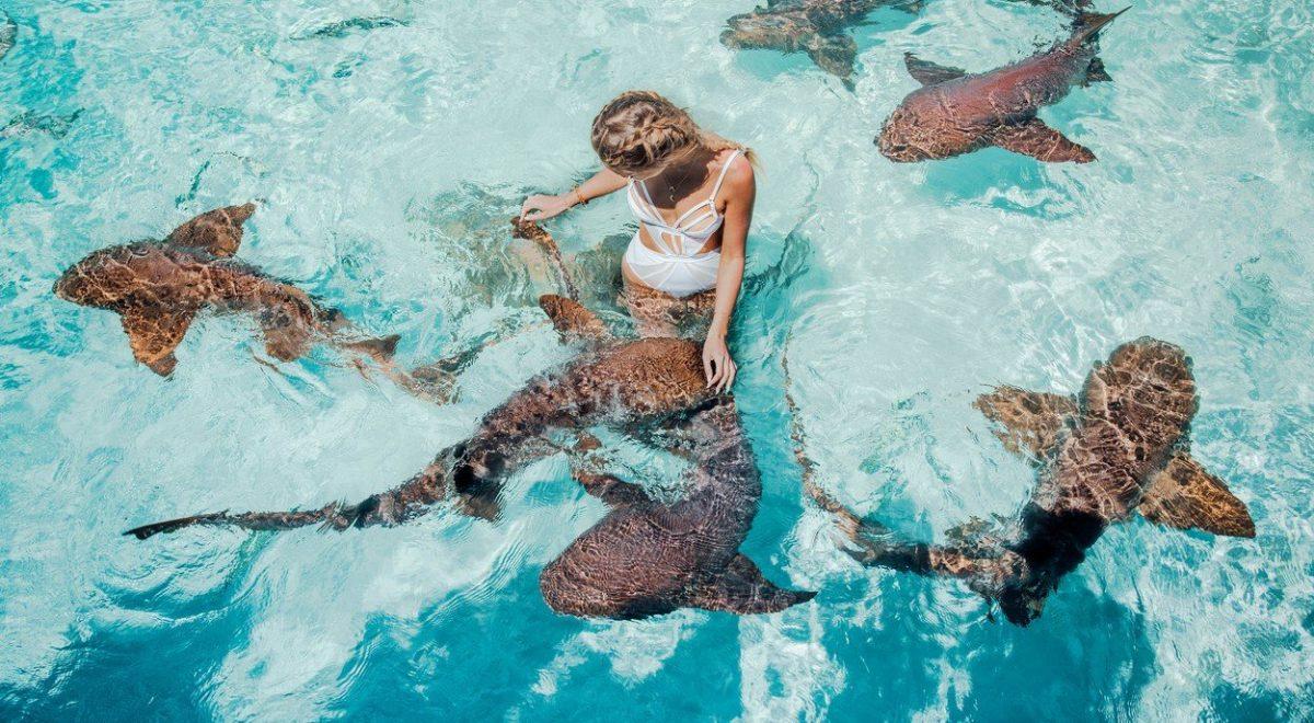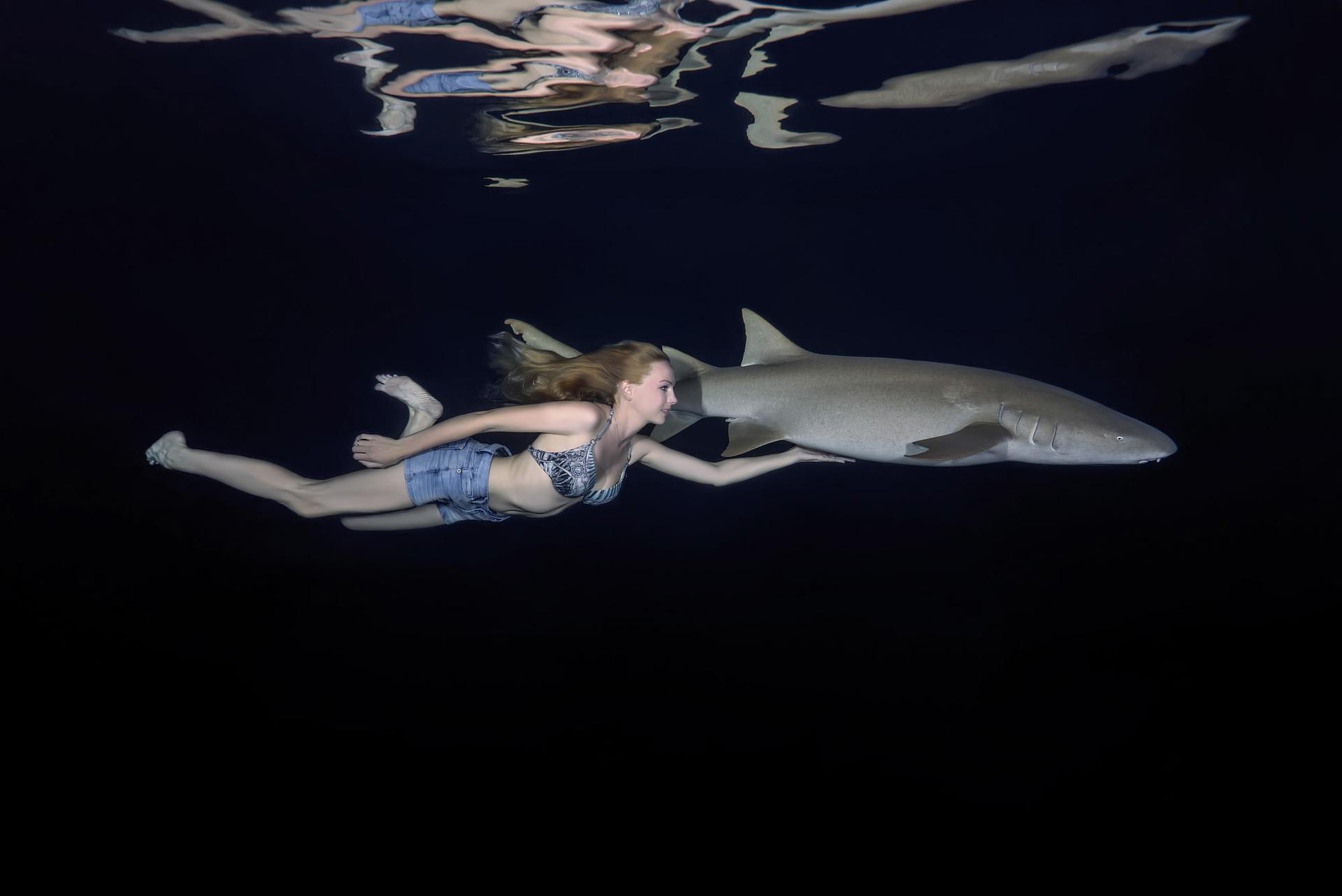 Девушка плавает с акулами