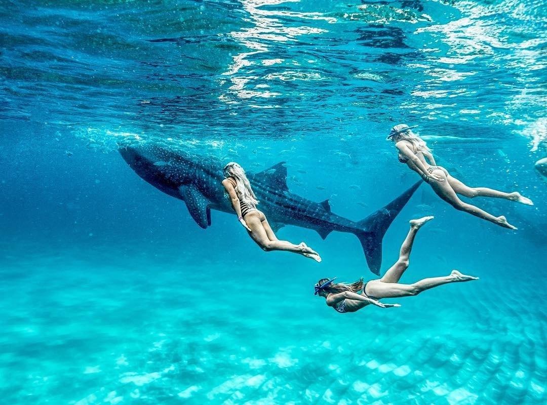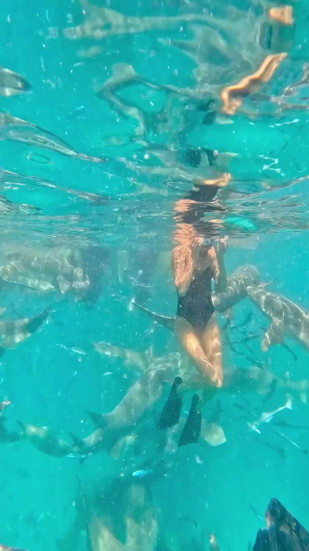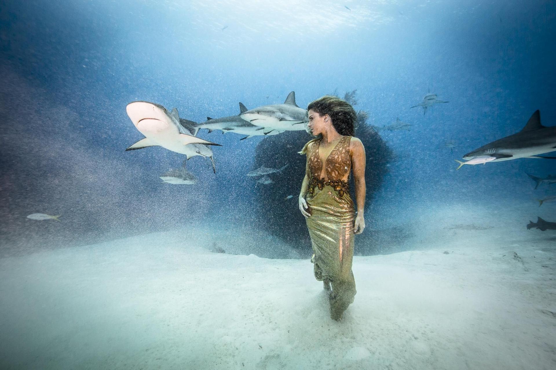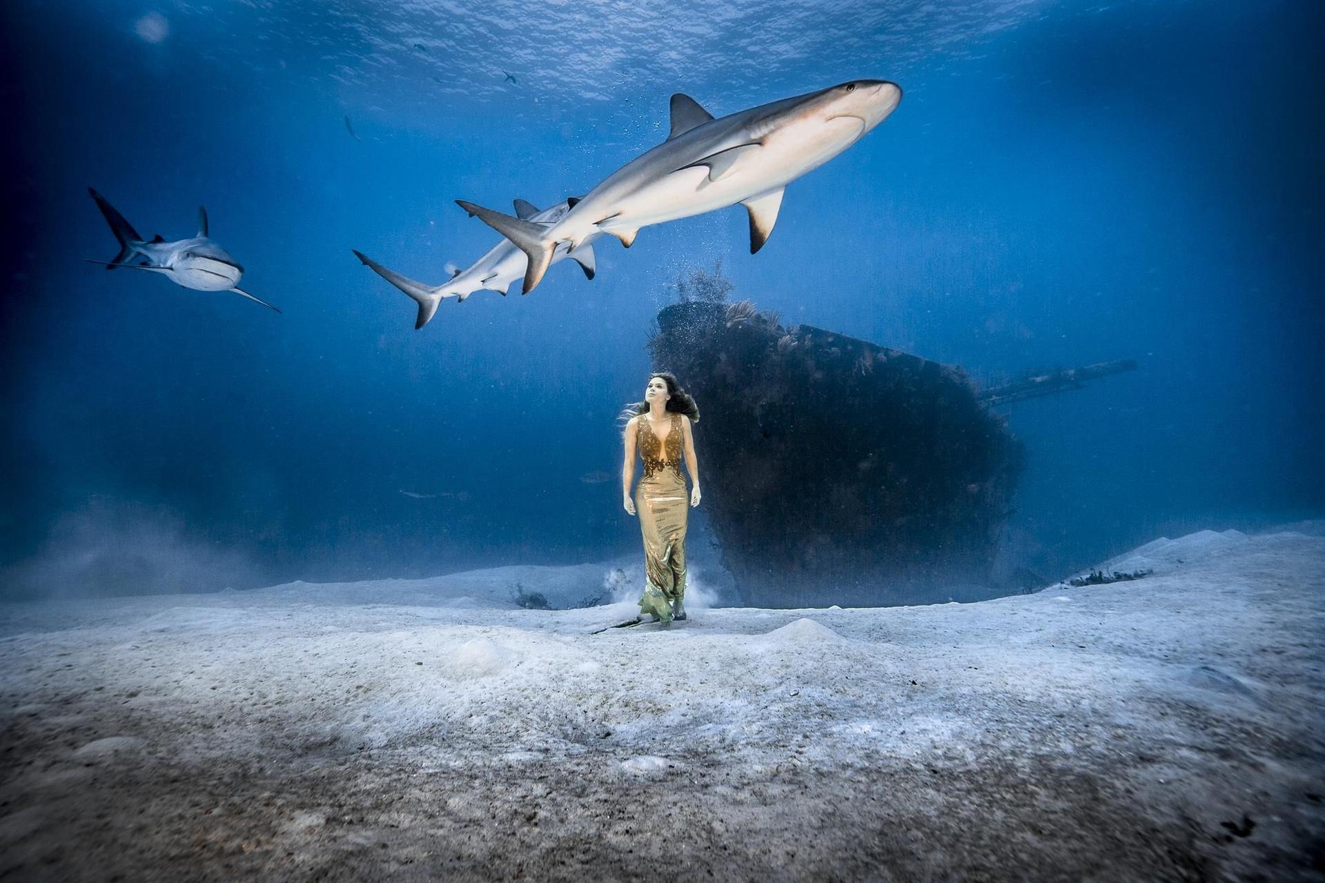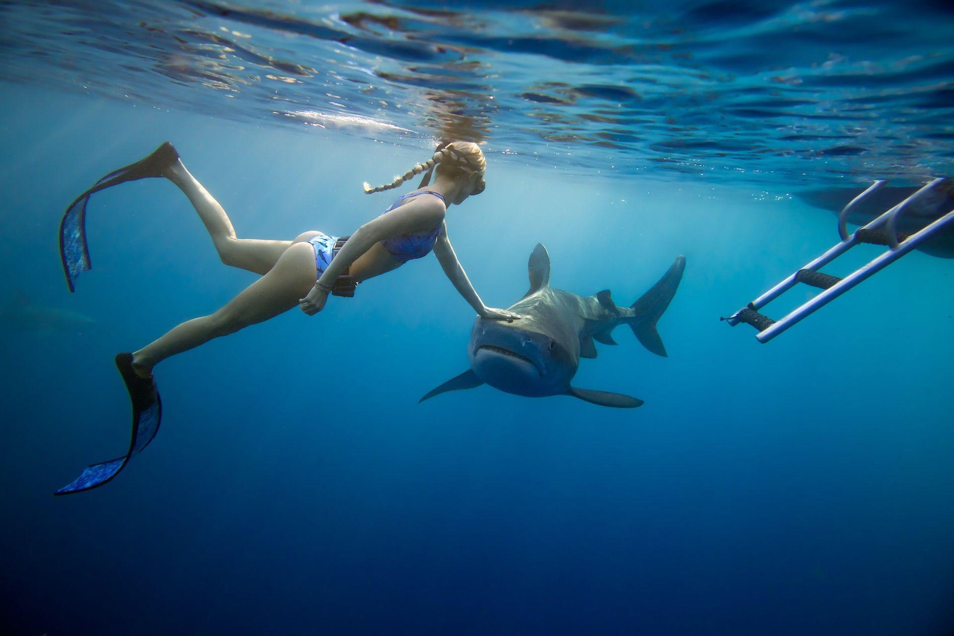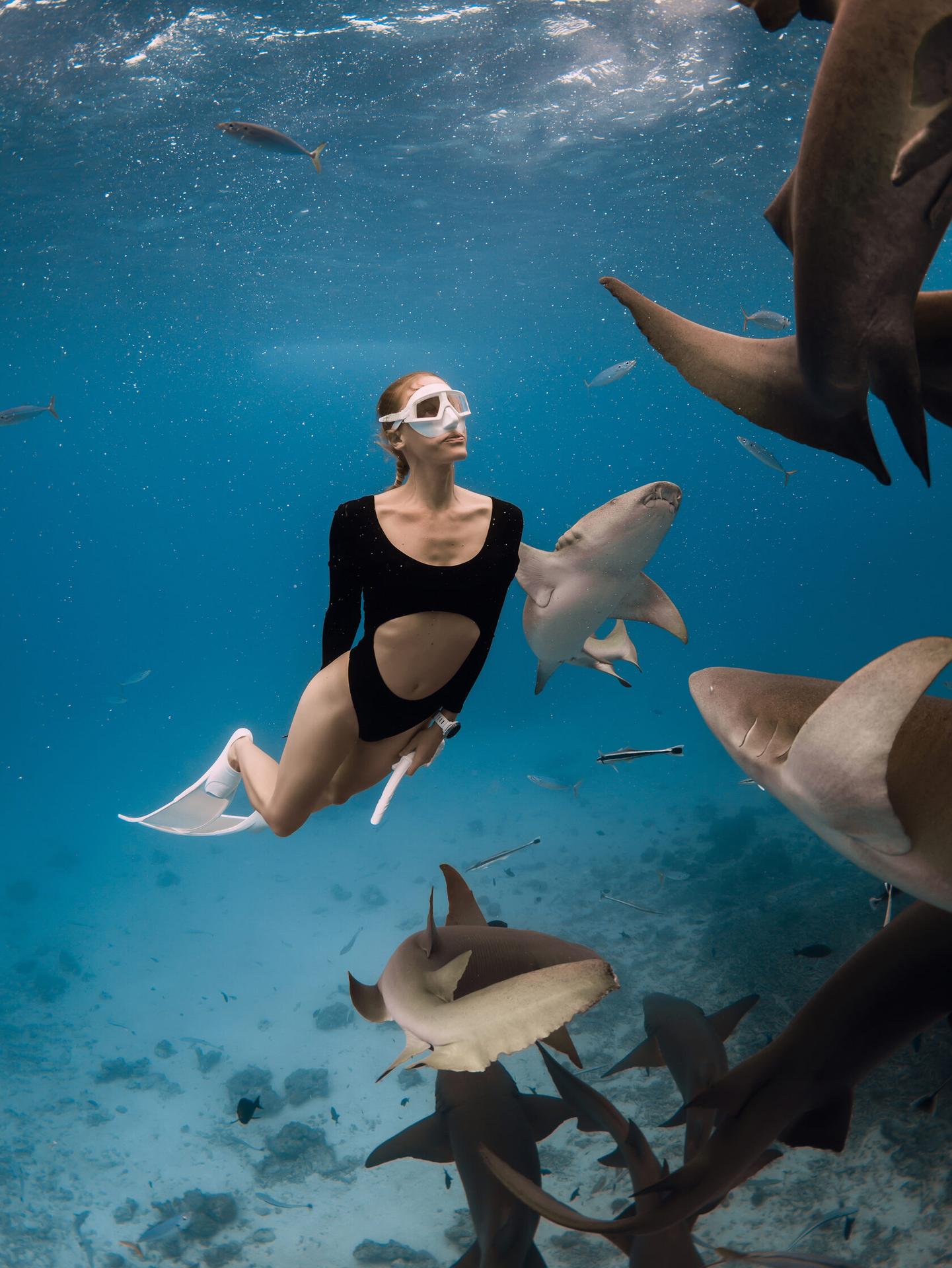 Девушка плавает с акулами