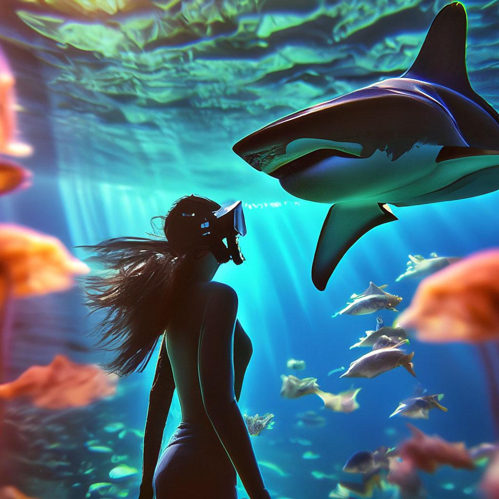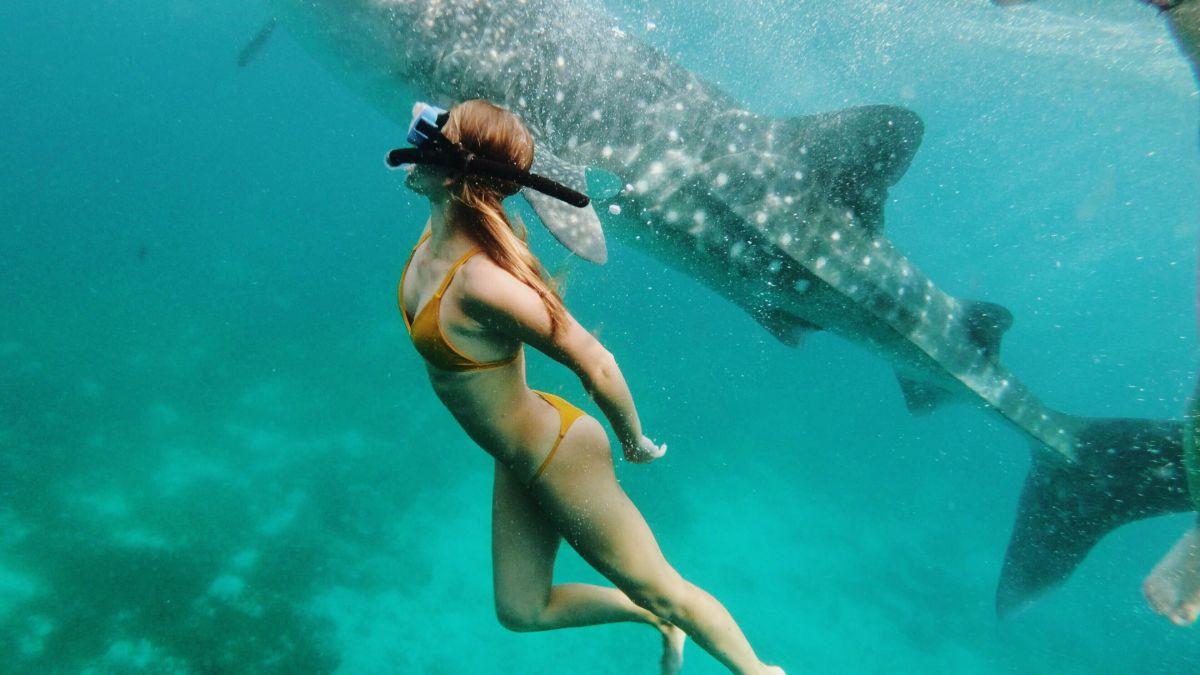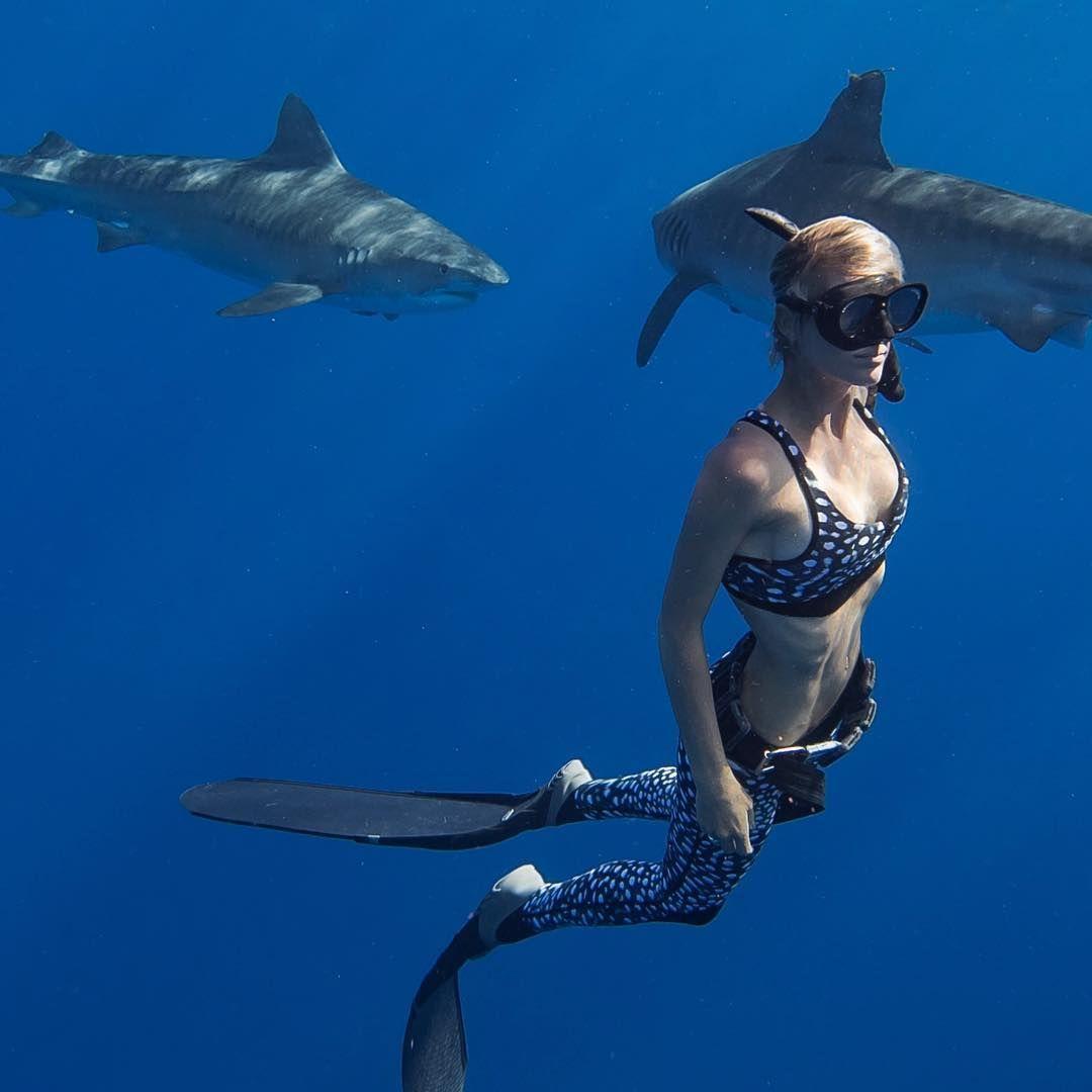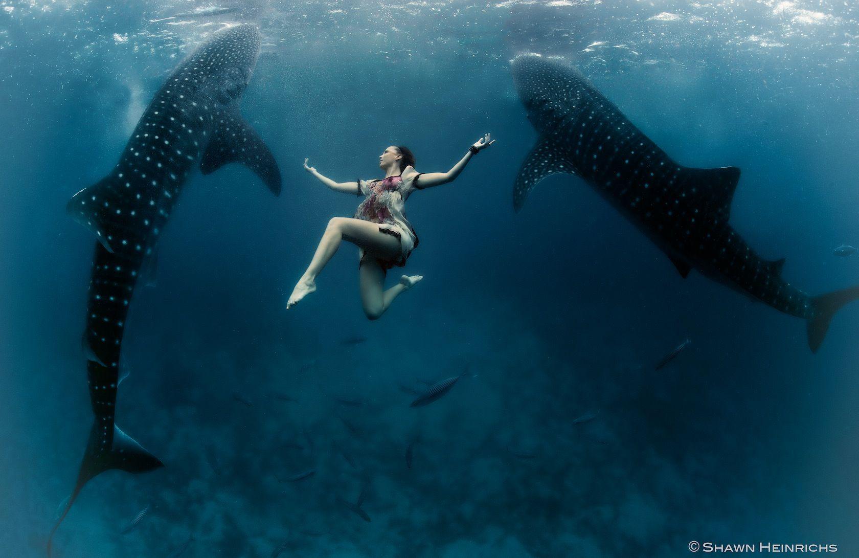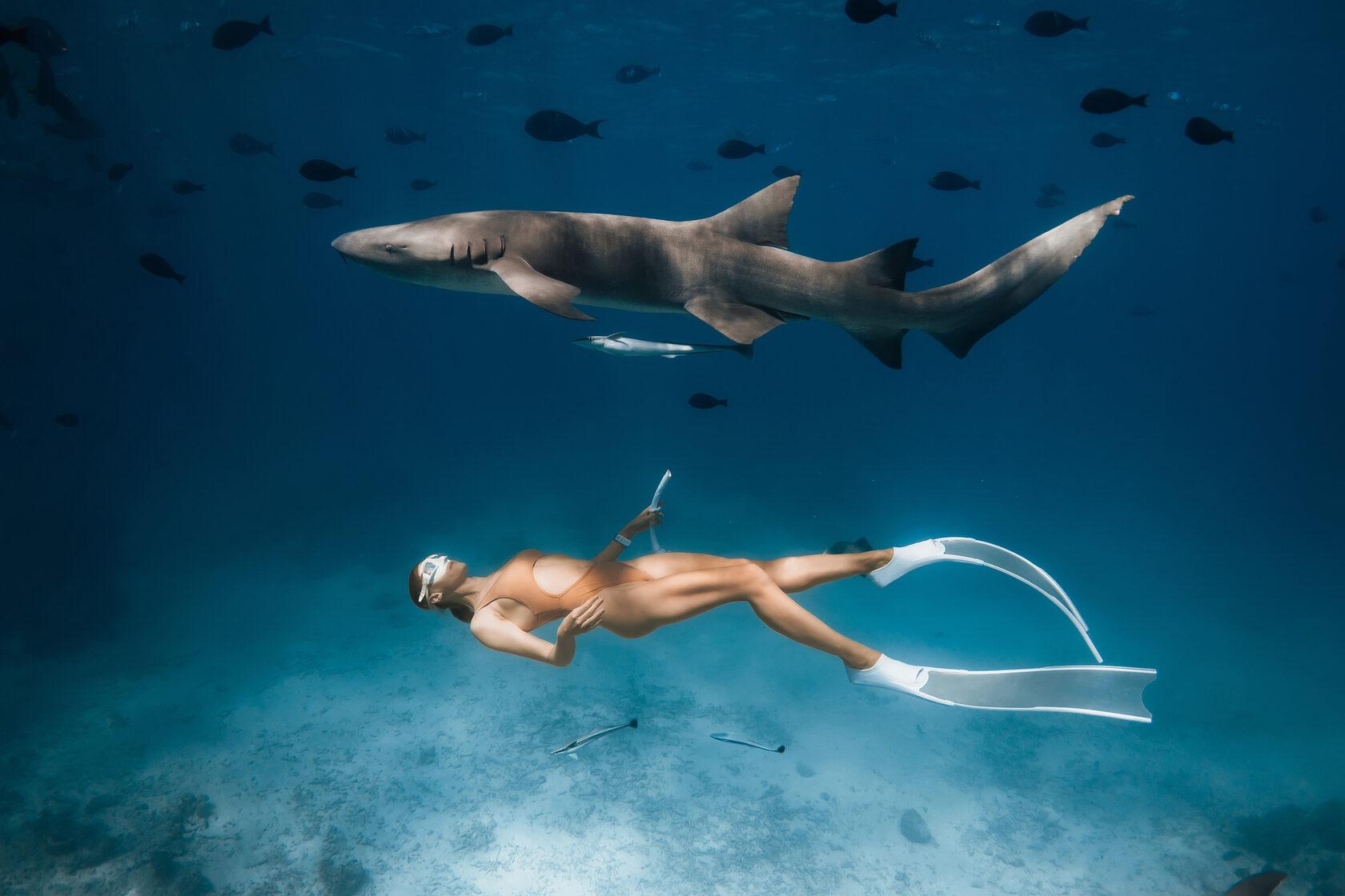 Девушка плавает с акулами