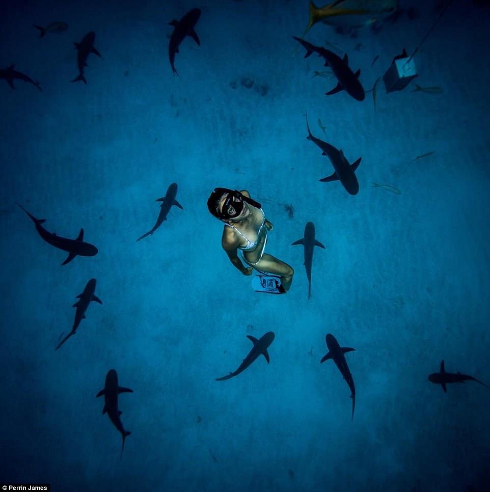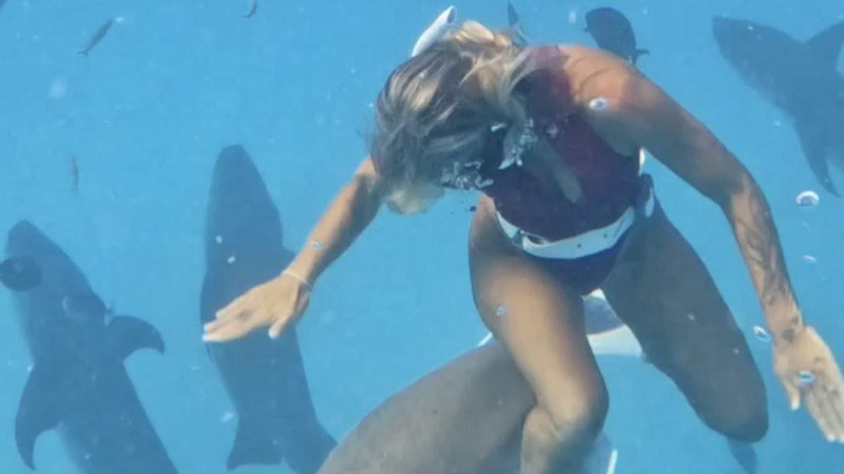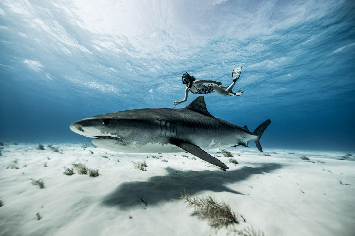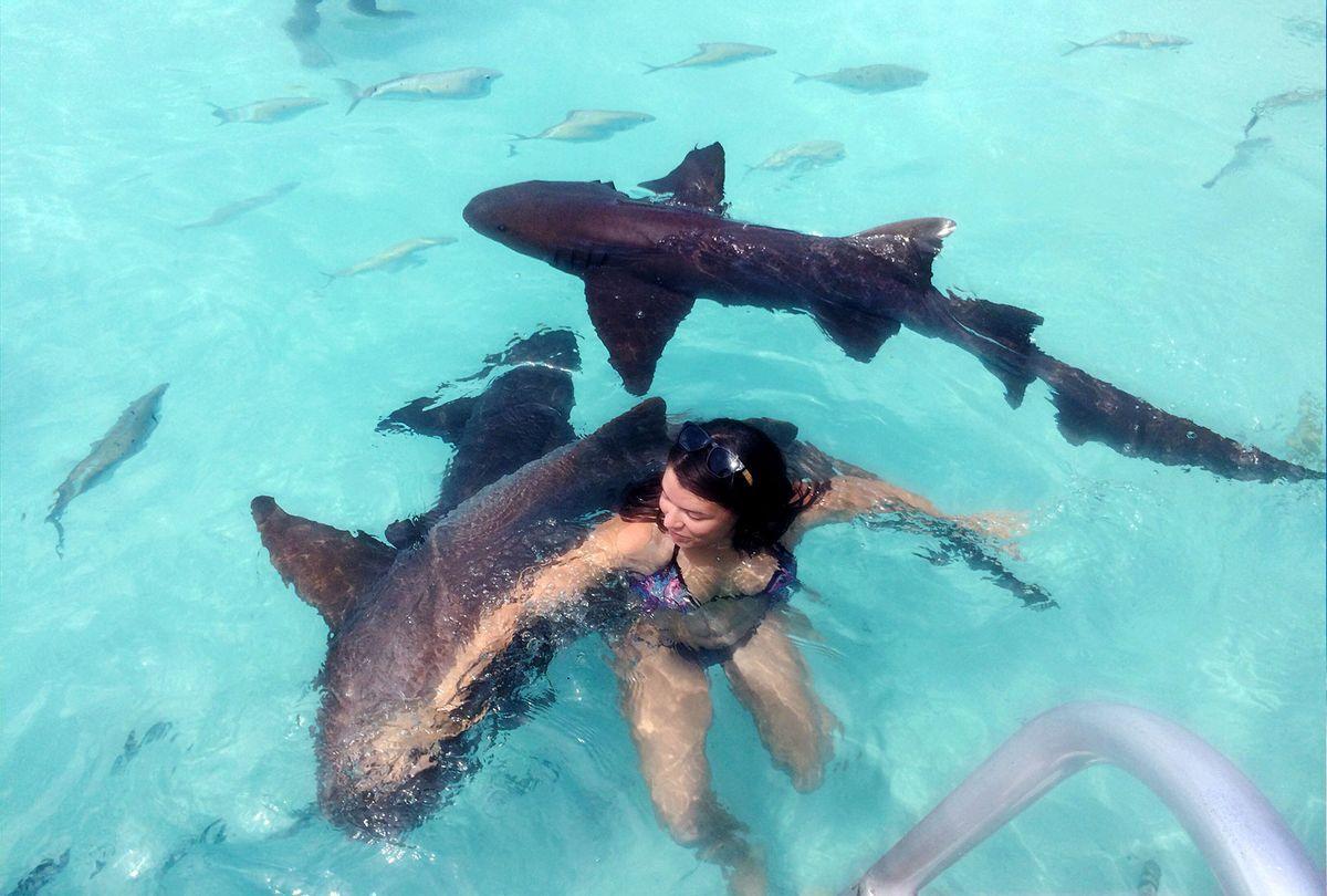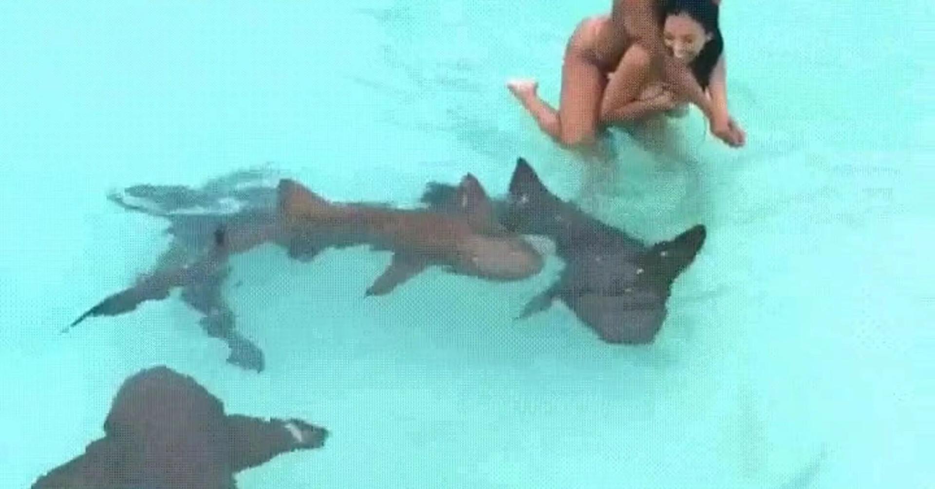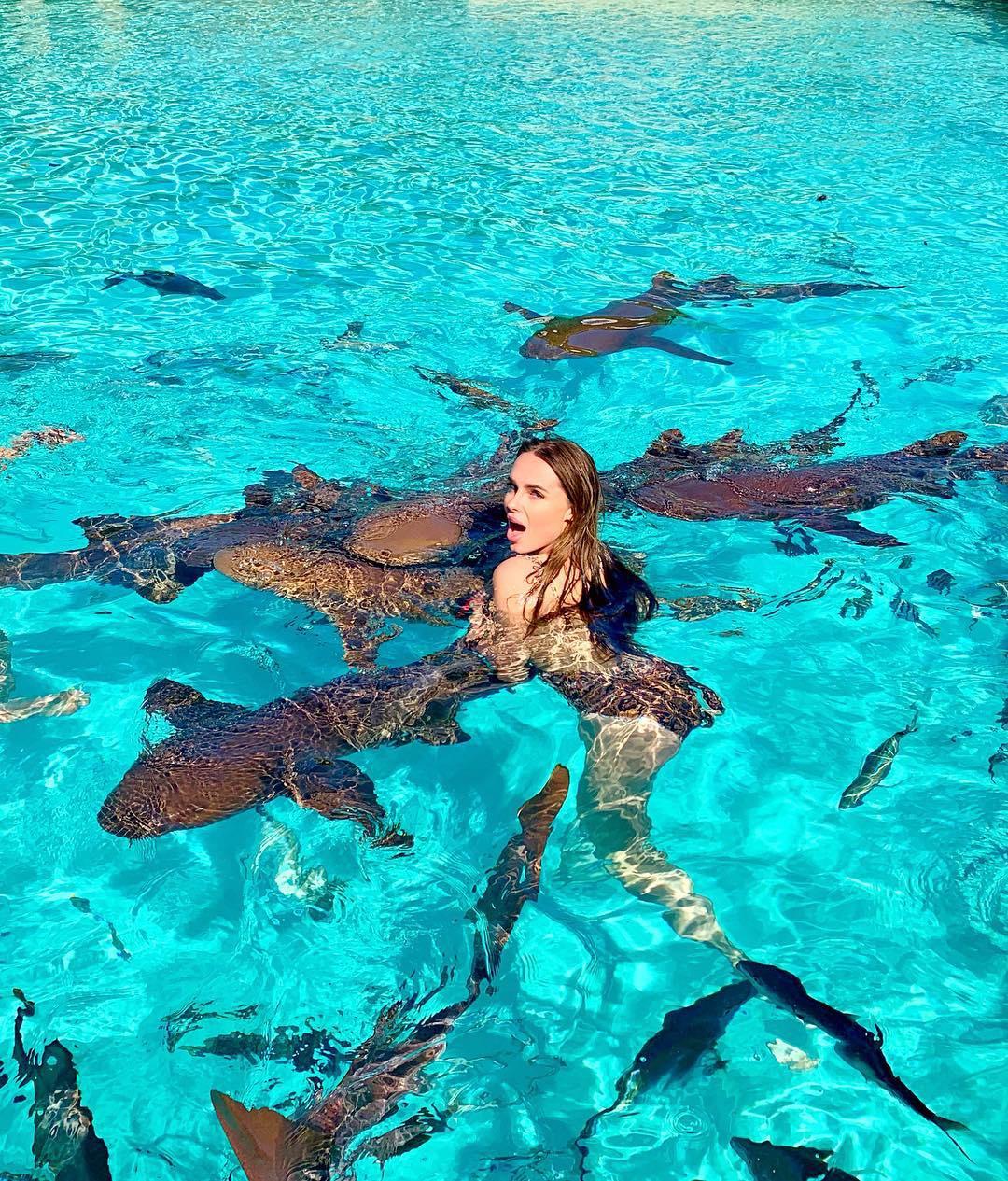 Девушка плавает с акулами