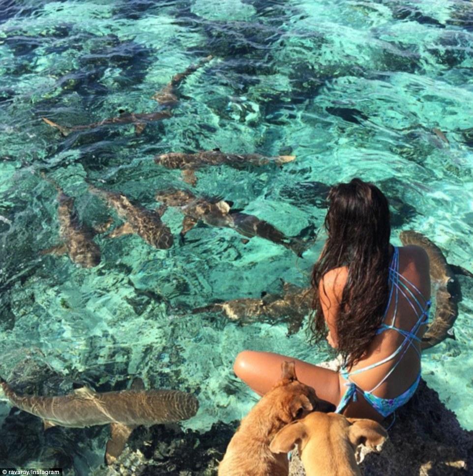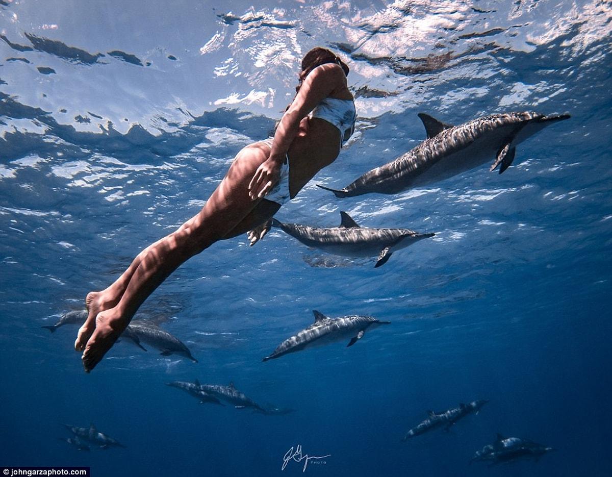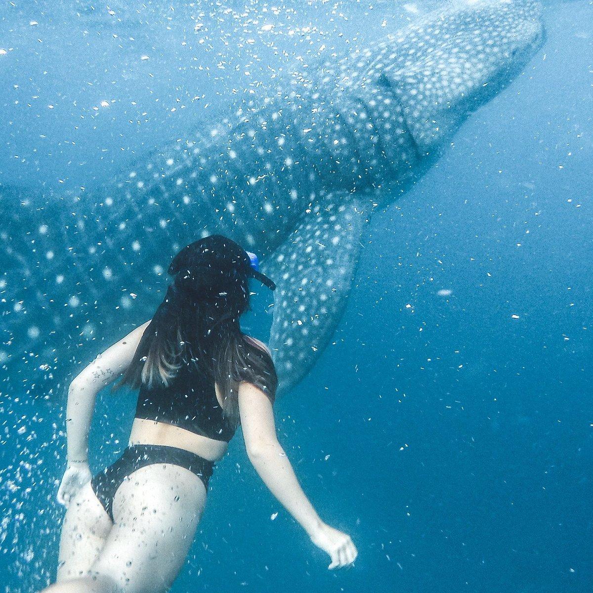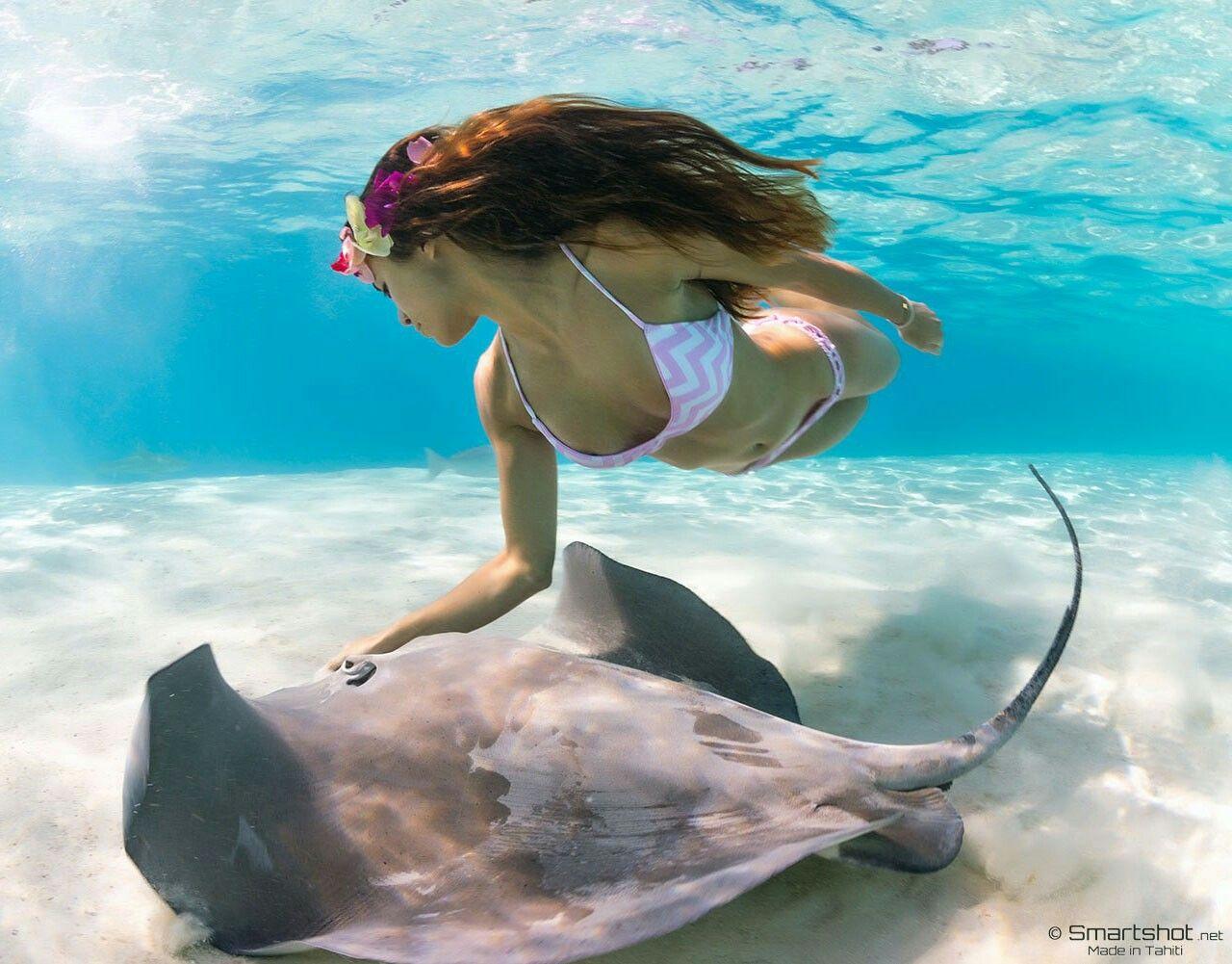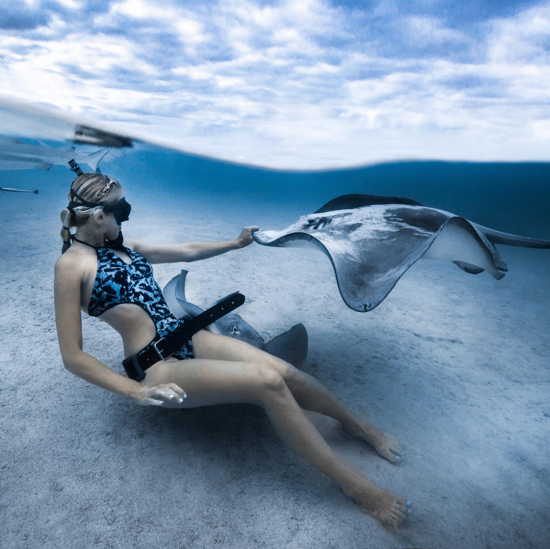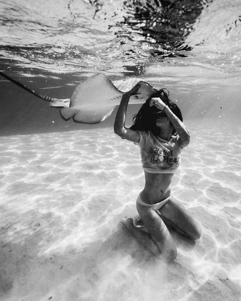 Девушка плавает с акулами