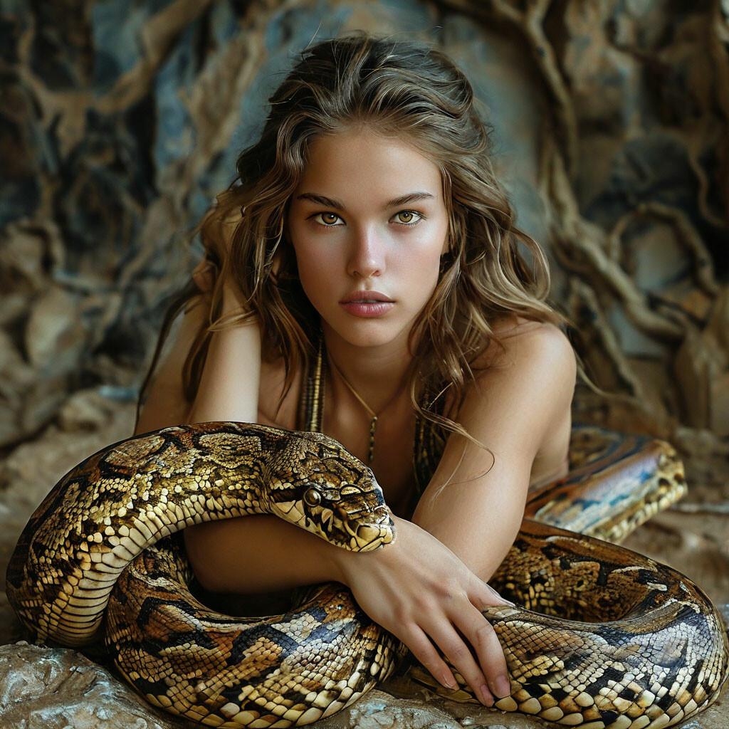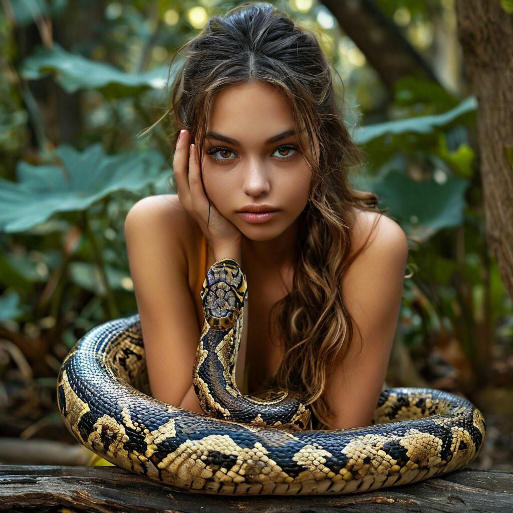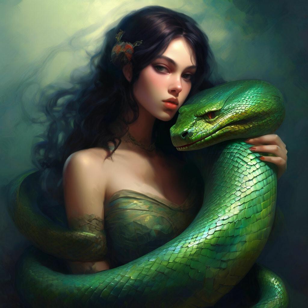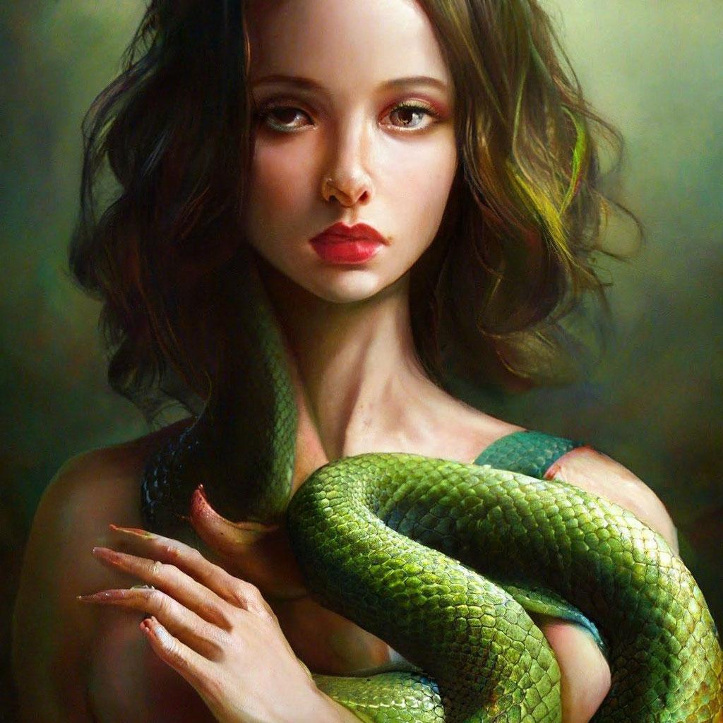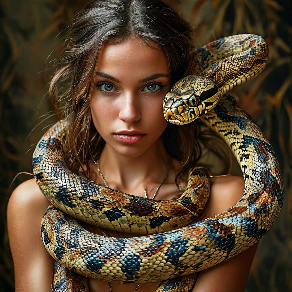 Коллекция иллюстраций девушки со змеей воплощает тему мистики, трансформации и древней мудрости. Змея становится символом загадочности, обновления и женской силы, гармонично интегрируясь в образ девушки. Фигуры предстают в различных композициях: девушка, держащая змею, частичное превращение, символические позы. Особое внимание уделено деталям: чешуя, глаза, движения, которые создают атмосферу тайны и магии. Девушка показана то как укротительница, то как равная партнерша змеи, демонстрируя гармонию с дикими силами природы. Каждый рисунок рассказывает историю о женщине, которая обладает внутренней силой и мудростью древних времен. Тематические ключевые слова: мистические образы, змеиная символика, женская трансформация, древняя мудрость, природная сила.