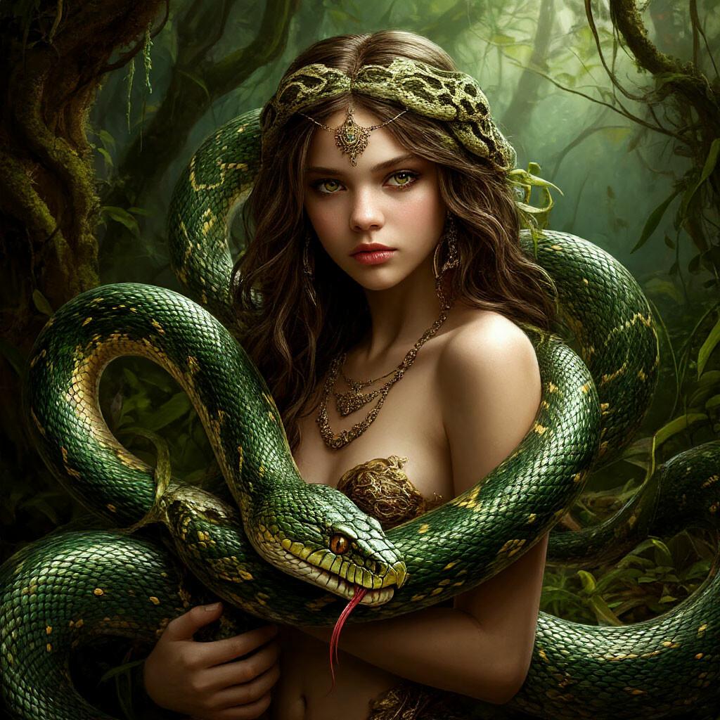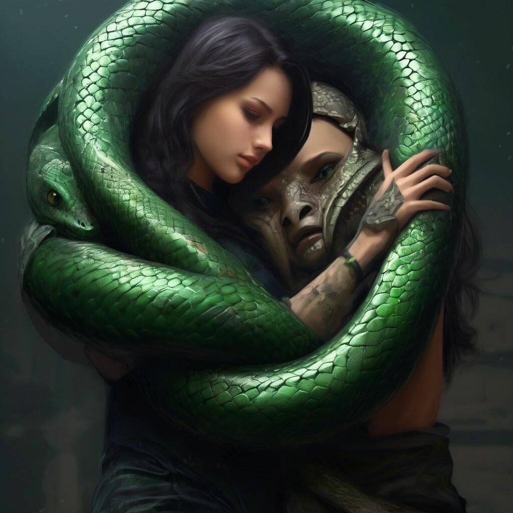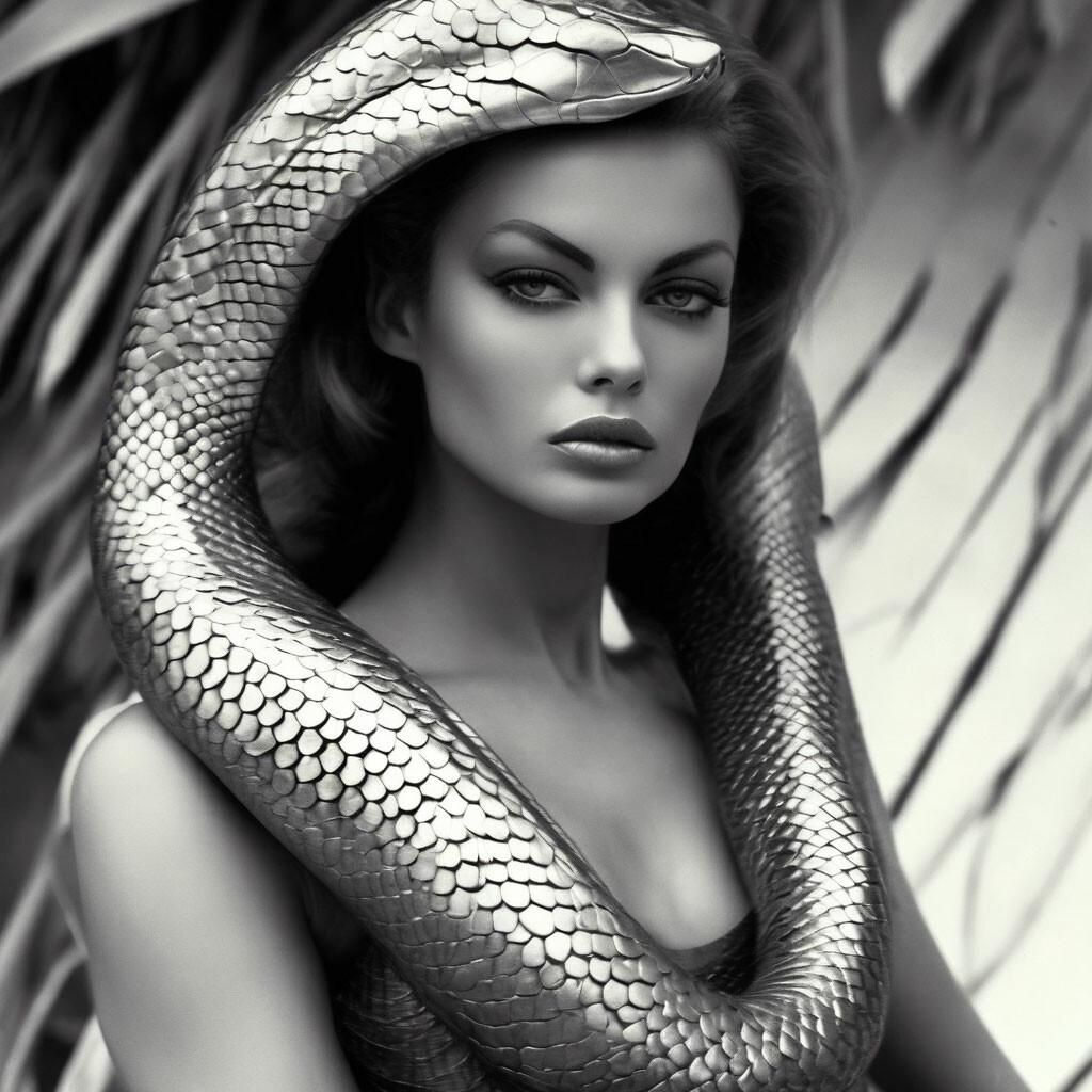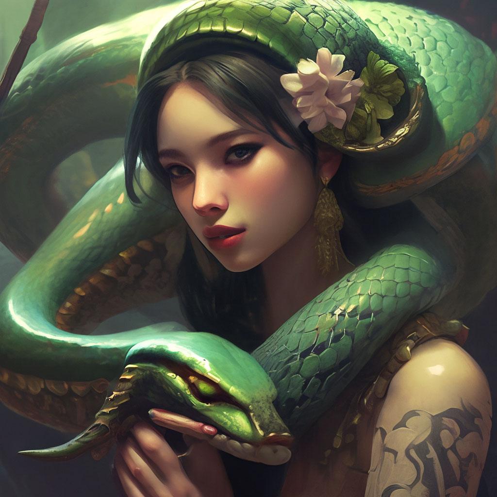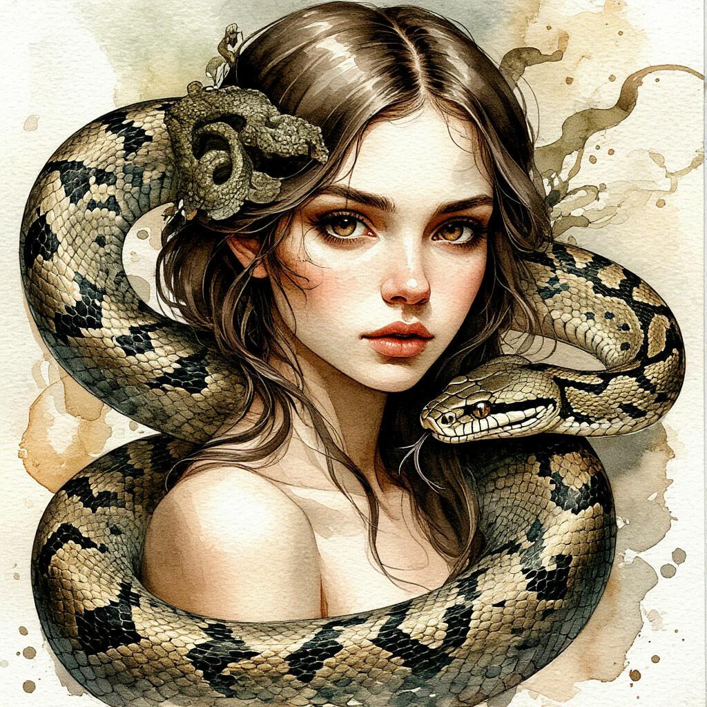 Коллекция иллюстраций девушки со змеей воплощает тему мистики, трансформации и древней мудрости. Змея становится символом загадочности, обновления и женской силы, гармонично интегрируясь в образ девушки. Фигуры предстают в различных композициях: девушка, держащая змею, частичное превращение, символические позы. Особое внимание уделено деталям: чешуя, глаза, движения, которые создают атмосферу тайны и магии. Девушка показана то как укротительница, то как равная партнерша змеи, демонстрируя гармонию с дикими силами природы. Каждый рисунок рассказывает историю о женщине, которая обладает внутренней силой и мудростью древних времен. Тематические ключевые слова: мистические образы, змеиная символика, женская трансформация, древняя мудрость, природная сила.