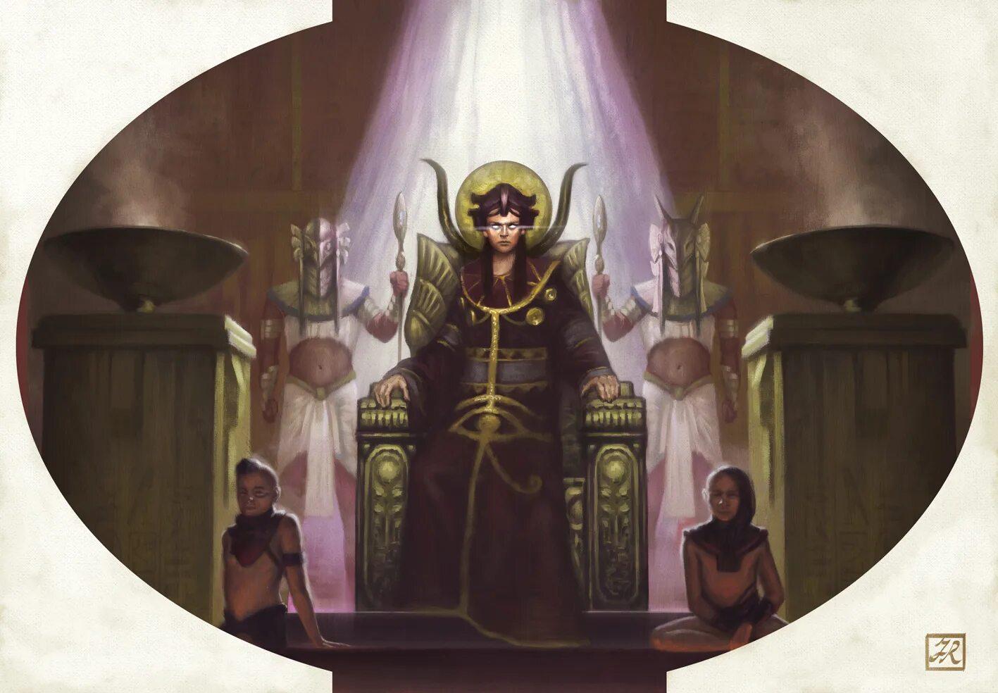 Ра в древнеегипетской мифологии - верховный бог солнца и творения. Его образ с головой сокола символизирует власть над небом и способностью видеть все. В иллюстрациях он предстает в золотых одеждах фараона, с солнечным диском на голове. Ра - создатель мира, повелитель дня и ночи. Его путешествие по небу на солнечной барке символизирует цикл жизни и возрождения. Этот бог воплощает свет, тепло и жизненную силу.