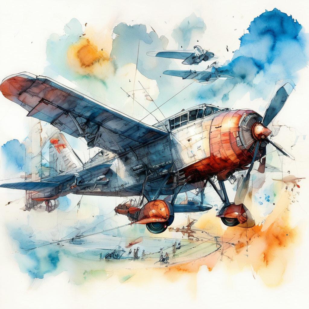В этой коллекции акварельных работ самолеты предстают как символы человеческой мечты о свободе и приключениях. Художники используют нежную технику акварели, чтобы передать легкость и грацию воздушных машин в различных сценах: от одиночных полетов над океаном до групповых формирований на фоне гор. Каждая иллюстрация рассказывает свою историю - старый биплан в винтажном стиле, реактивный лайнер в современном дизайне, военный самолет в исторической композиции. Особое внимание уделяется атмосферным эффектам: мягкие переходы цвета в небе, отражения в воде, дымовые следы, создающие ощущение движения и высоты. Эти работы сочетают техническую точность с художественной свободой, показывая красоту aerodинамики через призму искусства. Коллекция вдохновляет на размышления о прогрессе авиации и романтике полетов, объединяя техническое совершенство с поэтическим видением мира.