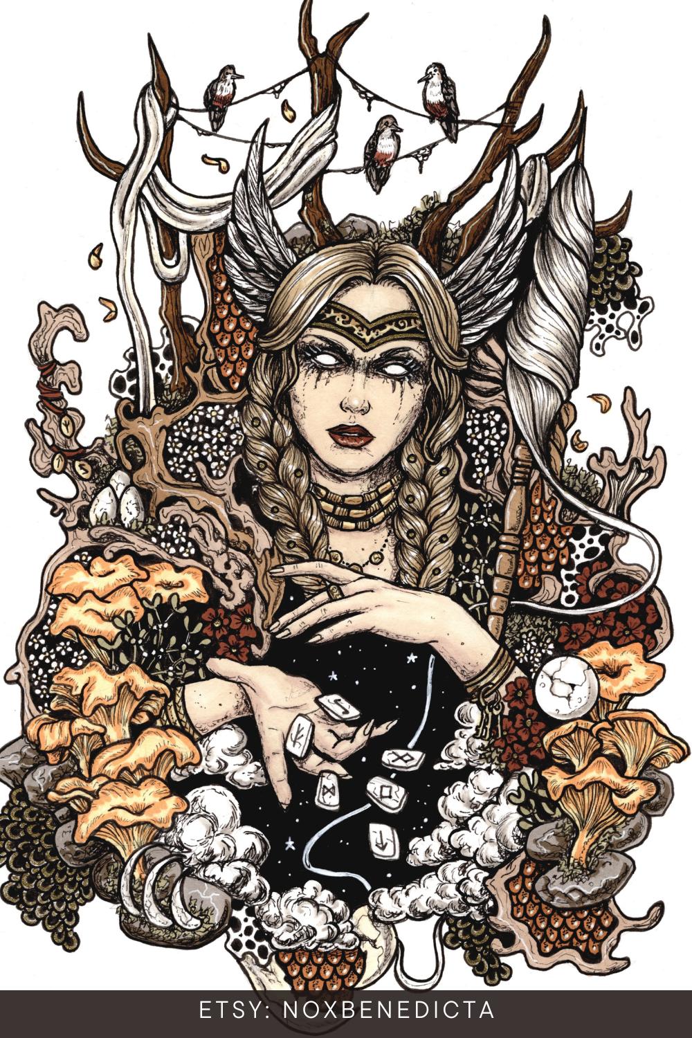 Фрейя - одна из самых почитаемых богинь скандинавской мифологии - оживает в этих прекрасных иллюстрациях. Художники интерпретируют ее образ через разные эпохи и стили, от традиционных викингских орнаментов до современных цифровых композиций. В работах мы видим Фрейю как величественную богиню в золотых доспехах, с молотом в руках; как нежную покровительницу любви с цветами и символами плодородия; как мудрую провидицу с вороном на плече. Каждая иллюстрация подчеркивает двойственную природу богини - воительницы и любящей матери, защитницы и соблазнительницы. Детали костюма тщательно проработаны: золотые браслеты Брисингамен, колесница, запряженная кошками, соколиные перья и магические артефакты. Эти изображения передают атмосферу древних саг, где Фрейя предстает как мост между мирами богов и людей. Коллекция вдохновляет на изучение норвежской мифологии и размышления о женской силе в разных ее проявлениях.