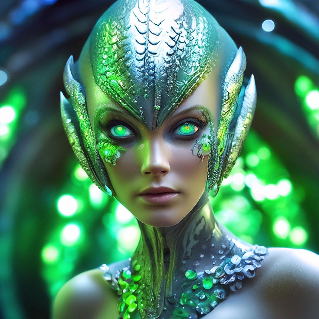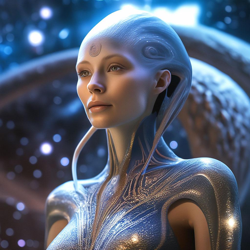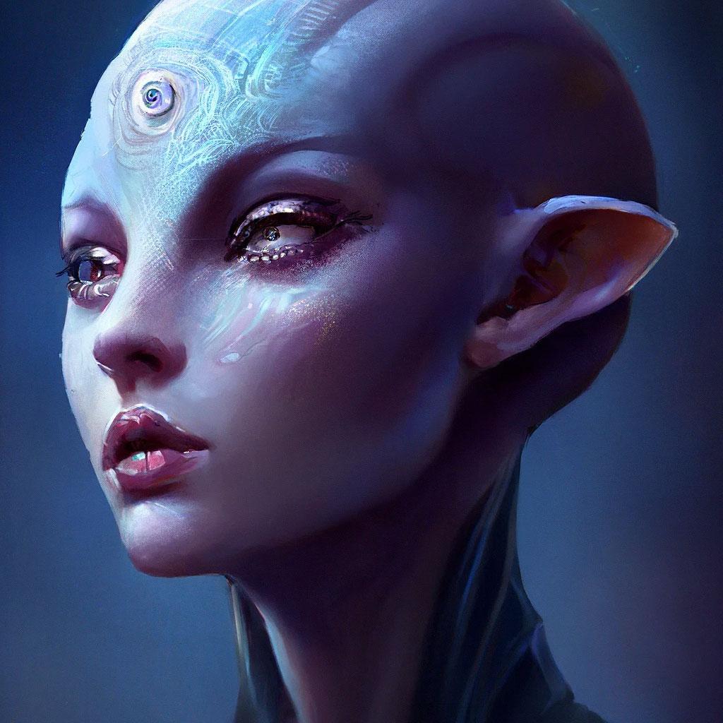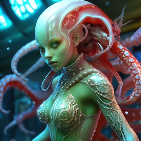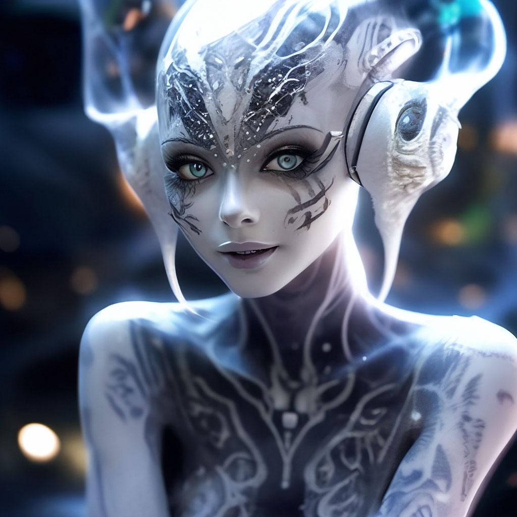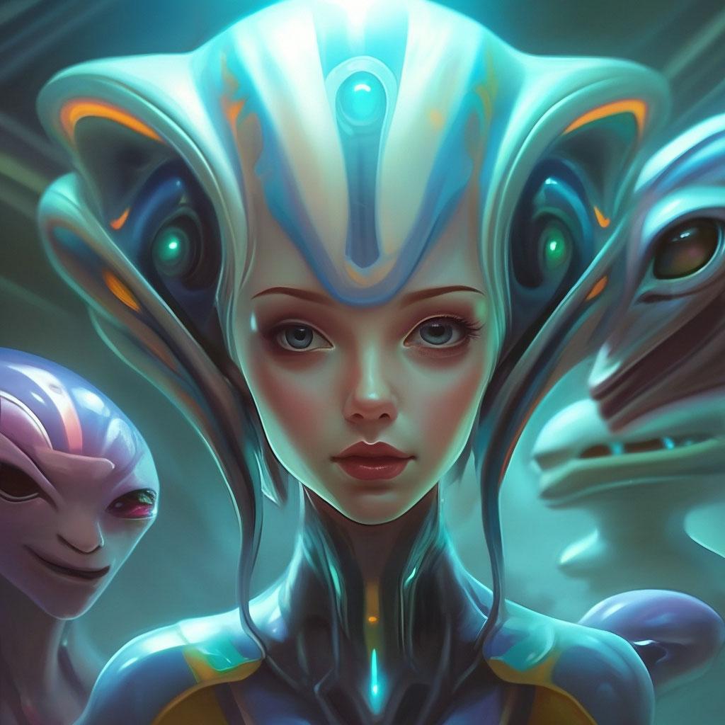 Инопланетные женщины предстают как воплощение разнообразия форм жизни во вселенной в иллюстрациях. Художник создает уникальные образы с нечеловеческими чертами - кристаллической кожей, энергетическими органами, адаптированными к разным планетарным условиям. Каждая работа исследует темы адаптации, эволюции и межзвездной коммуникации через призму женственности. В изображениях присутствуют футуристические элементы - нейронные импланты, биолюминесцентные органы, технологические артефакты, отражающие слияние органики и технологий. Инопланетные красавицы становятся метафорами бесконечного разнообразия форм жизни. Эти иллюстрации вдохновляют на размышления о будущем человечества и возможных формах разумной жизни в космосе.