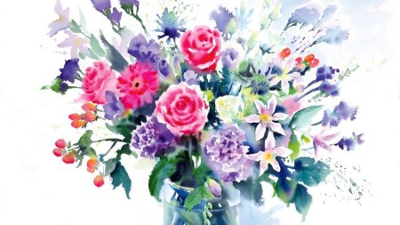 Букеты цветов в акварельной технике предстают в иллюстрациях как воплощение нежности и мимолетности красоты. Художники мастерски передают прозрачность красок - вода растворяет пигменты, создавая мягкие переходы и неповторимые текстуры. Каждая композиция рассказывает о сезоне - от весенних тюльпанов до осенних астр. Детальная проработка лепестков, стеблей и капель росы создает ощущение свежести и живости. Особое внимание уделяется цветовому балансу и композиции. Эти иллюстрации особенно ценны для любителей ботаники и поклонников акварельной живописи.