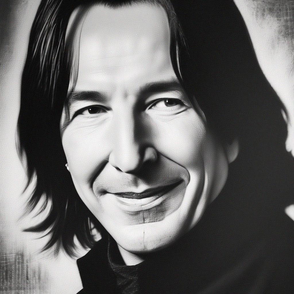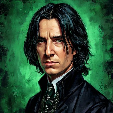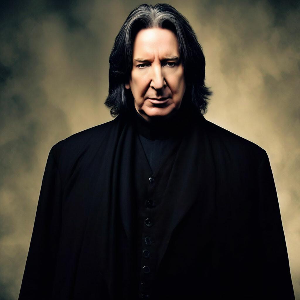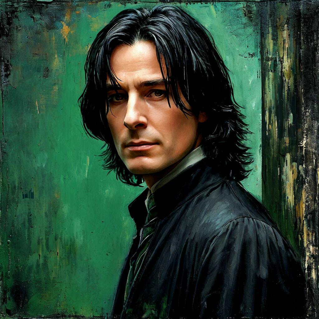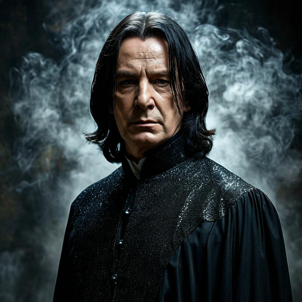 Алан Рикман в роли Северуса Снейпа создал один из самых запоминающихся образов в истории кино - сложного персонажа, сочетающего гениальность, преданность и глубокие внутренние конфликты. В этих фотографиях он предстает как мрачный профессор зельеварения с бледным лицом, пронизывающим взглядом и характерной копной черных волос. Художники акцентируют внимание на нюансах мимики - саркастическая улыбка, нахмуренные брови, глаза, скрывающие боль и мудрость. Тематические композиции включают сцены из фильмов: лекции в классе зельеварения, тайные встречи с Дамблдором, моменты разоблачения. Особое внимание уделяется деталям костюма - черная мантия профессора, серебряная брошь с символом Хогвартса, характерный нос. Эти изображения рассказывают историю о двойственной натуре, о жертвах во имя высшего блага и о том, что истинный героизм часто скрыт под маской антагониста. Цветовая палитра строится на темных тонах - черная мантия, бледная кожа, серебряные акценты. Снейп становится символом сложных персонажей, чьи мотивы раскрываются постепенно, напоминая зрителям о том, что первое впечатление может быть обманчивым.
