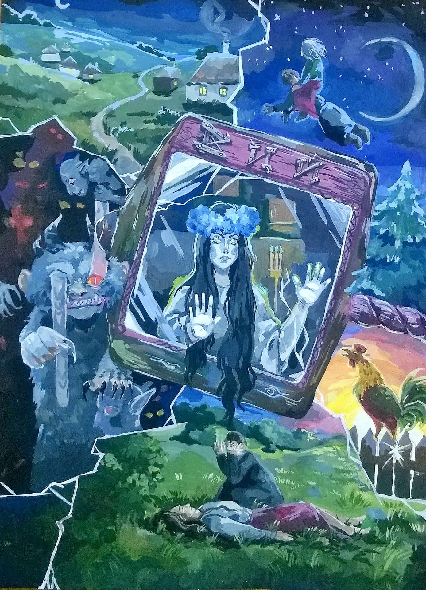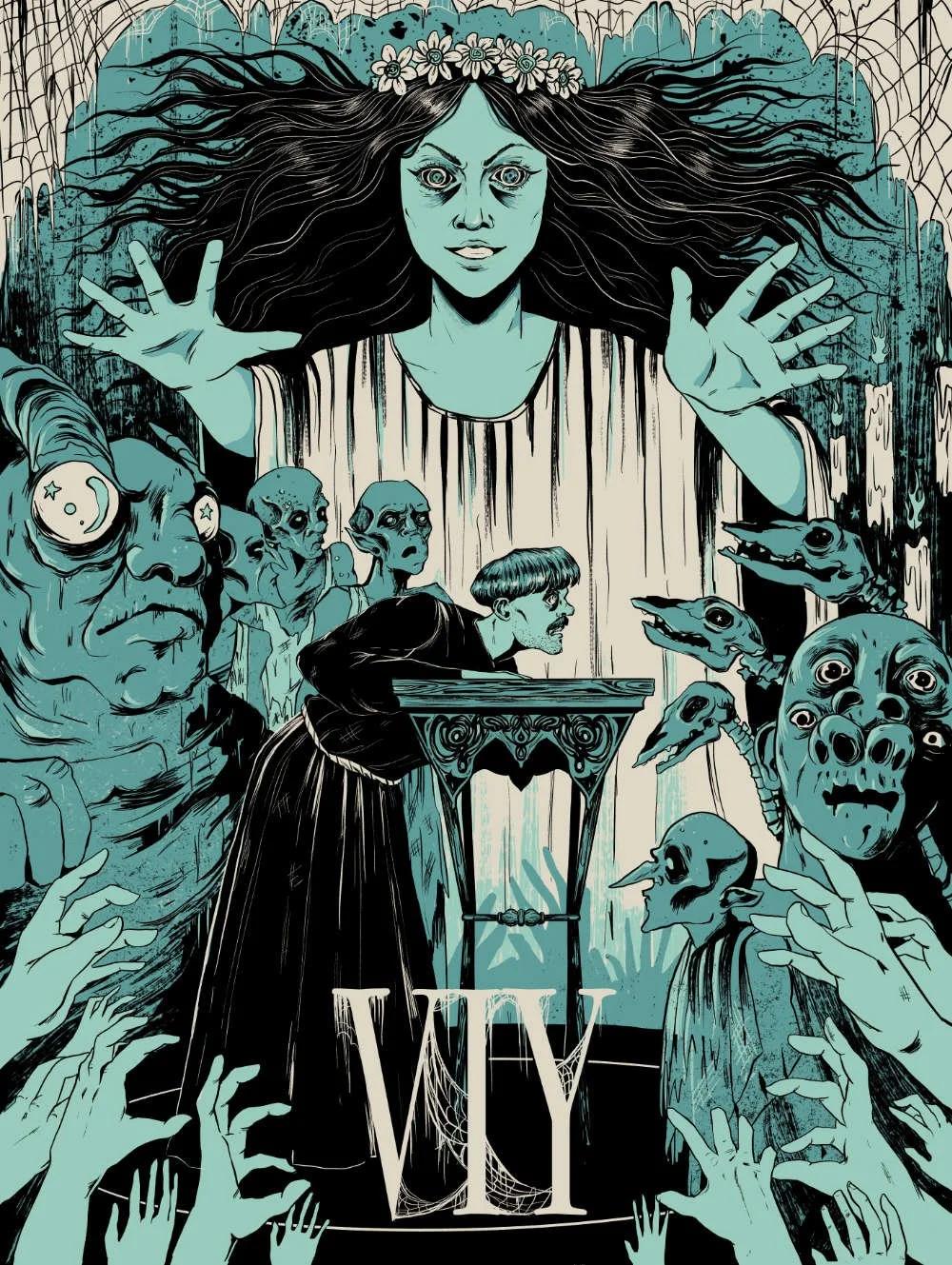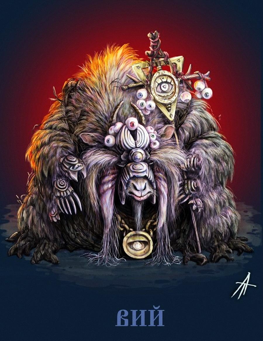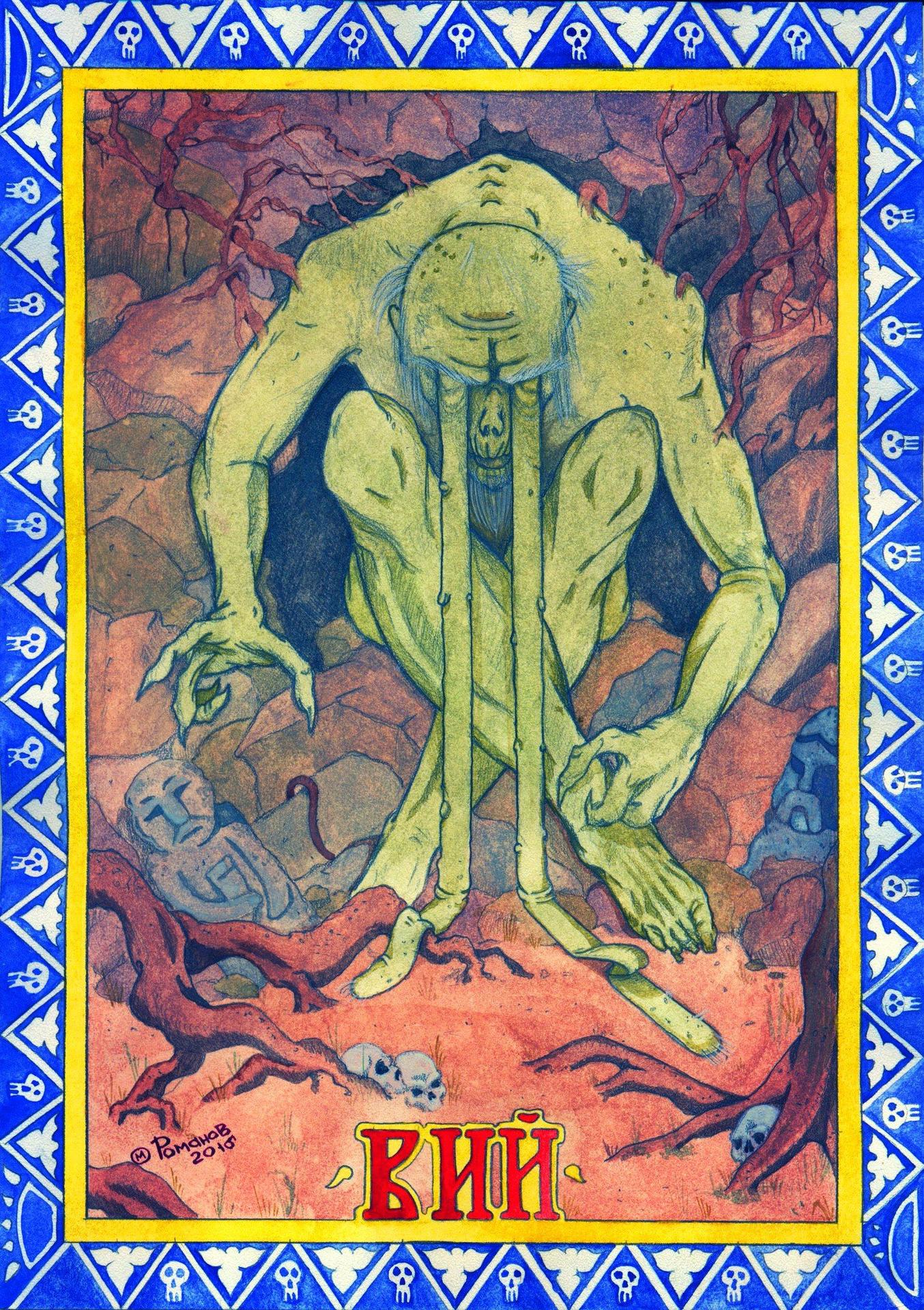 Вий представляет собой могущественного духа в славянской мифологии, повелителя мертвых. Эти иллюстрации показывают его страшную силу и таинственность. Художники используют темные тона и загадочные формы. Каждый элемент несет атмосферу ужаса. Тематика затрагивает темы смерти, загробного мира и сверхъестественного. Эти изображения стали классикой славянского фольклора.