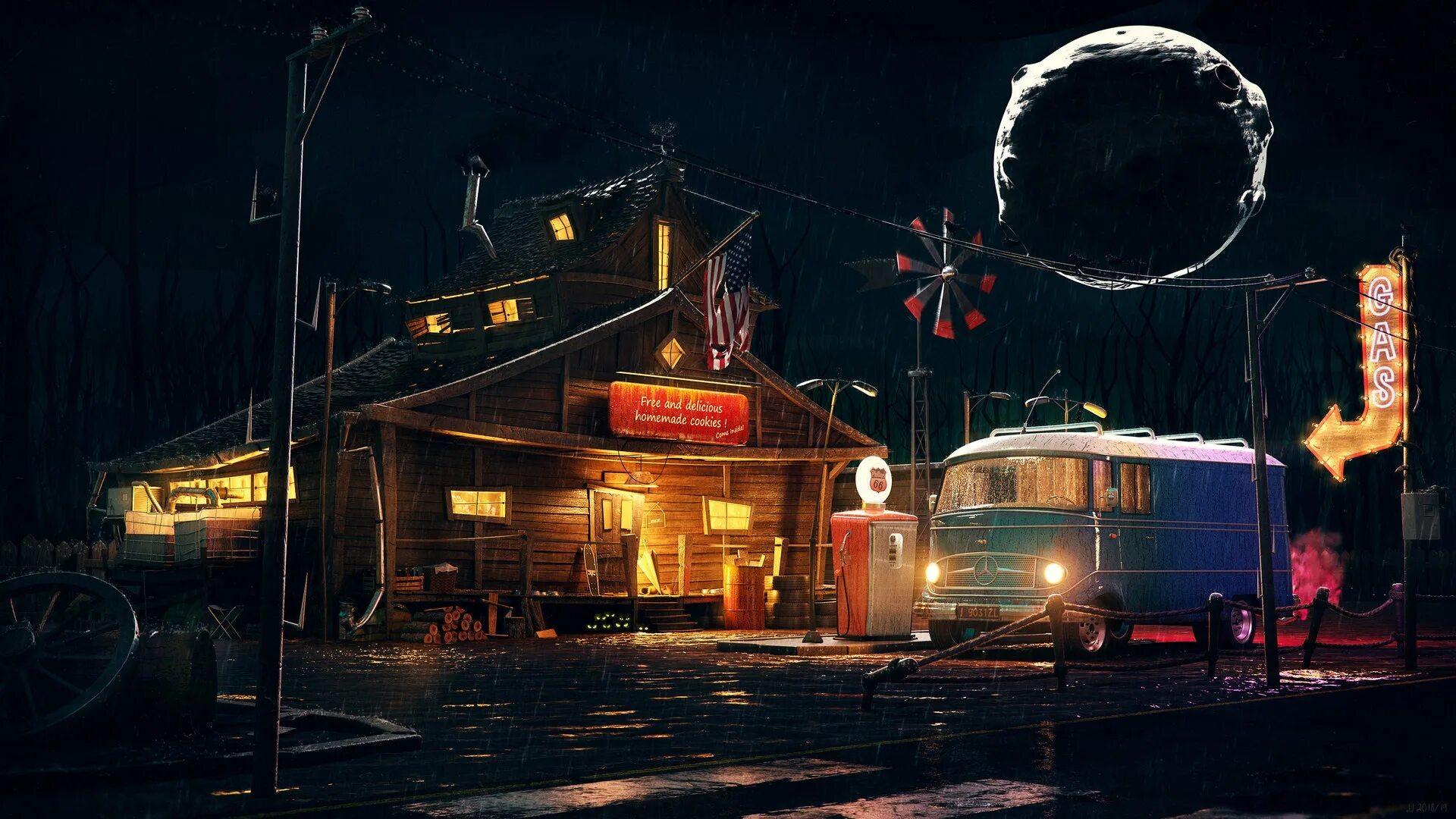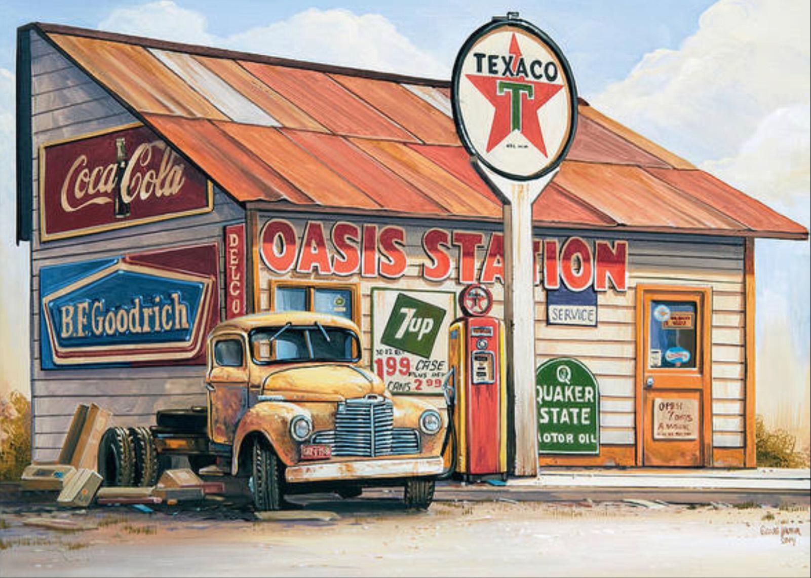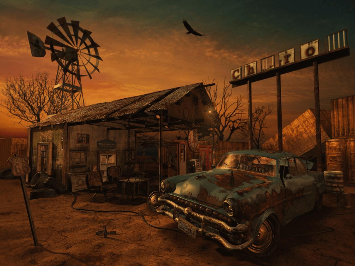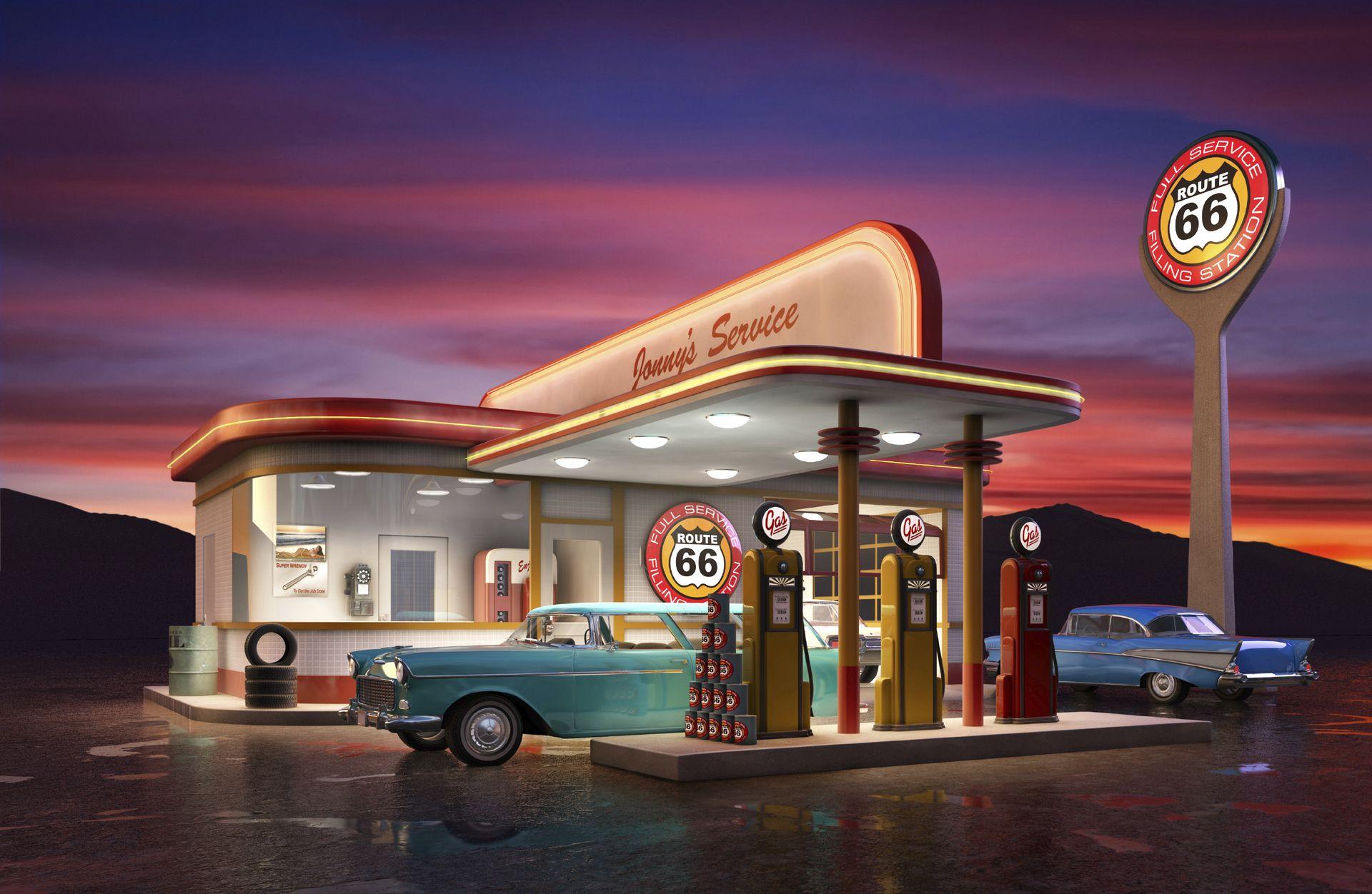 Эти атмосферные иллюстрации старой заправки переносят в эпоху расцвета автомобилизма середины XX века. Художники мастерски передают архитектуру типичной бензоколонки с ее насосами, вывесками и атмосферой ожидания. Потертая краска, ржавчина и следы времени создают ощущение ностальгии. Классические автомобили и атмосфера дорог усиливают романтику. Такие изображения идеально отражают изменения в автомобильной культуре. Они станут отличным украшением для коллекций ретро-фотографий и любителей истории транспорта.