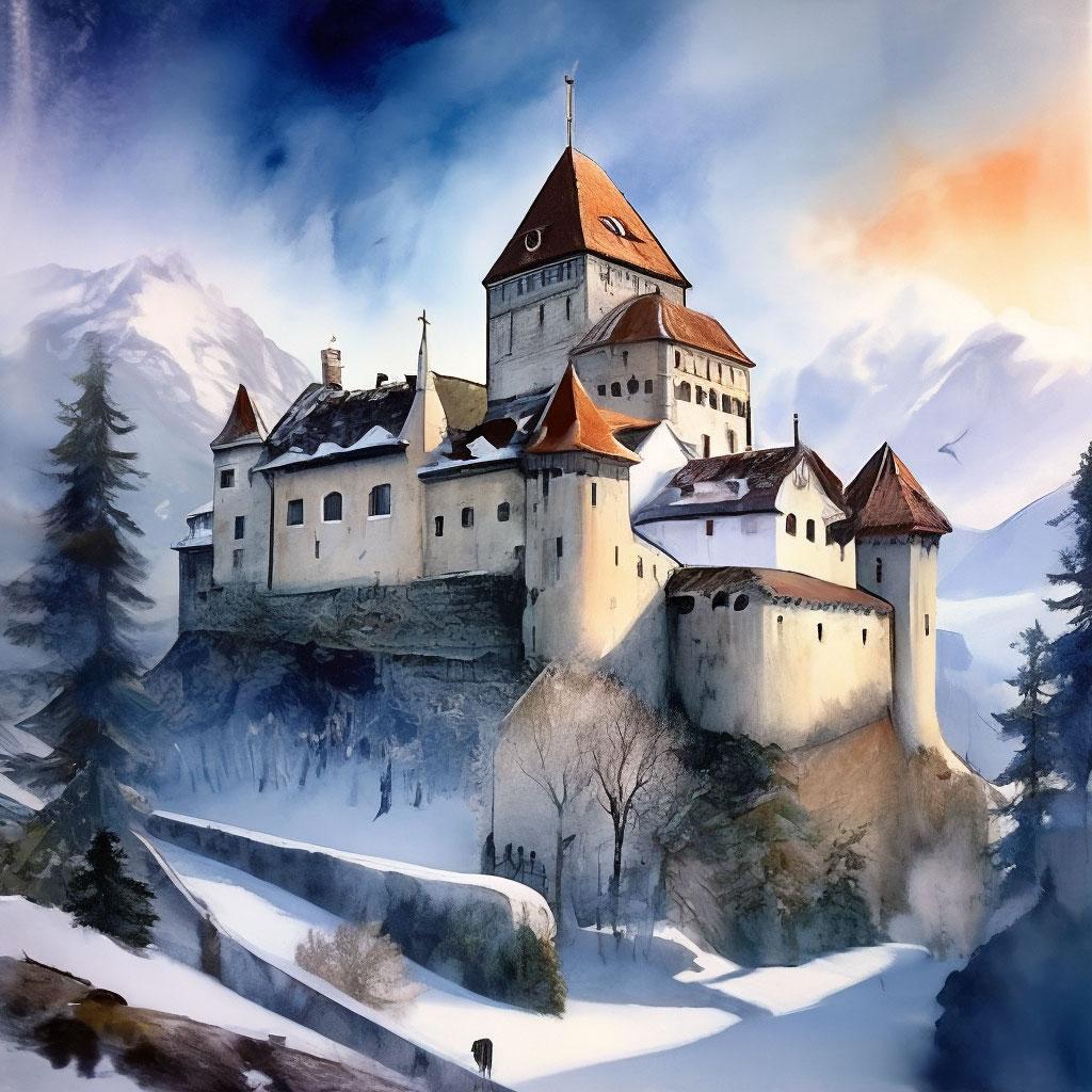 Замок Лихтенштейн возвышается над австрийскими Альпами как живое воплощение средневековой романтики, где каменные стены хранят секреты многих поколений. Его архитектура сочетает мощь оборонительных сооружений с изяществом дворцовых помещений, создавая гармоничный образ, полный истории и величия. В иллюстрациях художники передают атмосферу различных времен года - от снежных зимних пейзажей до цветущих весенних садов, подчеркивая, как замок интегрируется в окружающий ландшафт. Каждая работа раскрывает архитектурные детали: готические арки, рыцарские залы, потайные ходы и обзорные башни с потрясающими видами на долины. Коллекция включает исторические реконструкции различных эпох - от первоначального строительства до современных реставраций. Особое внимание уделяется легендам, связанным с замком: о рыцарях-хранителях, о тайных сокровищах и о романтических историях, произошедших за этими стенами. Многие иллюстрации сопровождаются описаниями архитектурных особенностей и историческими фактами, что делает коллекцию не только художественной, но и познавательной.