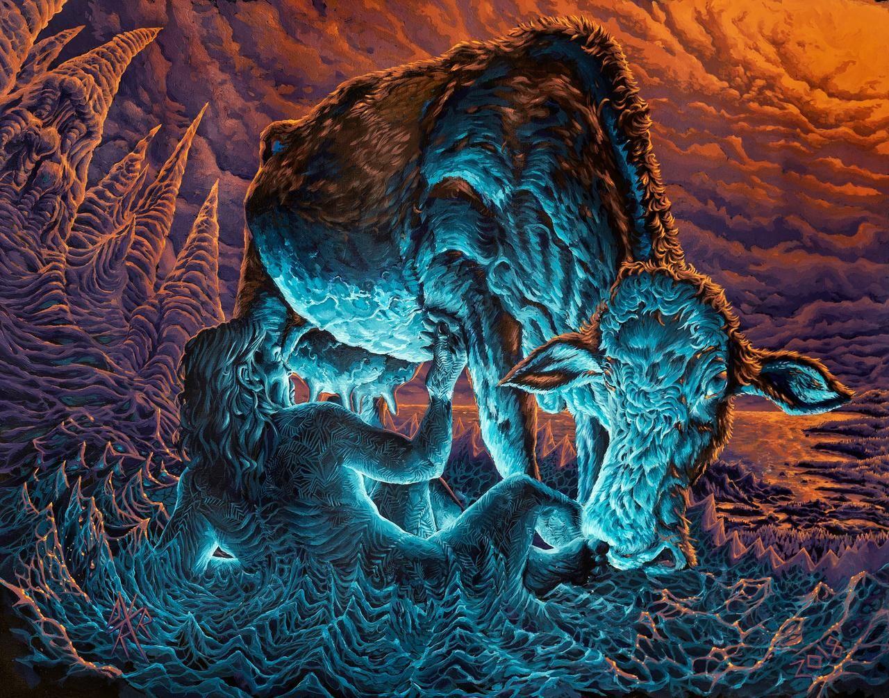 Познакомьтесь с Имиром - гигантским существом из скандинавской мифологии, чье тело стало основой для создания мира. Эти иллюстрации передают мощь и величие первосущества, рожденного из ледяного хаоса Нифльхейма. Художники изображают Имира как колоссальную фигуру, покрытую льдом и снегом, с глазами, подобными ледяным озерам. Каждый рисунок рассказывает часть древней саги: от момента рождения из тающего льда до жертвоприношения, которое дало жизнь богам и миру. Фотографии и цифровые арты сочетают элементы традиционной скандинавской культуры с современными художественными техниками, создавая атмосферу эпической мифологии. Эти изображения вдохновляют на размышления о происхождении мира и циклах жизни и смерти в северных легендах.