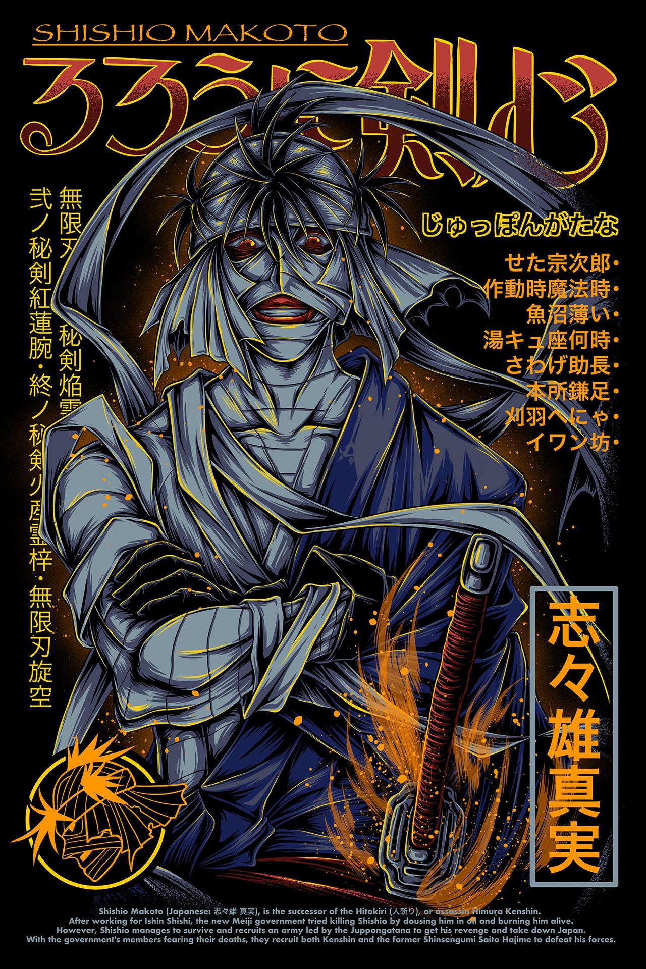 Шишио Макото становится воплощением идеи, что настоящая сила рождается из преодоления собственных слабостей. В этих иллюстрациях мы видим не просто воина, а философа с мечом. Каждая картинка наполнена атмосферой - от горящих ран до решительного взгляда. Тематические элементы включают самурайские традиции, боевые искусства, внутренние демоны и ощущение непреклонности. Арты передают идею, что настоящий воин побеждает не врагов, а самого себя.