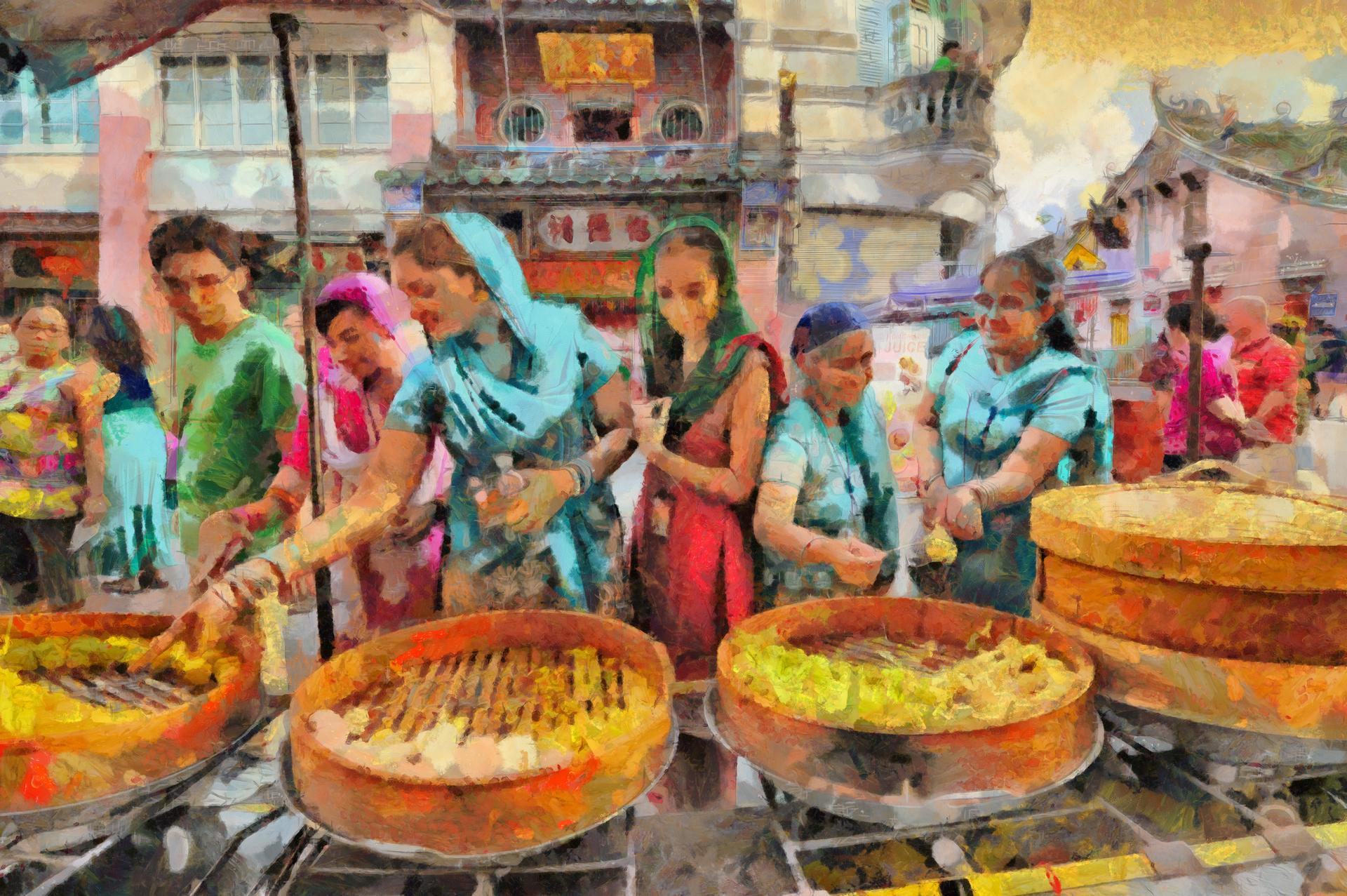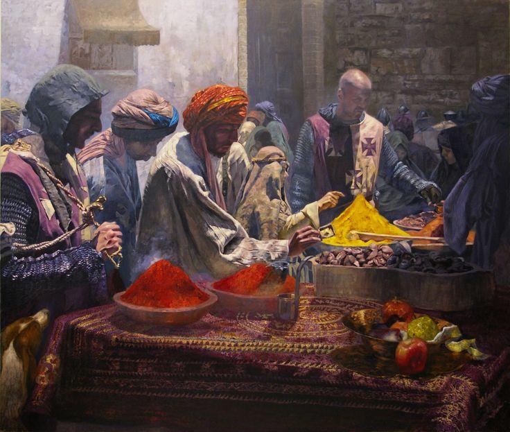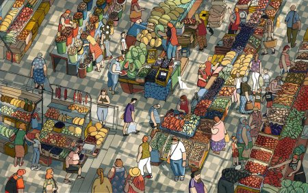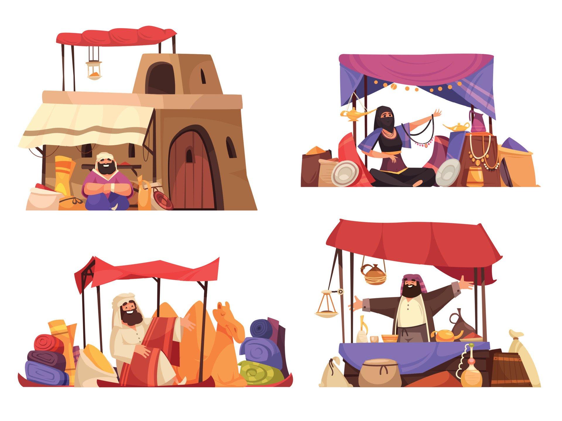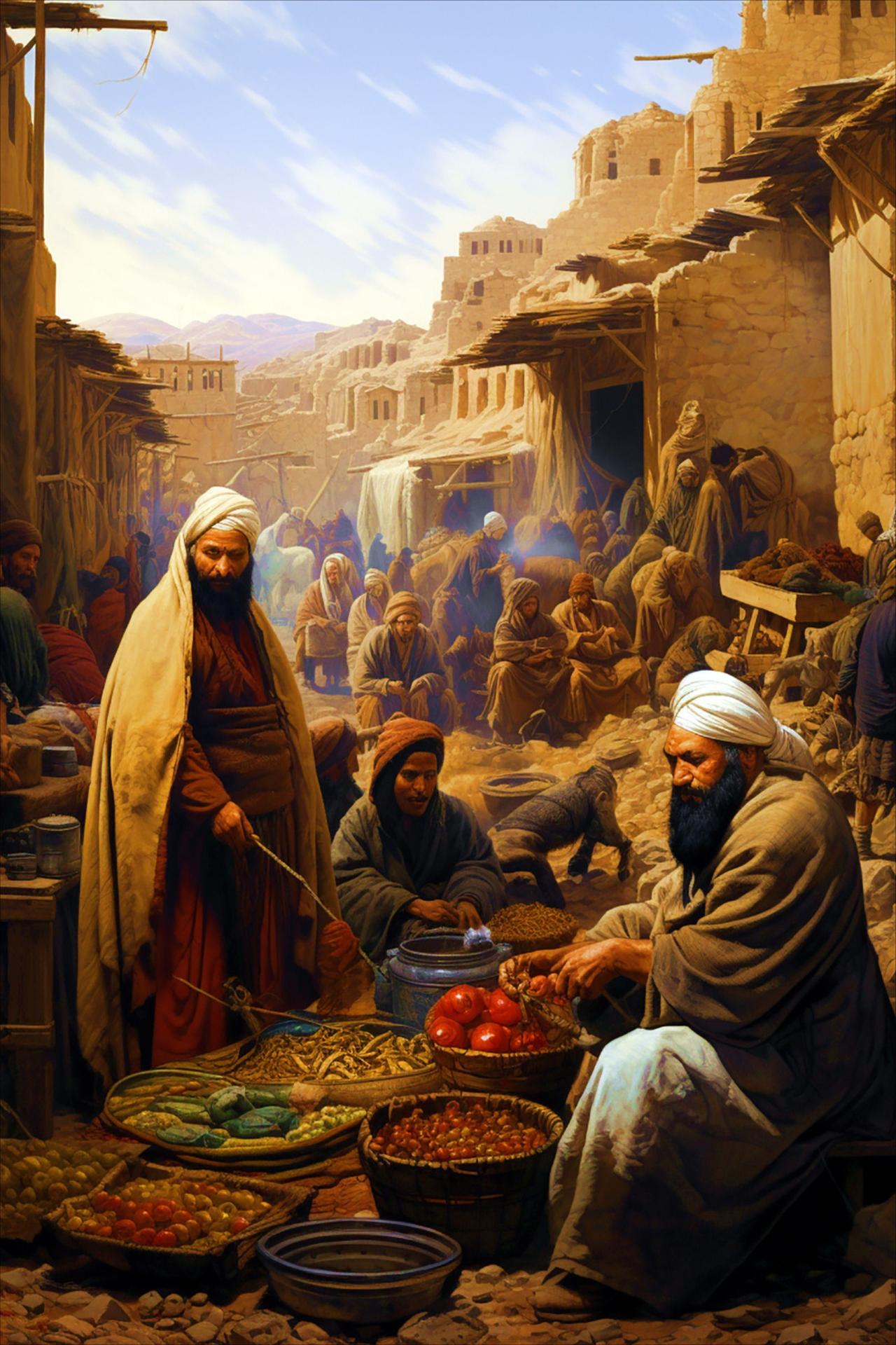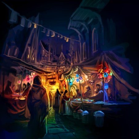 В этой коллекции оживает восточный базар как центр культурного обмена. Каждый арт показывает сцены торговли: специи, ткани, изделия ремесла. Изображения передают атмосферу суеты и гостеприимства. Особое внимание уделено деталям: товарам, архитектуре, людям. Эти иллюстрации воплощают темы разнообразия, обмена и культурного богатства.