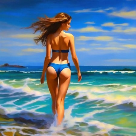 Коллекция переносит на золотые пляжи, где девушки становятся частью морской симфонии в художественных интерпретациях. Каждый арт сочетает реализм пляжных сцен с элементами импрессионизма или абстракции, где песок, волны и солнце создают гармоничный фон для женских образов. Изображения варьируются от динамичных сцен игр с водой до спокойных портретов в contemplation, передавая разнообразие пляжного отдыха. Особое внимание уделено цветовому балансу: теплым песочным тонам, прохладным водным оттенкам и игре света на коже. Эти работы воплощают концепцию гармонии между человеком и природой, вдохновляя на размышления о простоте летнего отдыха и его влиянии на творческое восприятие мира.