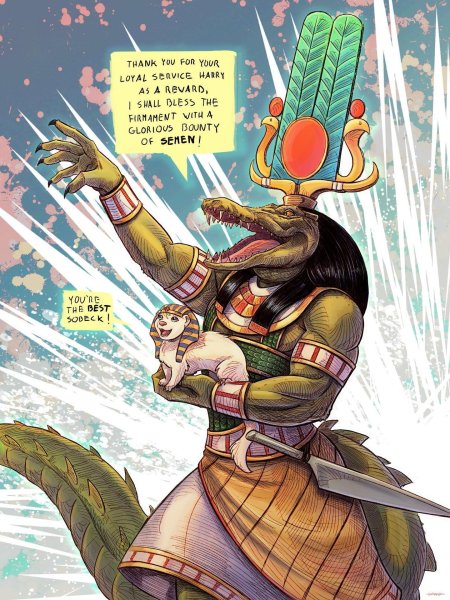 Себек оживает в коллекции как преданный страж из Twisted Wonderland с его крокодиловой природой и страстью к служению, воплощающий темы лояльности и внутренней борьбы. Фан-арты запечатлевают его в различных проявлениях: от торжественных поз до моментов сомнения, подчеркивая его зеленую кожу, острые зубы и эмоциональную глубину. Художники используют водные эффекты и драматические композиции для передачи его характера. Тематические иллюстрации включают дворцовые церемонии, водные приключения, личные драмы и моменты верности, исследуя темы долга, самопознания и гармонии между разными натурами в волшебном мире.