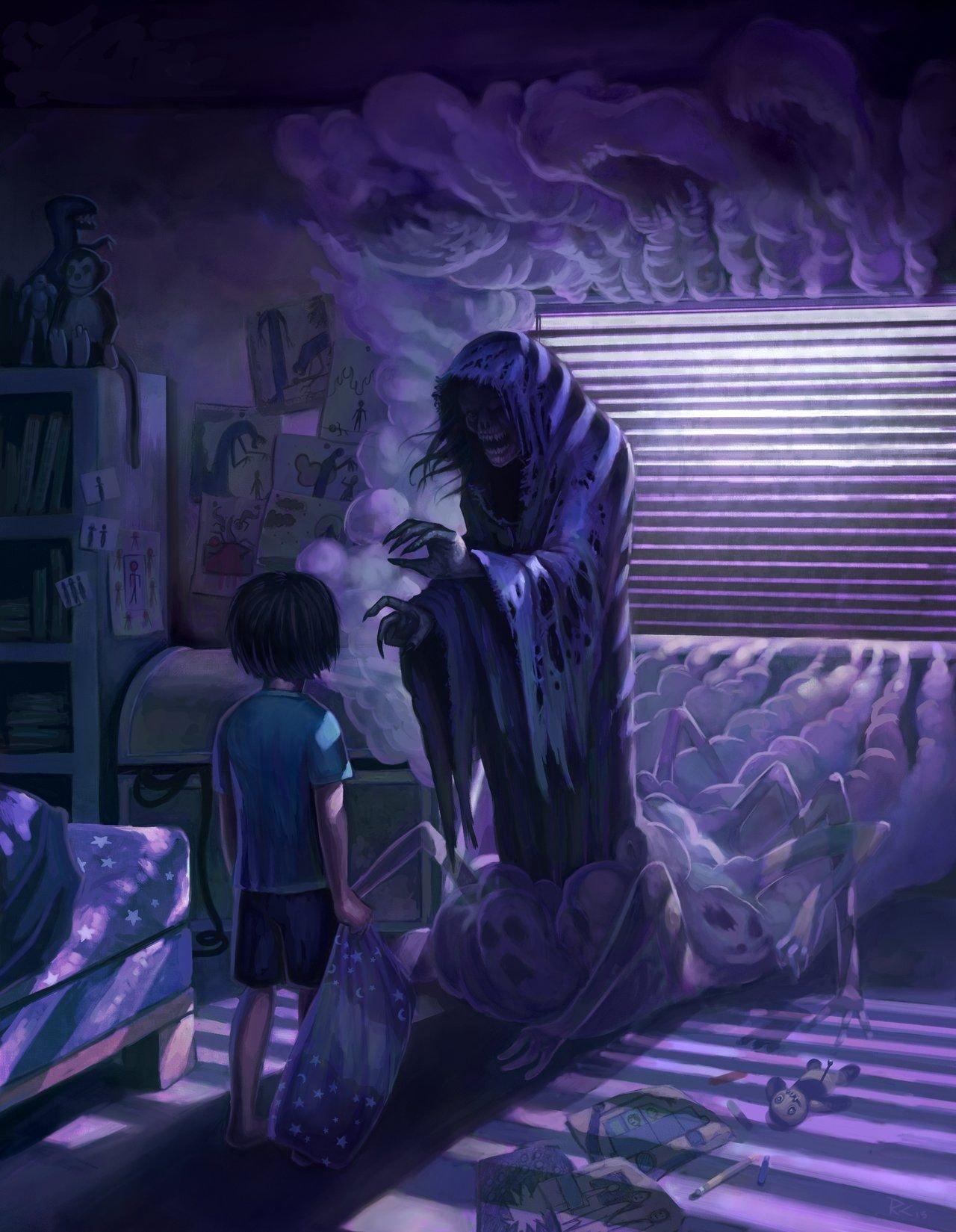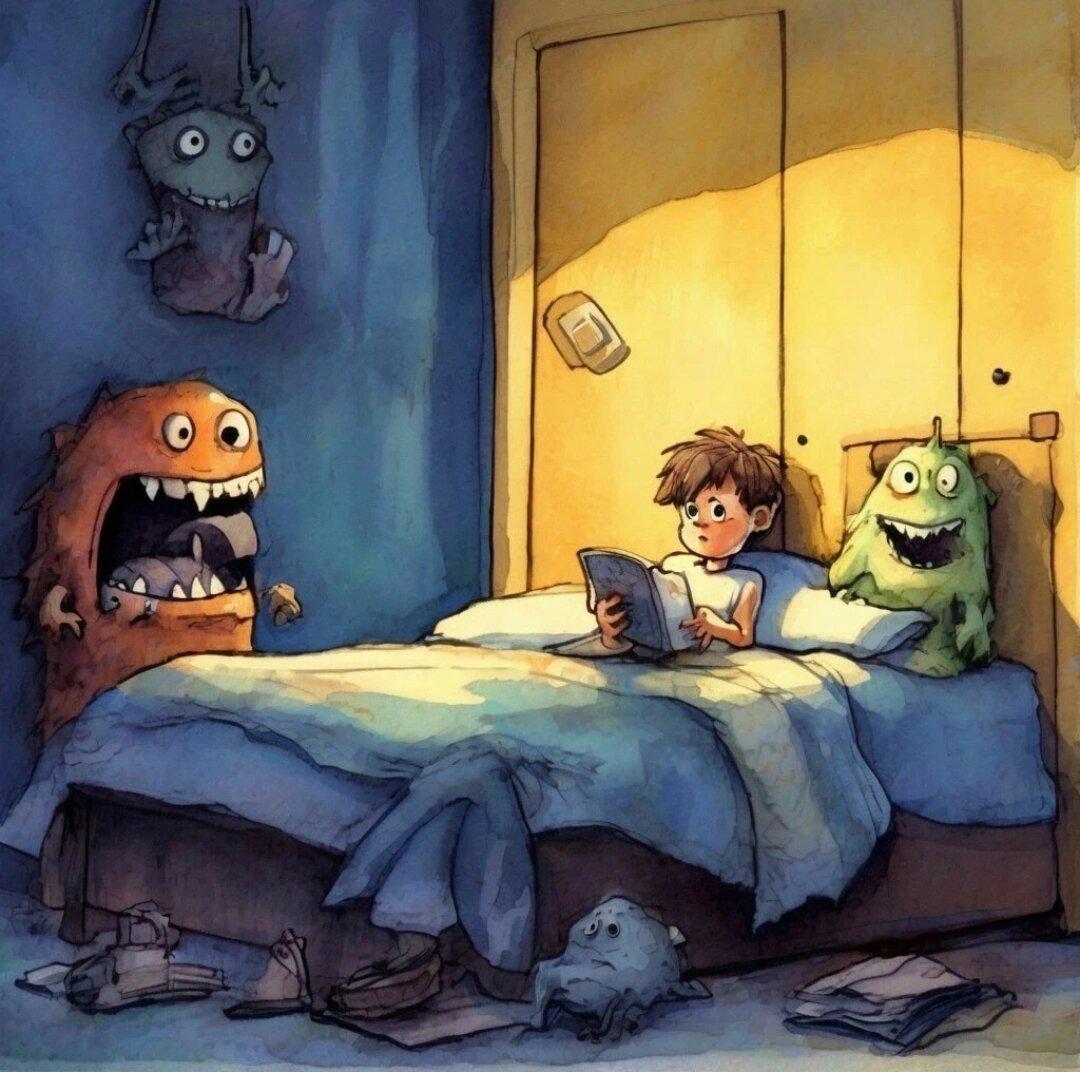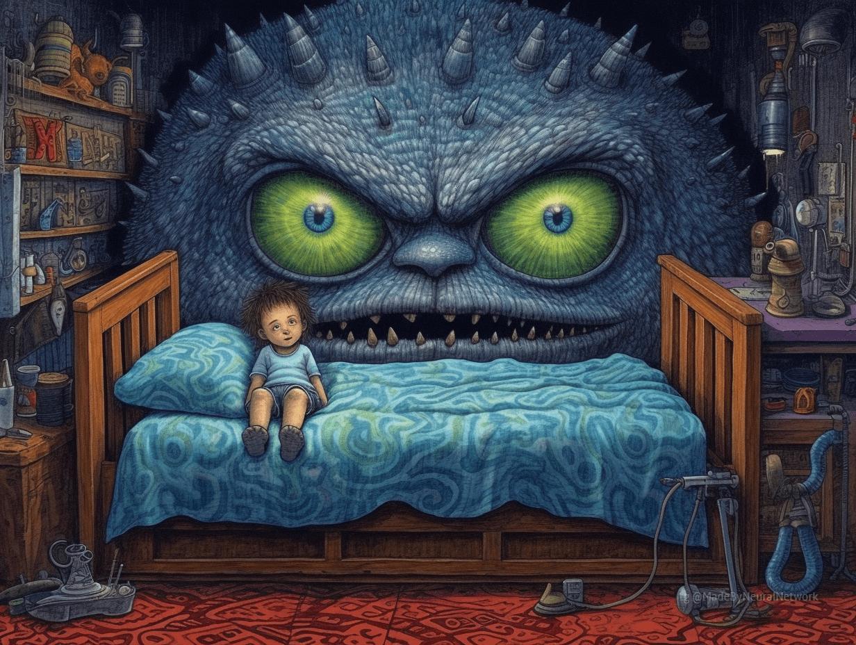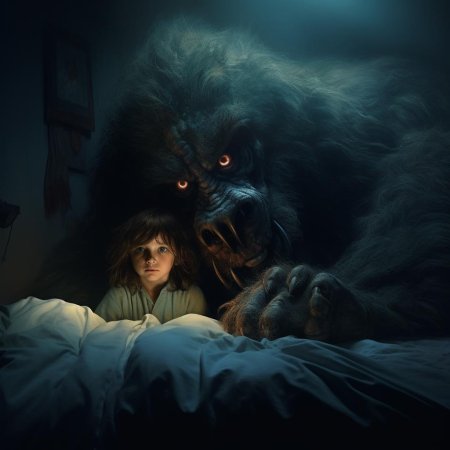 Монстр под кроватью оживает в детских кошмарах, становясь воплощением скрытого страха и воображения. Эти иллюстрации показывают разнообразие ужасов: от когтистых лап до горящих глаз в темноте. Каждый кадр несет заряд напряжения, передавая атмосферу бессонных ночей. Прекрасный материал для страшных историй, комиксов или просто как символ преодоления детских страхов. Детальная проработка теней, форм и окружающей обстановки делает каждое изображение атмосферным.