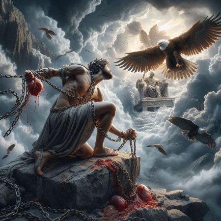 Прометей становится воплощением героизма и самопожертвования, где его цепи символизируют борьбу за свободу духа. Эти иллюстрации передают атмосферу древних легенд: могучие мускулы, огонь в руках, орлы, клюющие печень. Каждый кадр несет заряд трагизма, рассказывая о цене прогресса. Прекрасный материал для изучения греческой мифологии, создания атмосферы драмы или просто как символ борьбы за знания. Детальная проработка форм, цепей и огня делает каждое изображение эпичным.