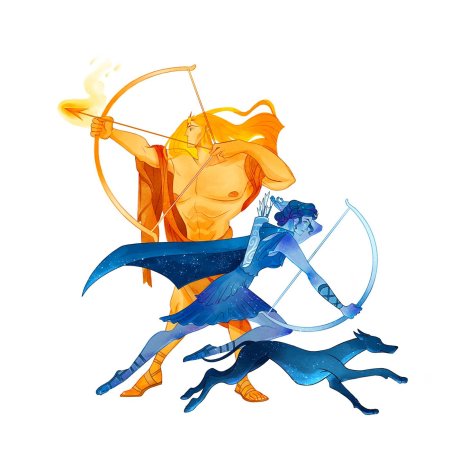 Артемида и Аполлон становятся олицетворением космической гармонии, где лунная богиня и солнечный бог дополняют друг друга в вечном танце. Эти иллюстрации показывают их в различных аспектах: Артемида с луком среди лесов, Аполлон с лирой в золотом сиянии. Каждый образ тщательно проработан, от атрибутов до окружающей атмосферы. Прекрасный материал для изучения греческой мифологии, создания поэтических композиций или просто как символ равновесия. Детальная проработка форм, света и символики делает каждое изображение значимым.