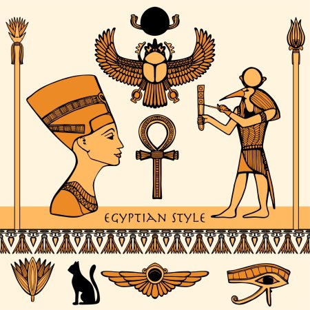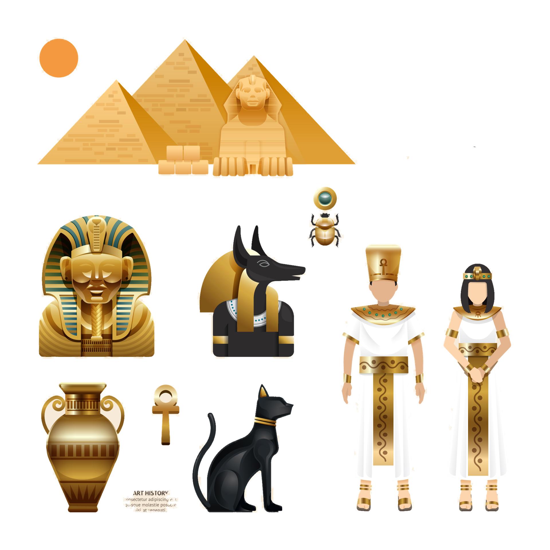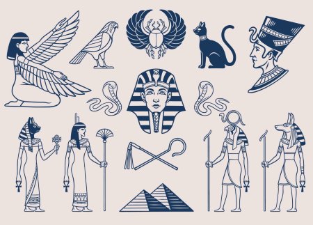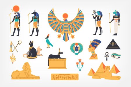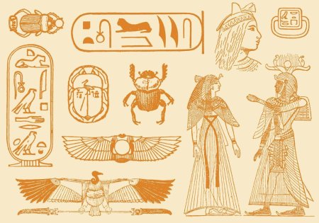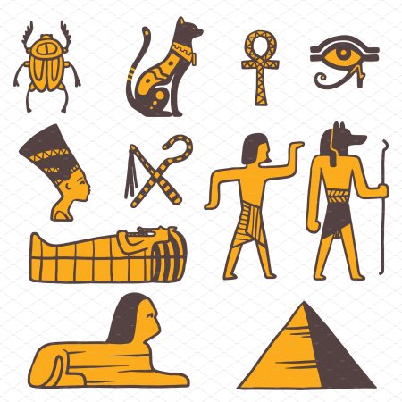 Египетский стиль переносит в мир фараонов, где каждый элемент несет тысячелетнюю мудрость - от величественных пирамид до изысканных иероглифов. Эти иллюстрации демонстрируют гармонию форм: золотые маски, колонны с лотосами, статуи с королевским достоинством. Каждый дизайн тщательно проработан, от текстур камня до символических элементов. Прекрасный материал для изучения истории, создания атмосферы тайны или просто как источник вдохновения для любителей античности. Разнообразие элементов делает коллекцию универсальной для различных проектов.