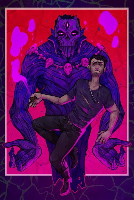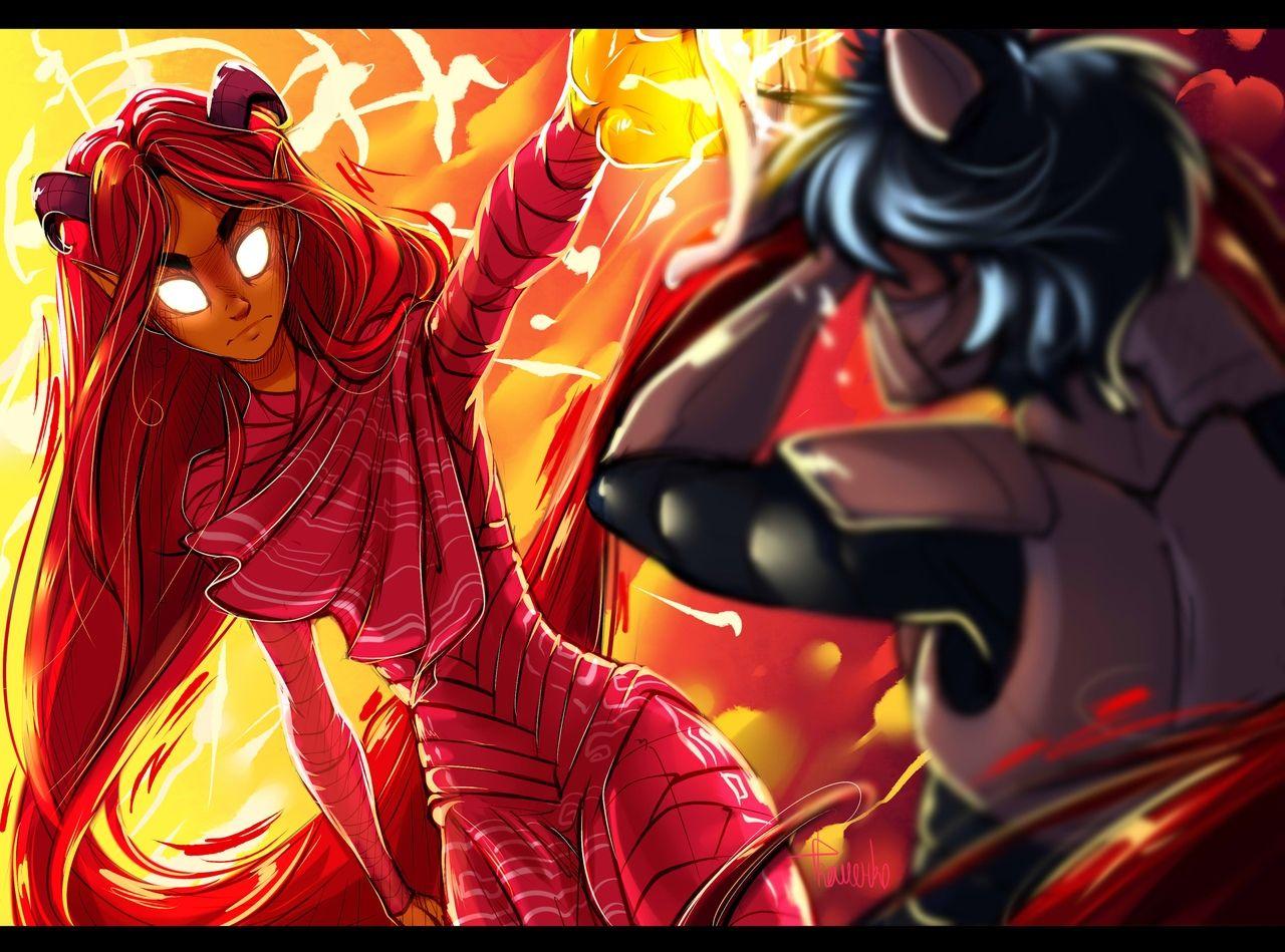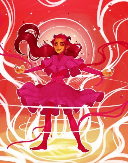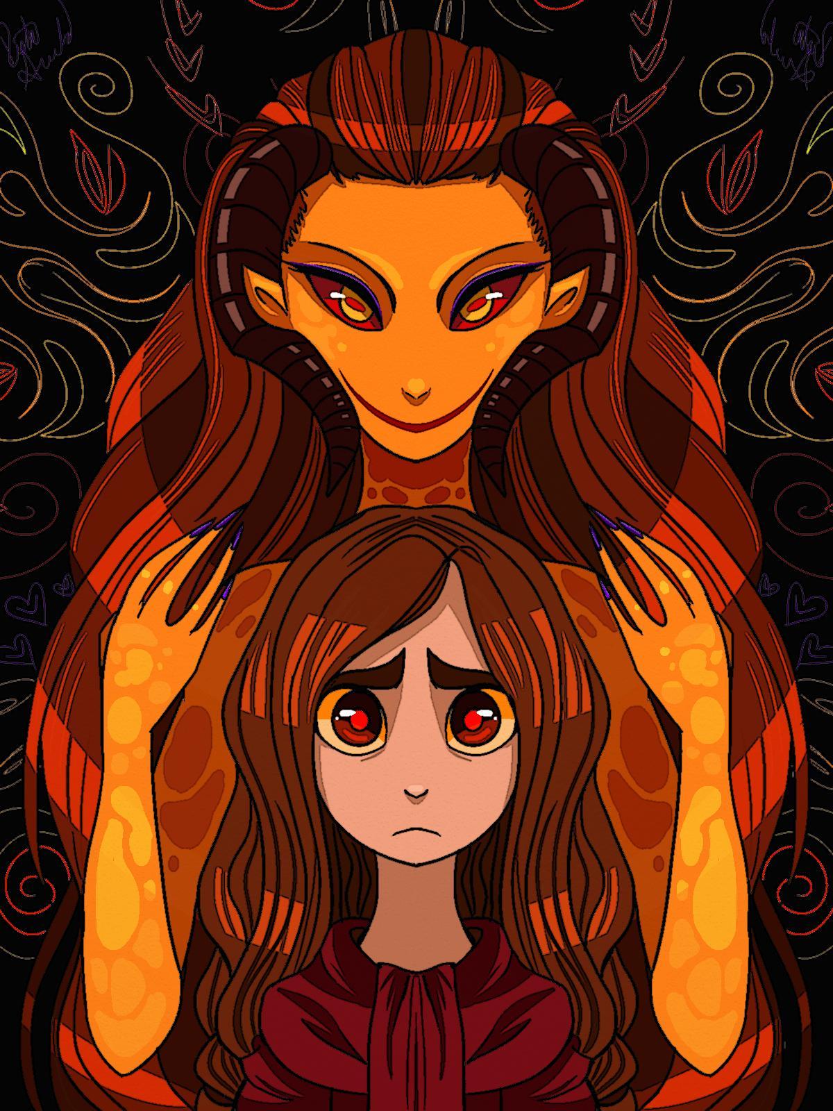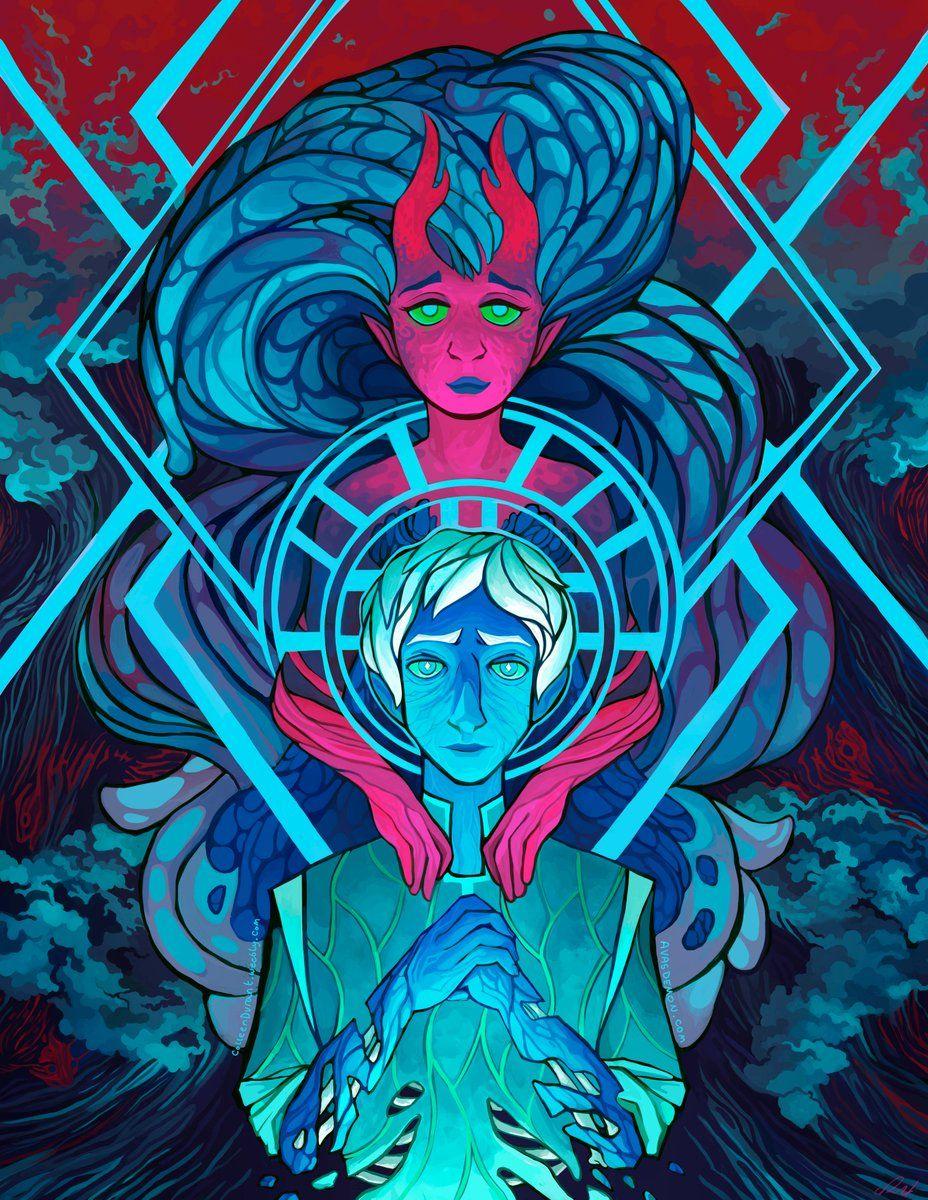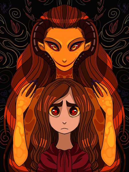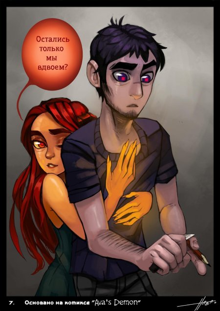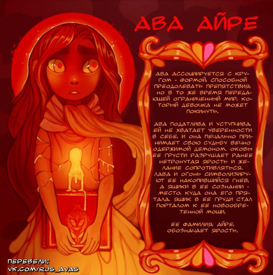 История Авы и её демона - исследование темы двойственности души. Эти иллюстрации показывают их взаимодействие: от напряженных моментов до моментов единения. Художники используют контраст, чтобы передать конфликт. Каждая сцена рассказывает о внутренней борьбе между светом и тьмой.