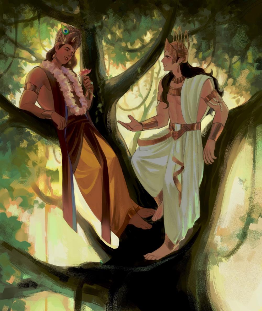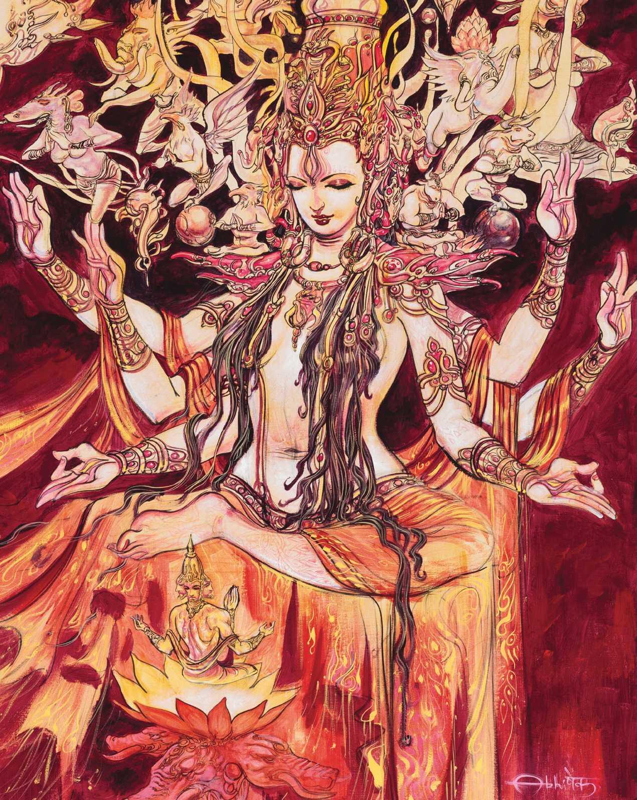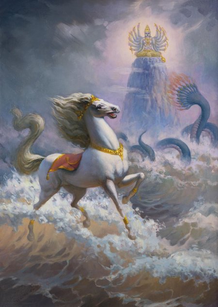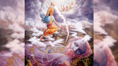 Индра - царь богов в ведической традиции, повелитель грома и дождя. Эти иллюстрации показывают его в разных ипостасях: от воинственных битв до мирных церемоний. Художники используют традиционные символы, чтобы передать его величие. Каждая сцена рассказывает о космическом порядке и божественной силе.