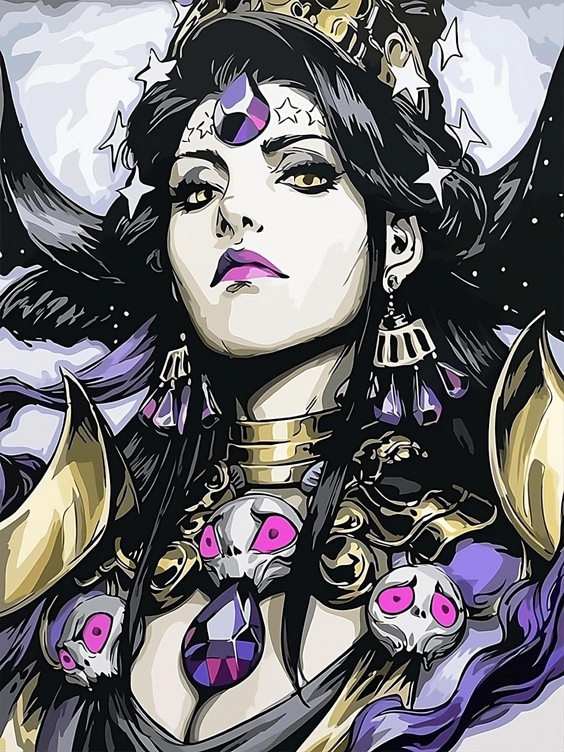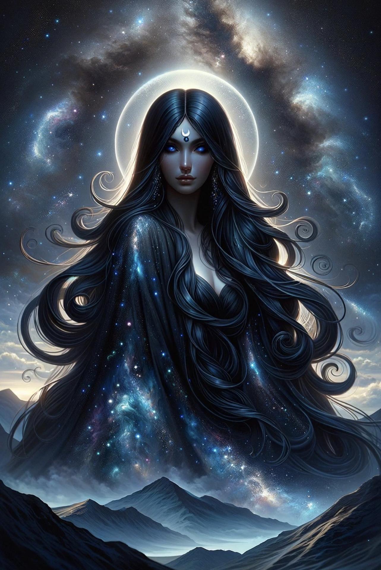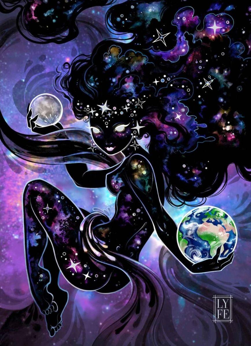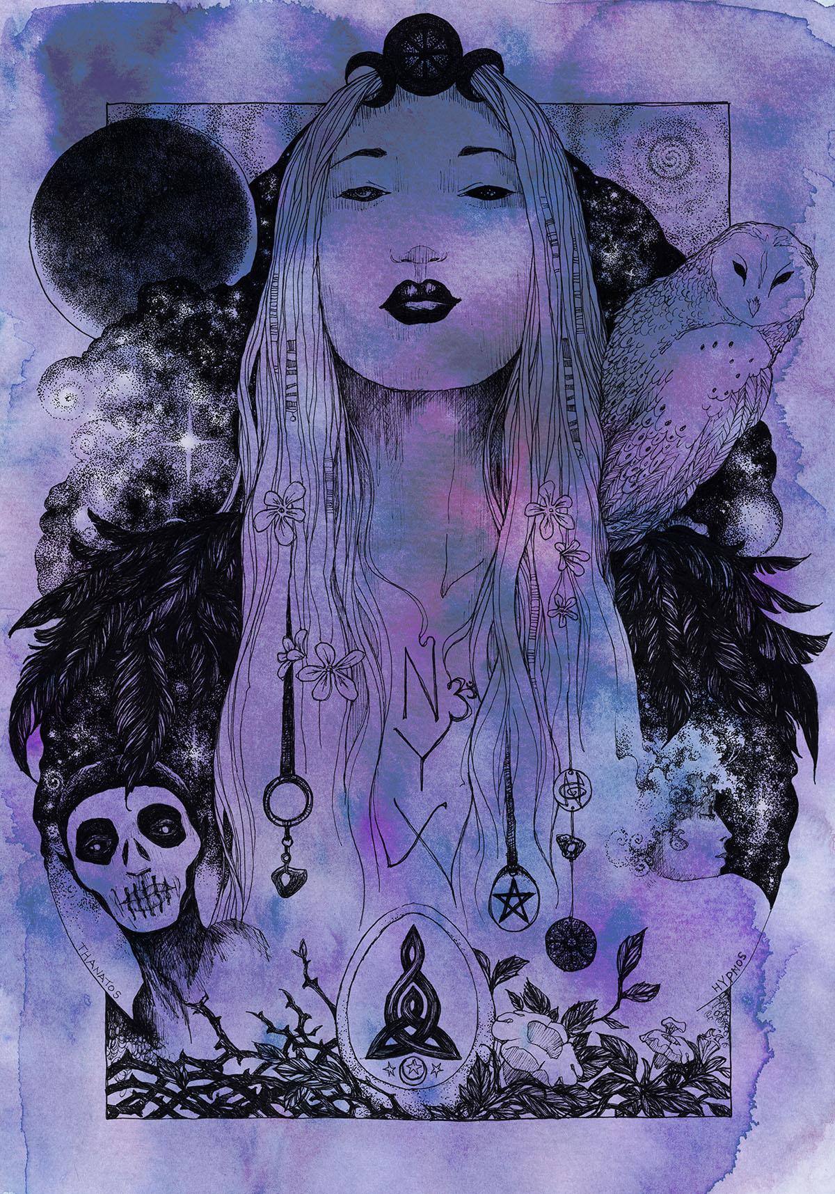 Никс - древнегреческая богиня ночи, мать всех снов и тайн, воплощающая одновременно покой и неизведанные глубины. В этих иллюстрациях она показана в различных ипостасях - от величественной богини до таинственной ночной странницы. Художники используют темную палитру - глубокие синие, фиолетовые, черные тона, - и звездные элементы. Особенно впечатляют сцены с ее детьми - Гипносом, Танатосом, Морфеем, - и взаимодействием с лунным светом. Каждая иллюстрация передает атмосферу ночной магии и уважение к темным аспектам жизни.