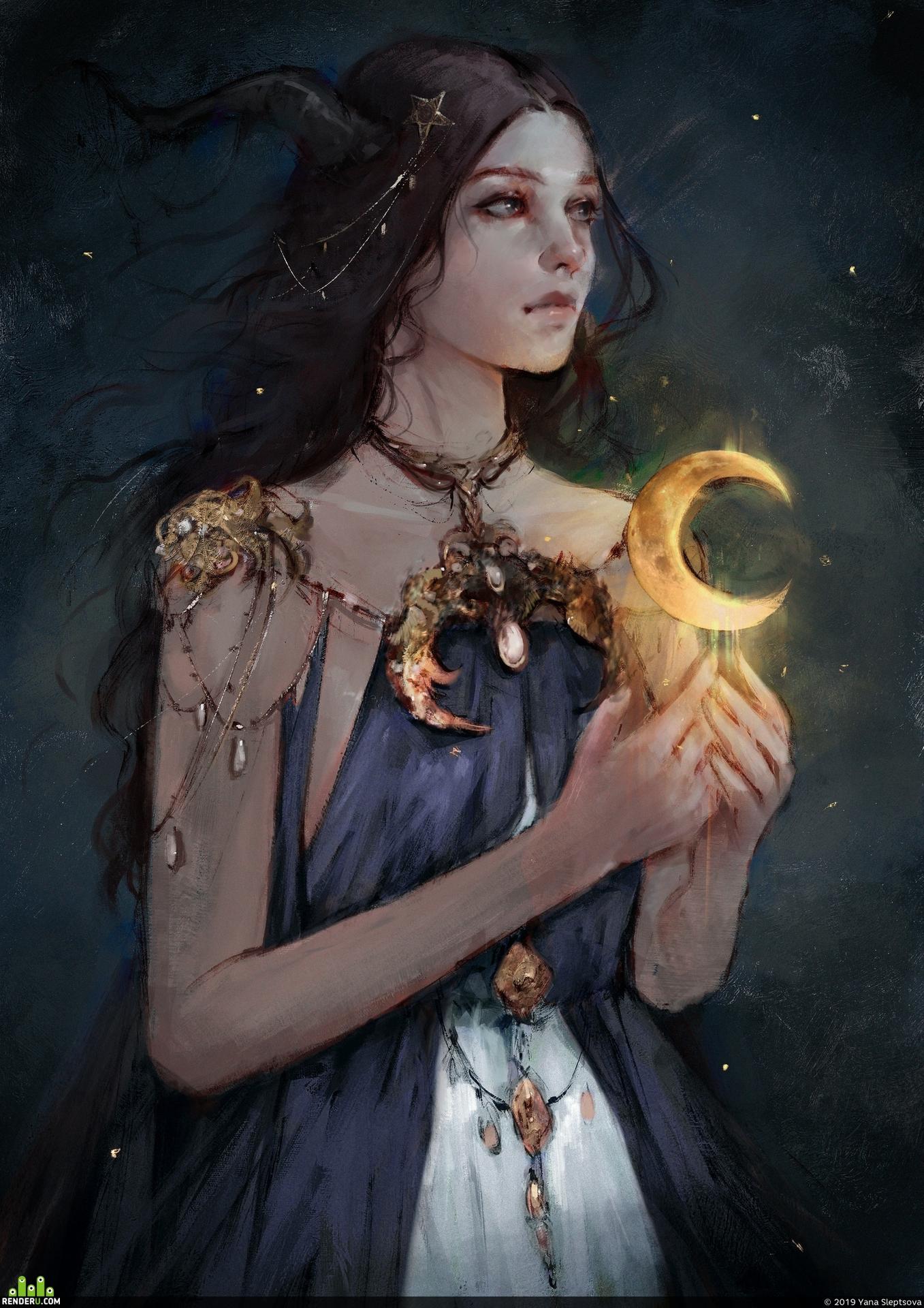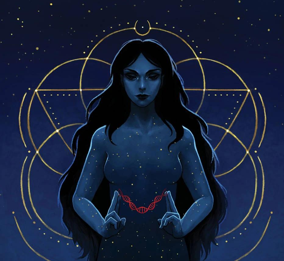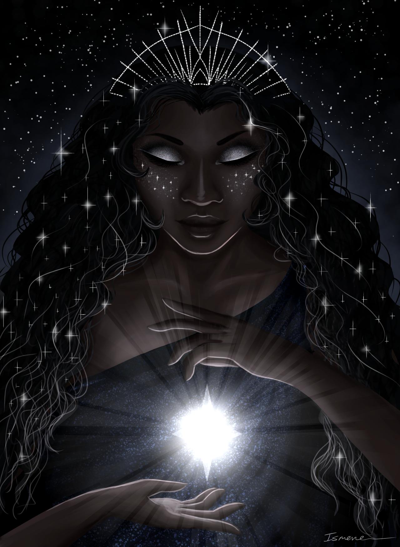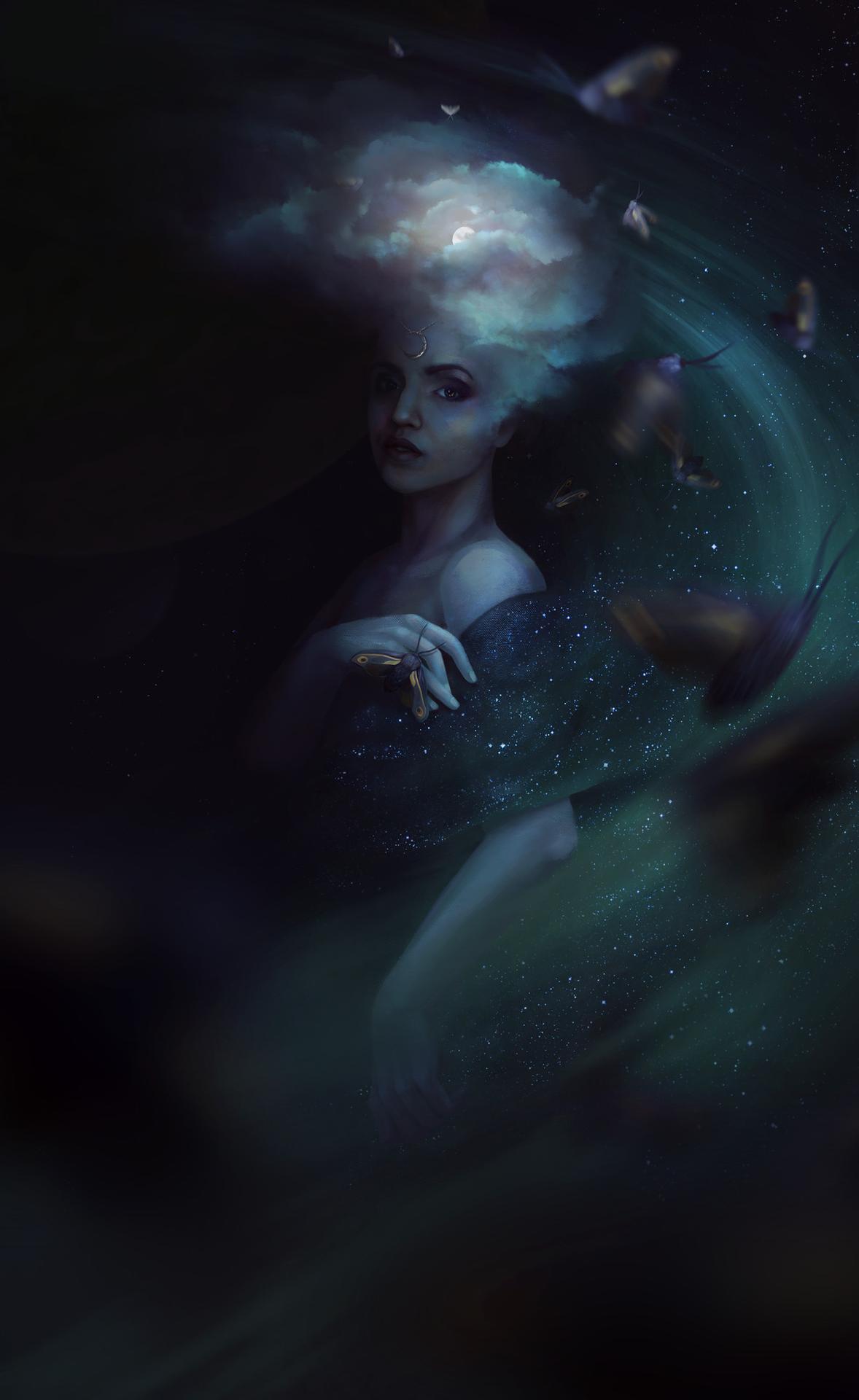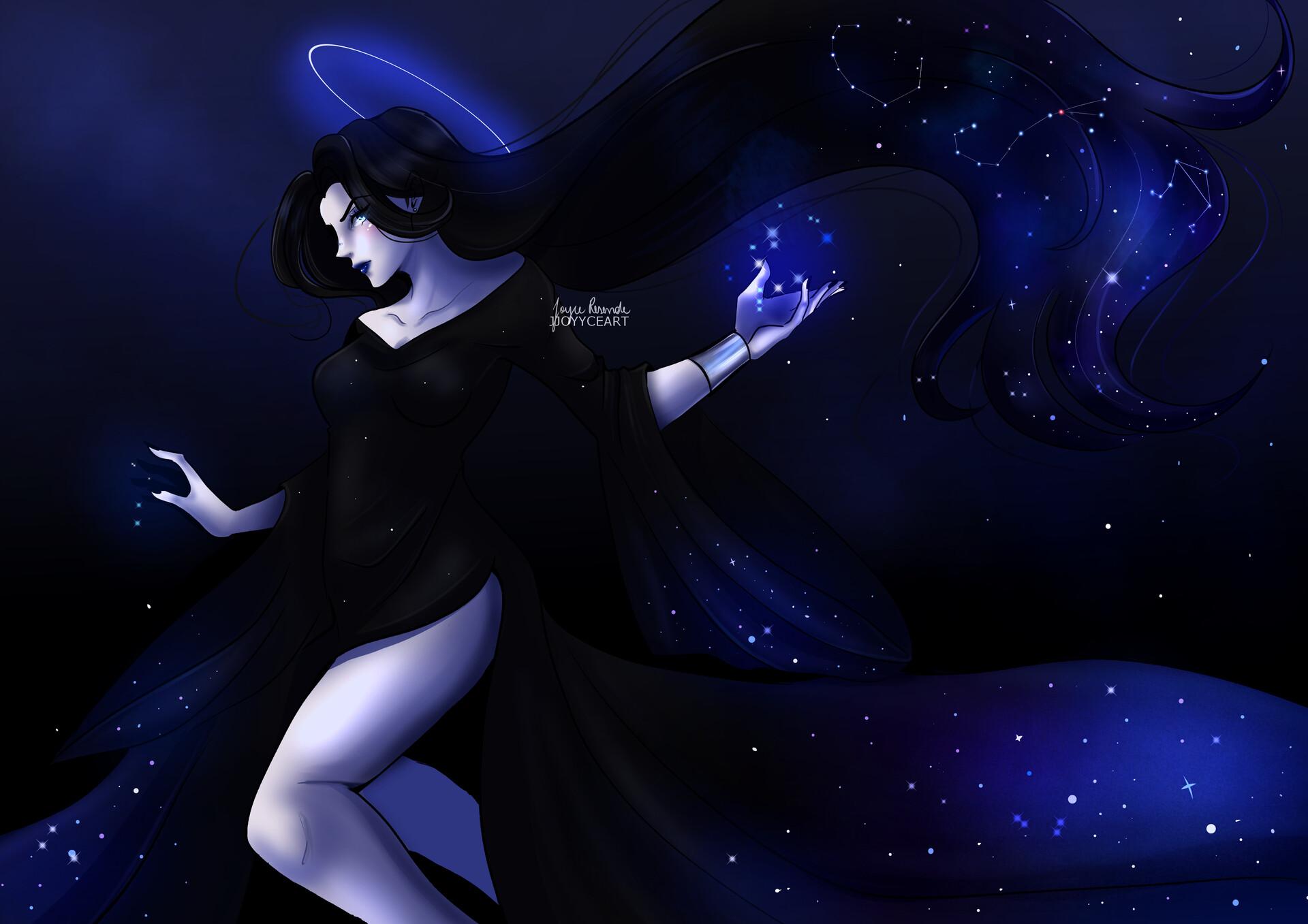 Никс - древнегреческая богиня ночи, мать всех снов и тайн, воплощающая одновременно покой и неизведанные глубины. В этих иллюстрациях она показана в различных ипостасях - от величественной богини до таинственной ночной странницы. Художники используют темную палитру - глубокие синие, фиолетовые, черные тона, - и звездные элементы. Особенно впечатляют сцены с ее детьми - Гипносом, Танатосом, Морфеем, - и взаимодействием с лунным светом. Каждая иллюстрация передает атмосферу ночной магии и уважение к темным аспектам жизни.