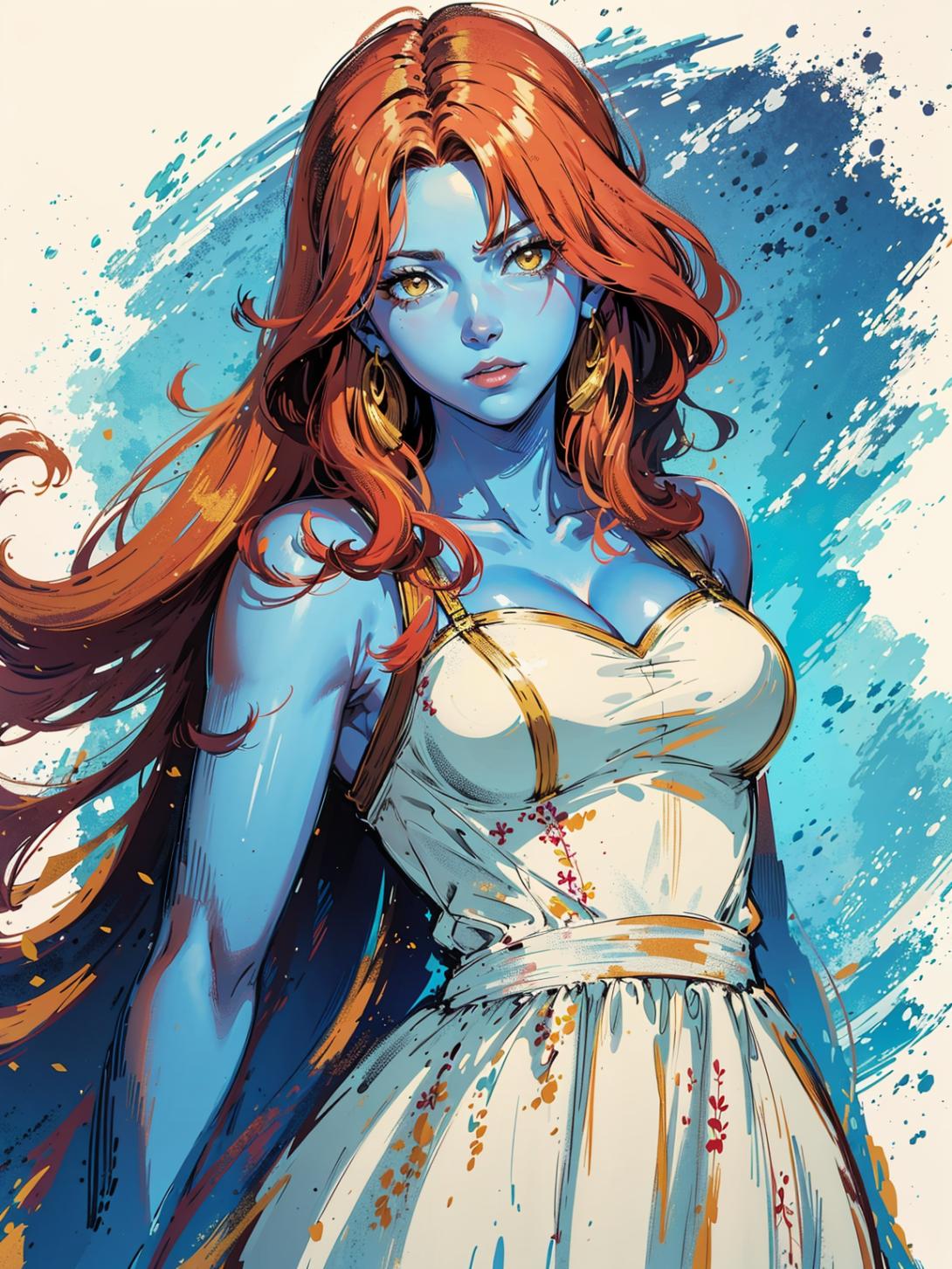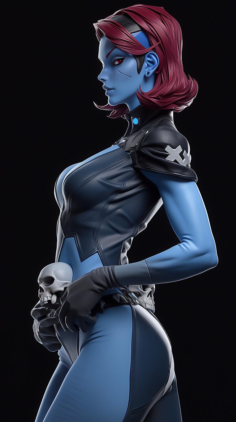 Синяя женщина предстает как могучая мутантка с синим цветом кожи и телекинетическими способностями. Ее костюм подчеркивает силу. В этих иллюстрациях она показана в различных позах: от размышлений до битв. Ее глаза выражают решимость. Художники мастерски передают атмосферу супергеройства. Она становится символом женской силы и интеллекта.