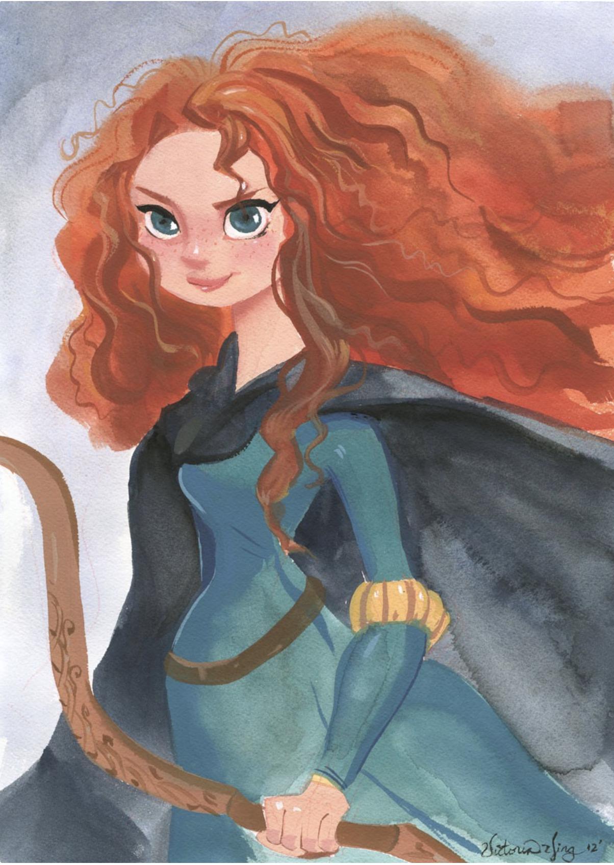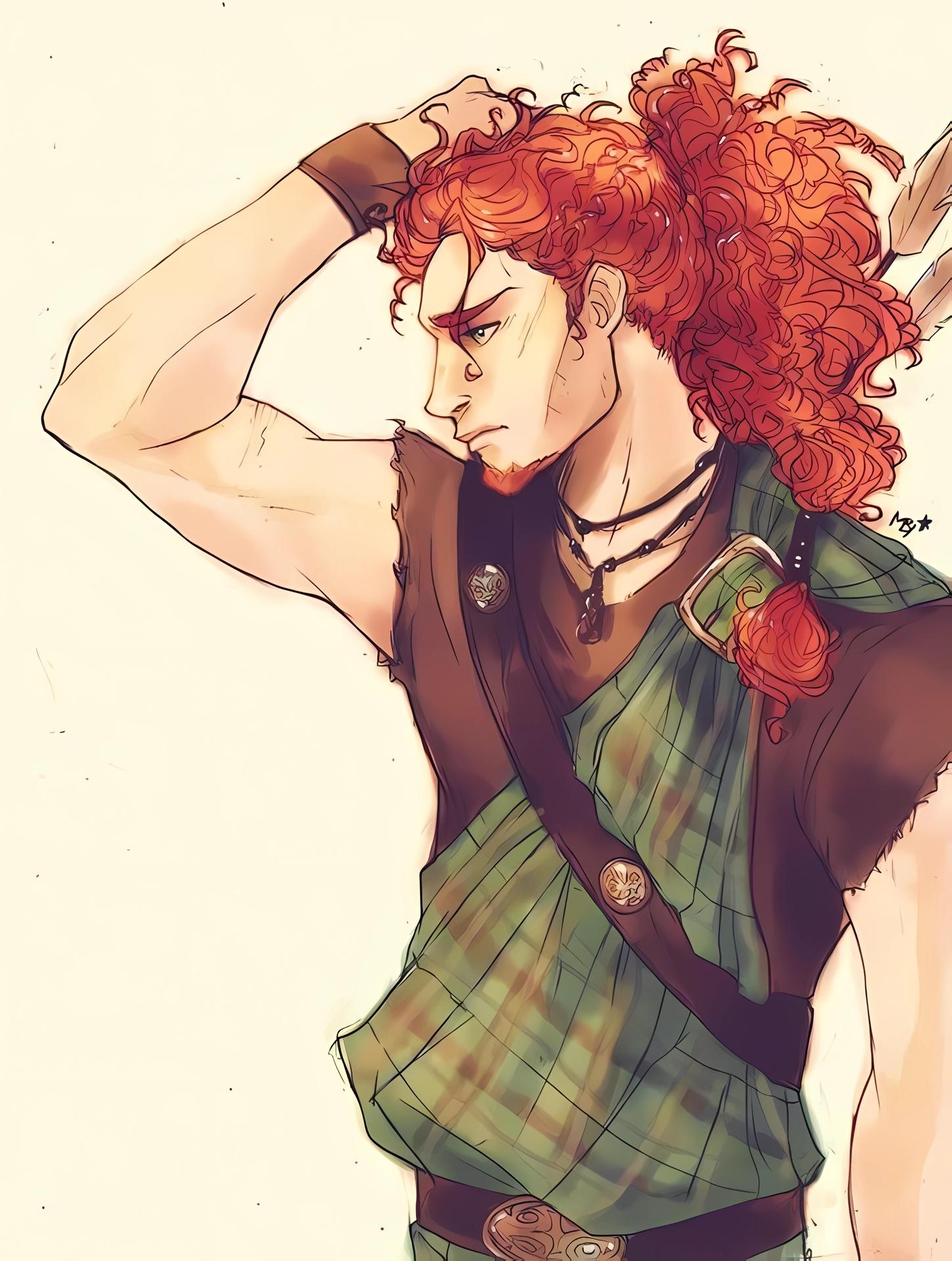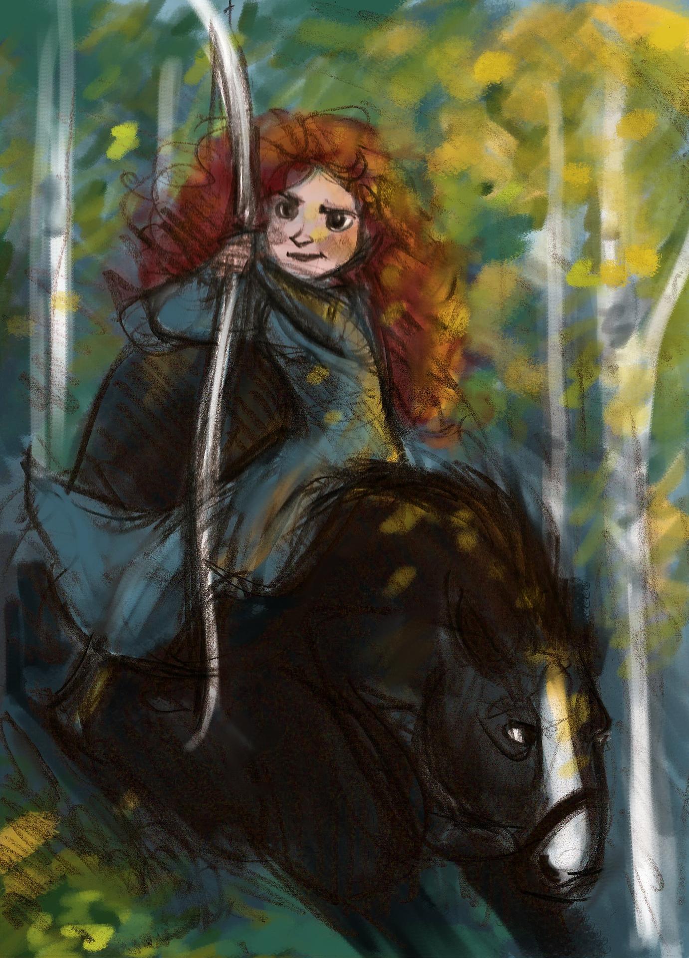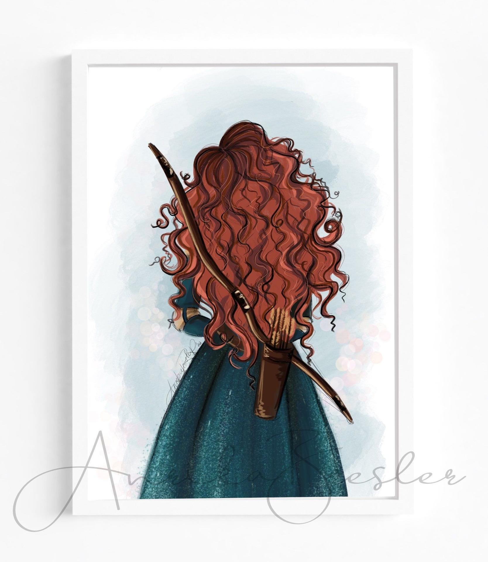Мерида Храбрая предстает в этой иллюстрации как независимая и отважная принцесса. Ее образ сочетает женскую грацию с воинственным духом, создавая атмосферу приключений. Художник передал движение и решимость через позу и аксессуары. Композиция идеальна для тем феминизма, приключений и самопознания. Арт выполнен в динамичном стиле с природными мотивами. Мерида символизирует силу женской воли.