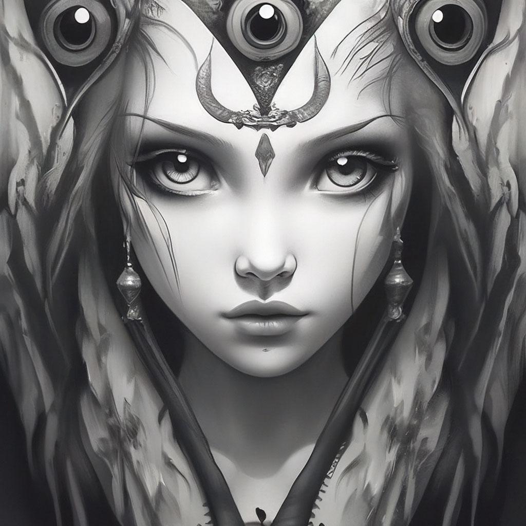 Девушка с тремя глазами - это не просто персонаж фэнтези, а живое воплощение единства красоты и таинственности, наделенное разумом и волей. Ее внешность завораживает и восхищает, создавая образ, который невозможно забыть. Три глаза девушки - это не просто органы зрения, а продолжение ее сущности, которое подчеркивает ее таинственность и характер. Каждый элемент одежды говорит о внимании к деталям и чувстве стиля. Длинные волосы струятся по плечам, словно шелковые нити, а кожа имеет нежный, почти фарфоровый оттенок. Каждый жест девушки исполнен грации и силы, а в воздухе вокруг нее постоянно мерцают искры таинственной энергии. Фон может быть любым - от мистических миров до городских улиц, но везде она выглядит органично и естественно. Девушка с тремя глазами олицетворяет собой единство красоты и таинственности, мистичность, которая не нуждается в словах. В ее образе нет ничего показного или театрального - только искренность и чувство собственного достоинства.