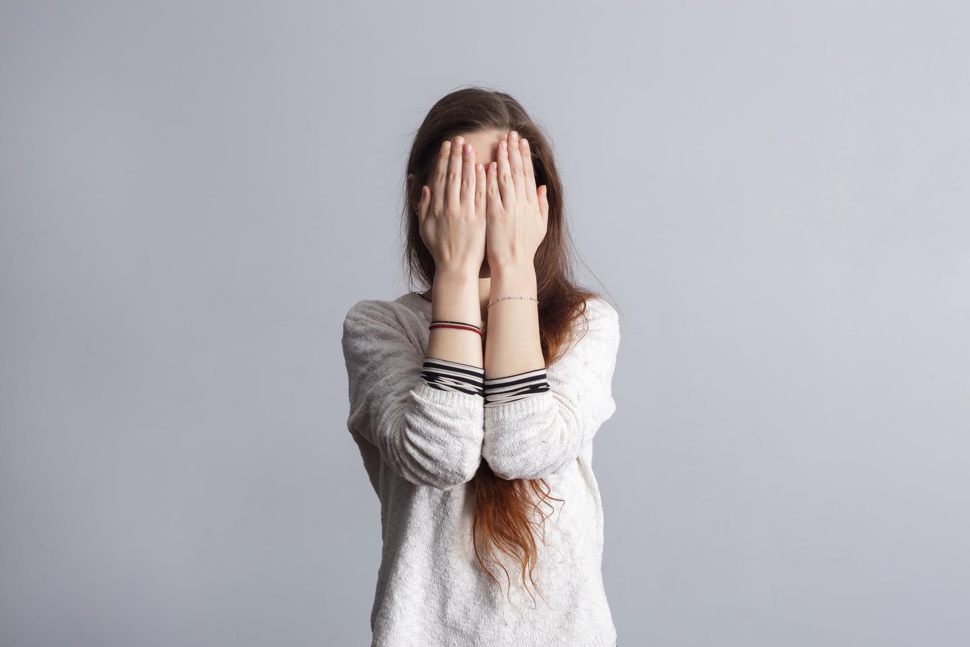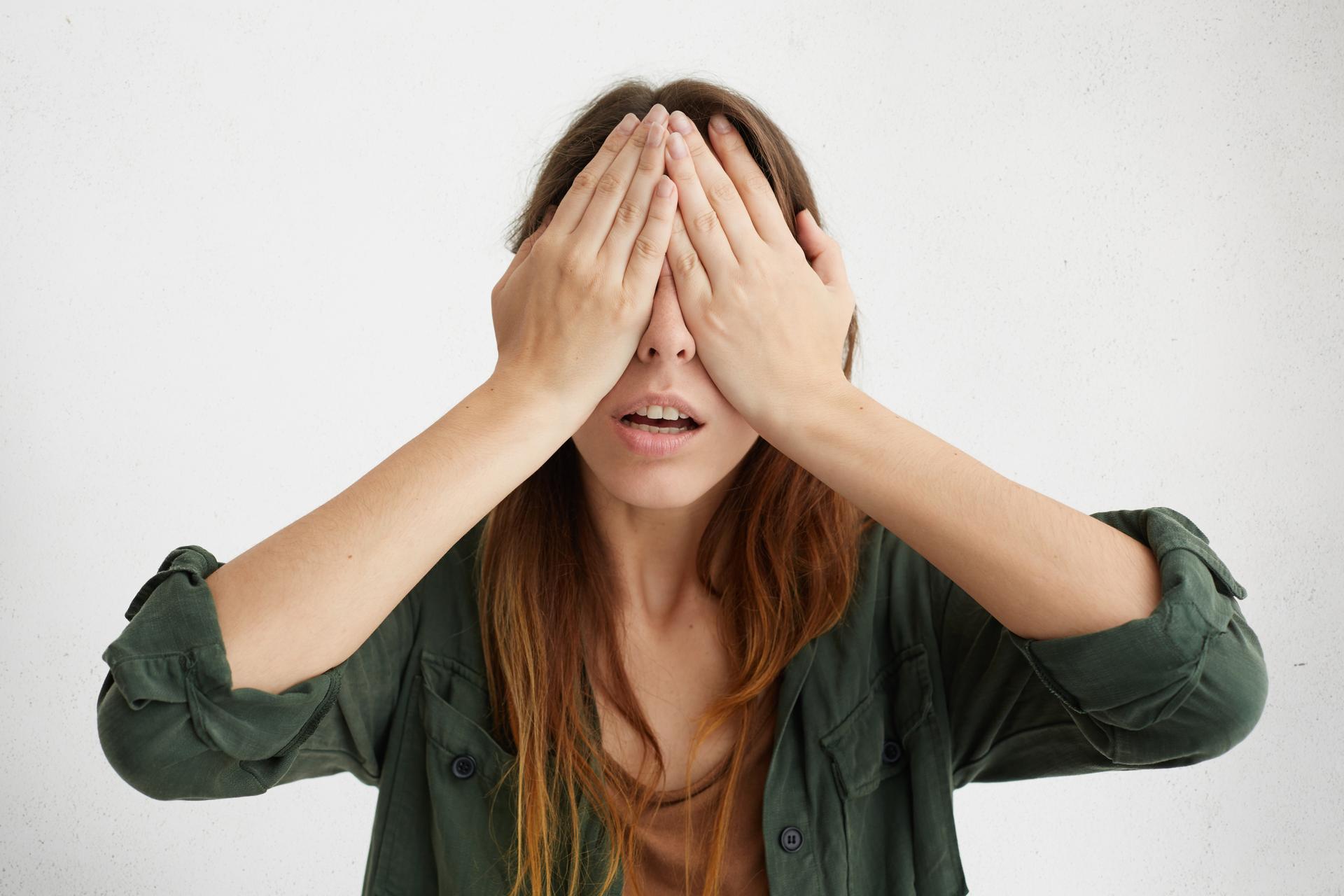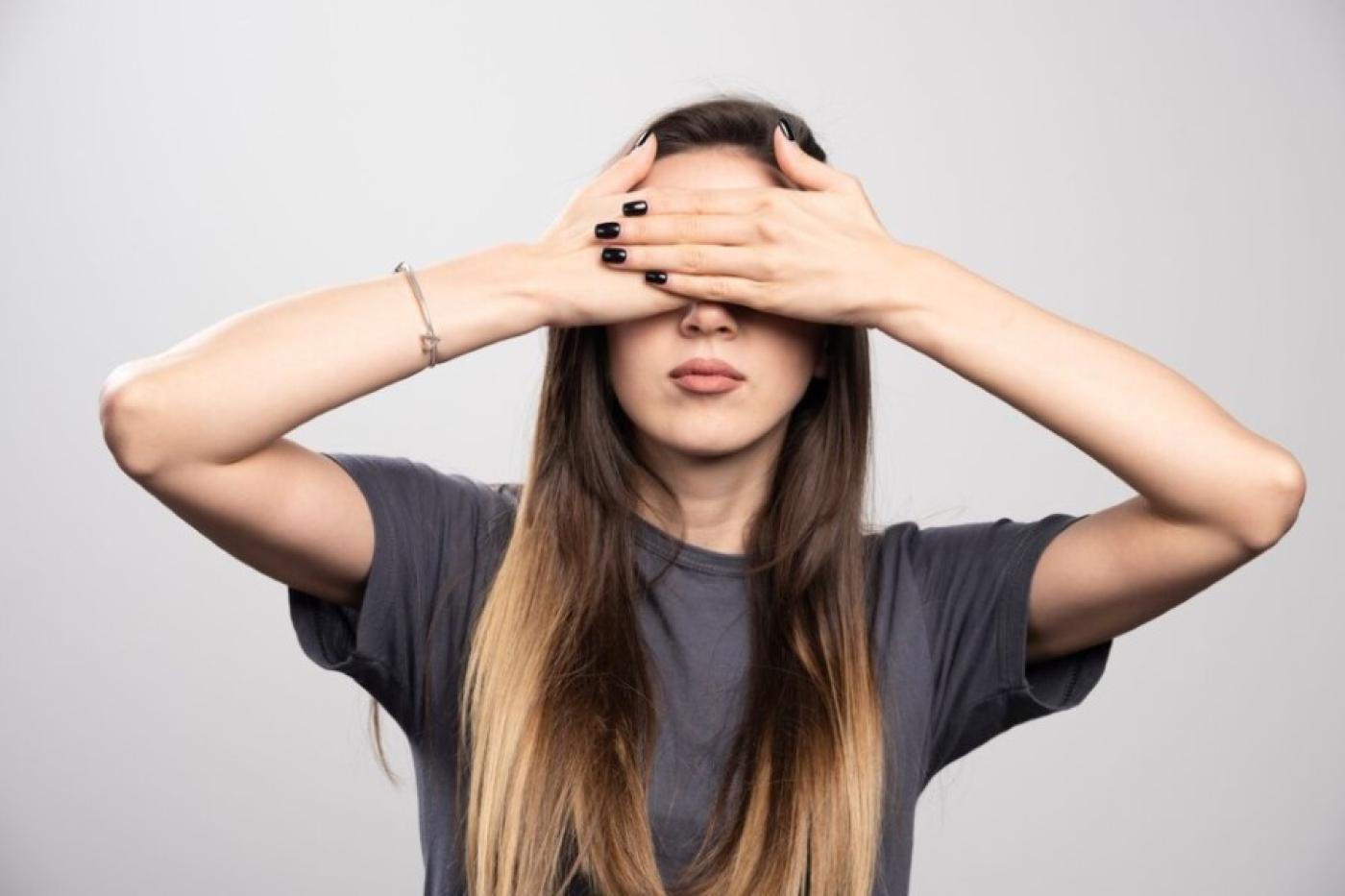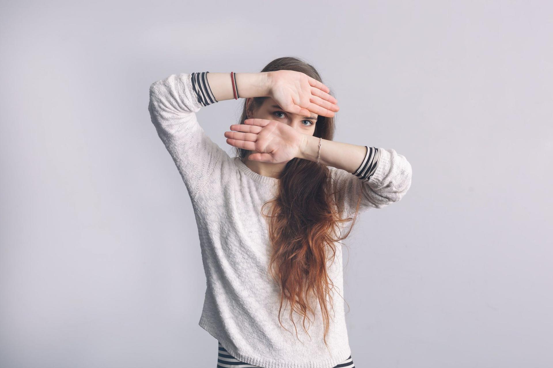 Девушка закрыла глаза Девушка прикрывает лицо Девушка закрыла глаза Закрыть глаза руками Портретная фотография Девушки