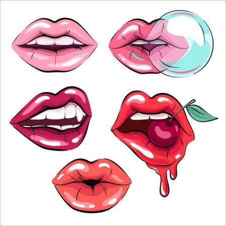 Губы в иллюстрациях становятся фокусом внимания как символ коммуникации, эмоций и чувственности. Художники детально прорабатывают формы, текстуры и цвета губ, подчеркивая их роль в выражении чувств и характера человека. Каждая композиция исследует темы невербального общения, привлекательности и индивидуальности. Иллюстрации часто используют крупные планы и акценты на текстурах, создавая атмосферу интимности. Эти изображения становятся способом выразить сложные эмоции через минималистичные, но красноречивые формы.