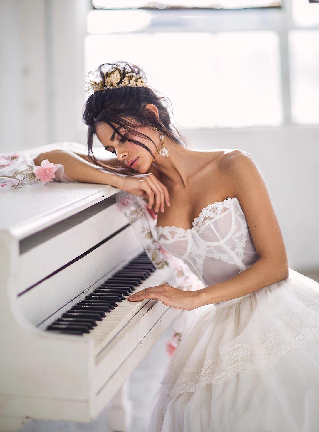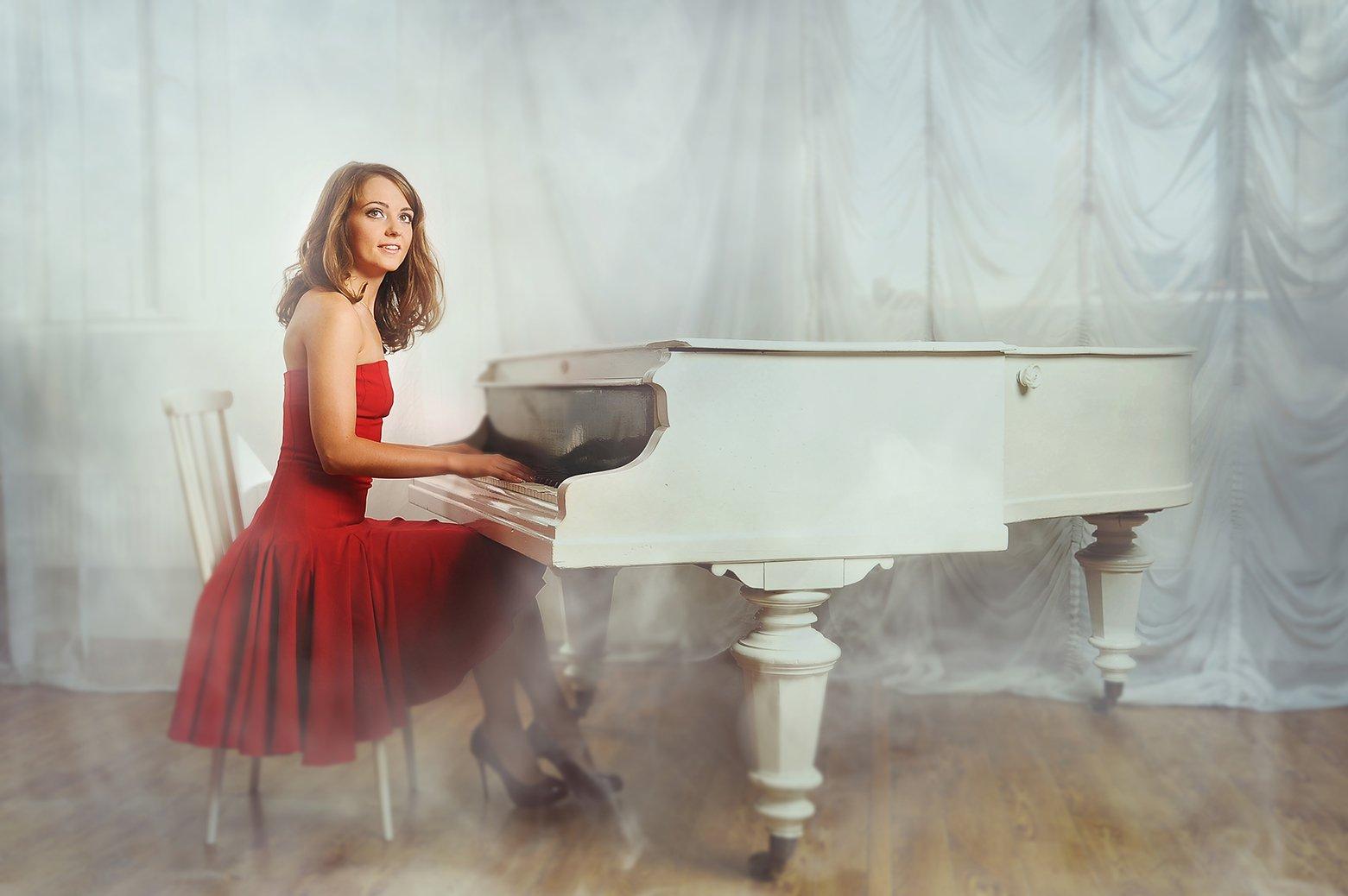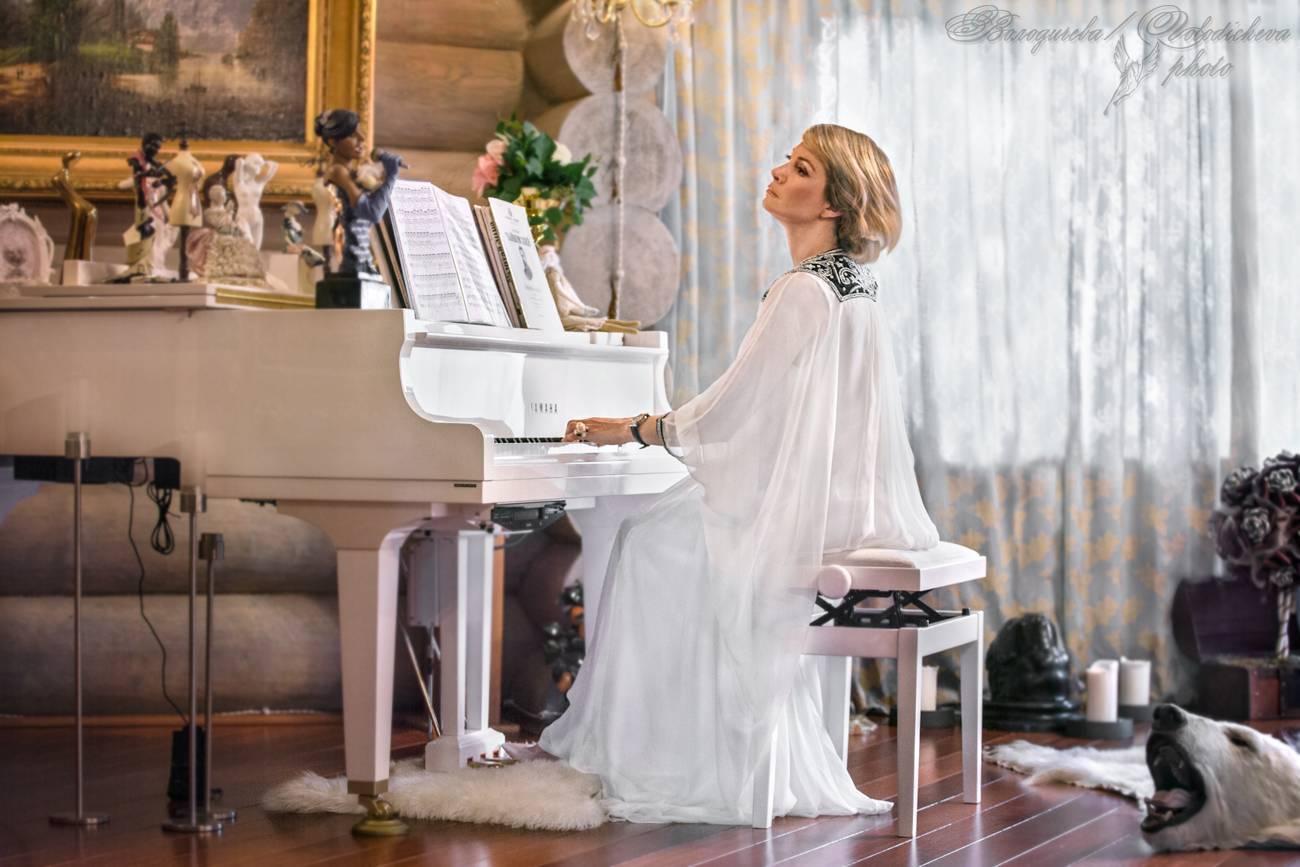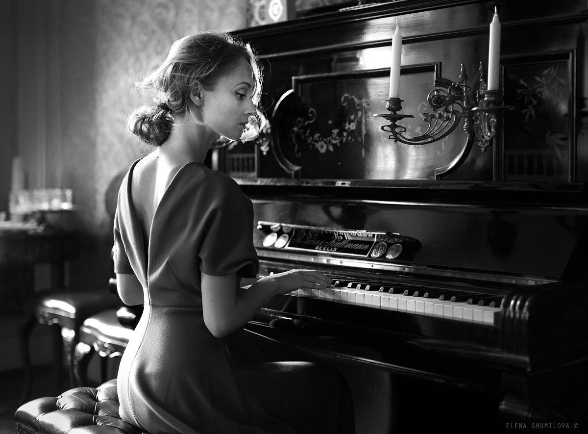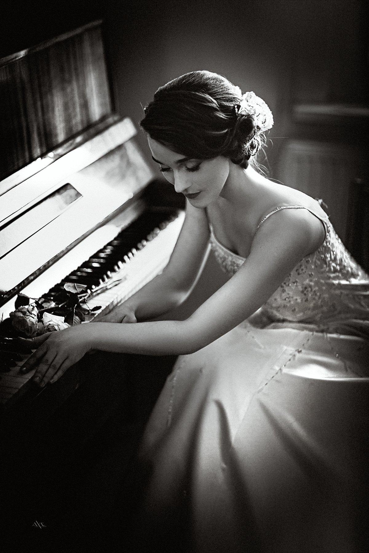 Музыкальная серия фотографий представляет девушек за роялями в различных эмоциональных состояниях. Модели в элегантных нарядах демонстрируют связь между музыкой и женственностью. Фотографии запечатлевают моменты игры, задумчивости и вдохновения. Черно-белые и цветные композиции передают атмосферу концертных залов и домашних музыкальных комнат. Акцент на руках, позах и выражении лиц. Освещение создает драматические тени и блики на поверхности инструментов. Некоторые работы включают ноты и музыкальные аксессуары. Коллекция показывает, как музыка может стать источником вдохновения для создания поэтичных образов.