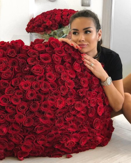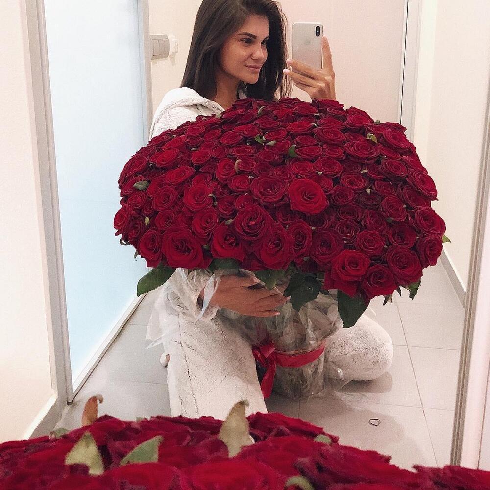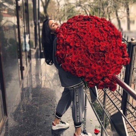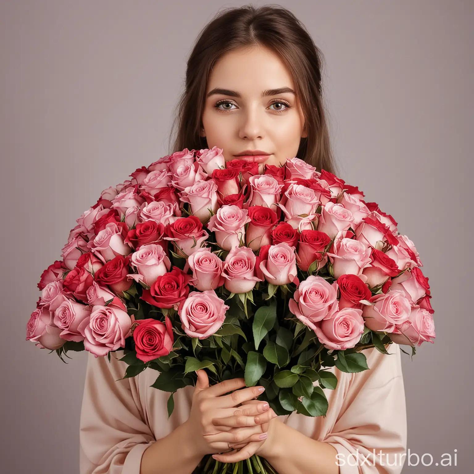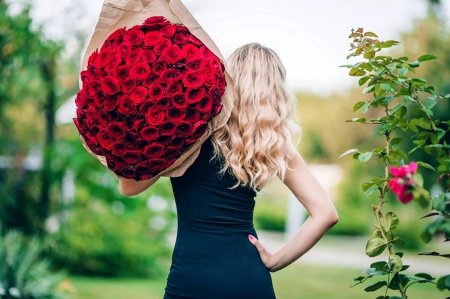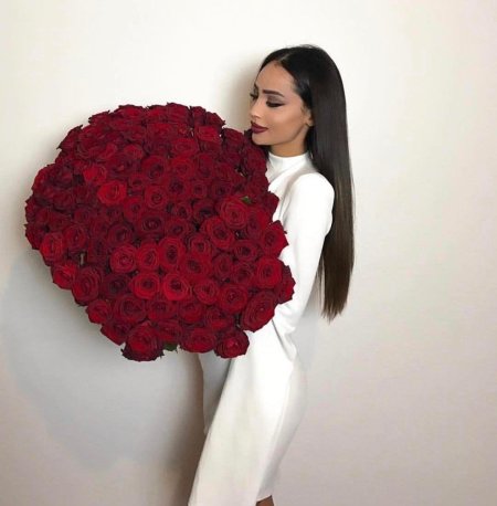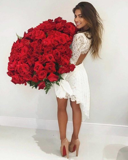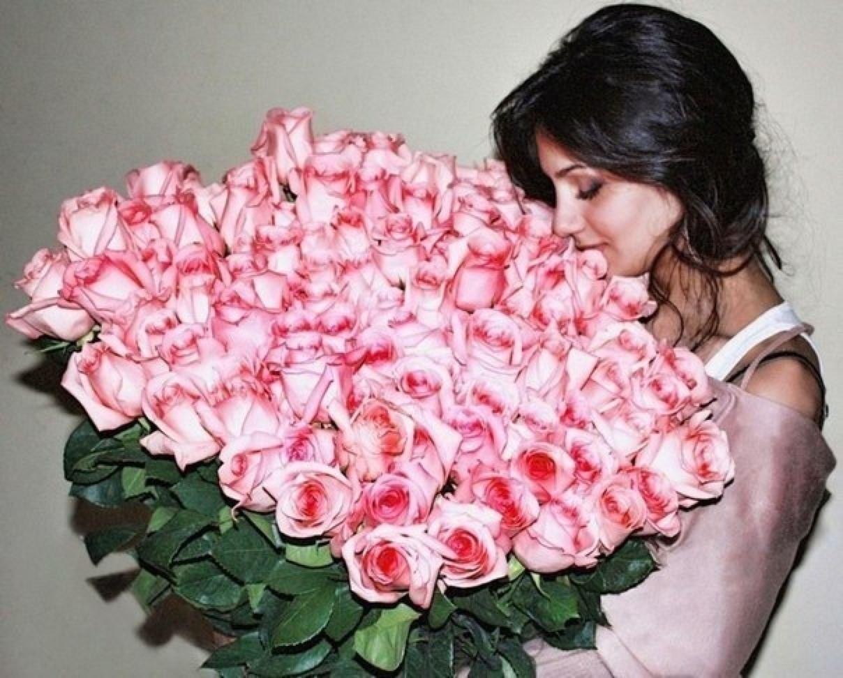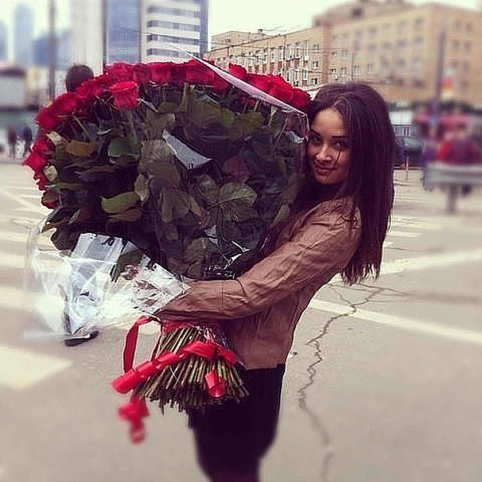 Девушка с огромным букетом роз